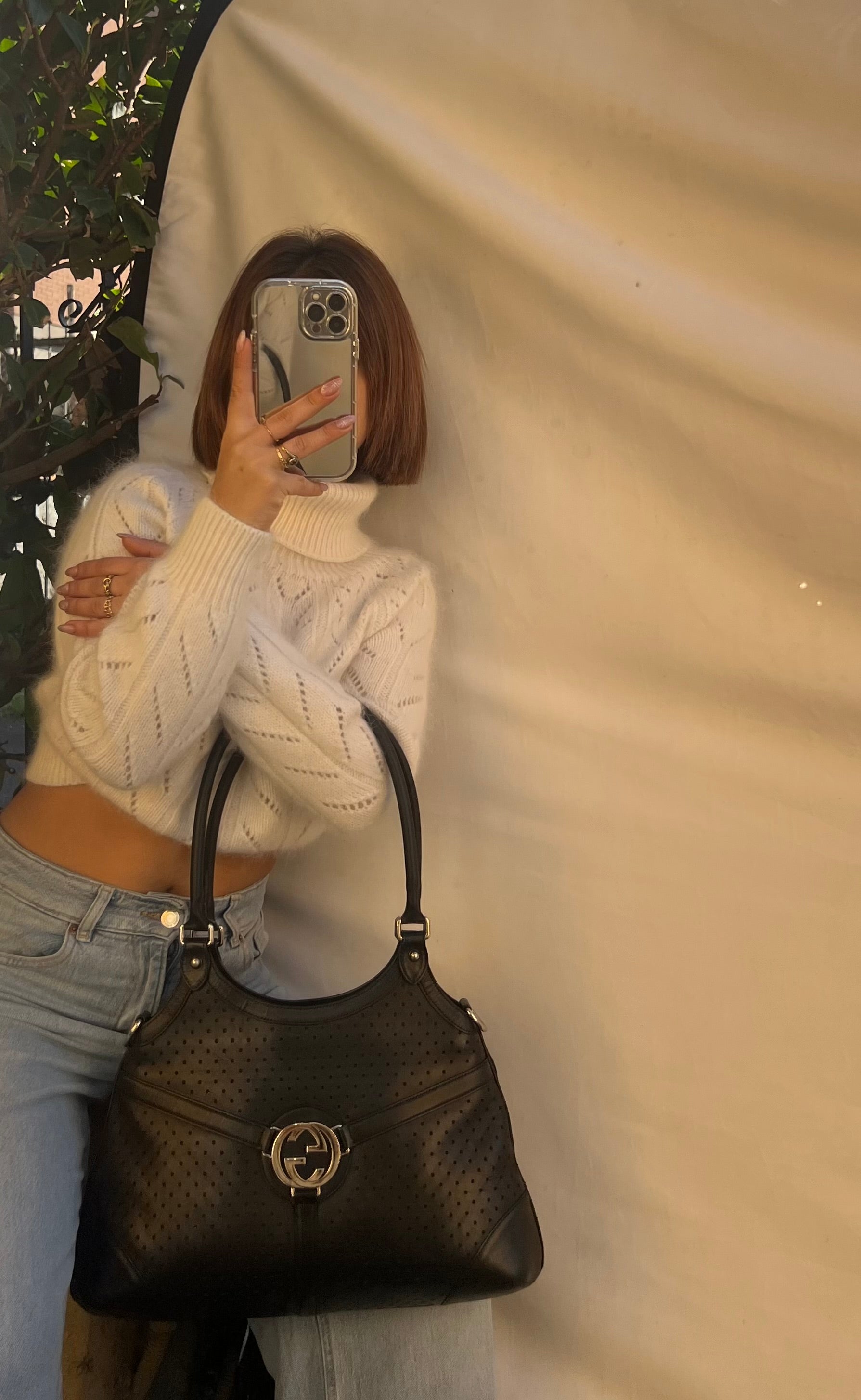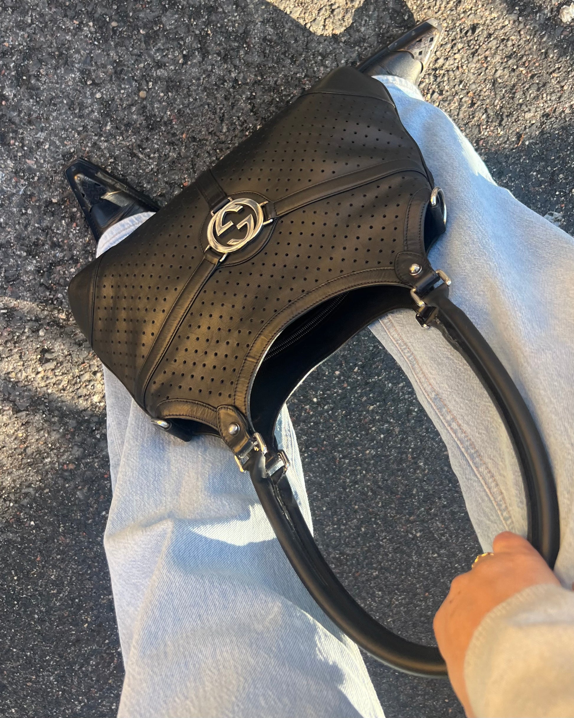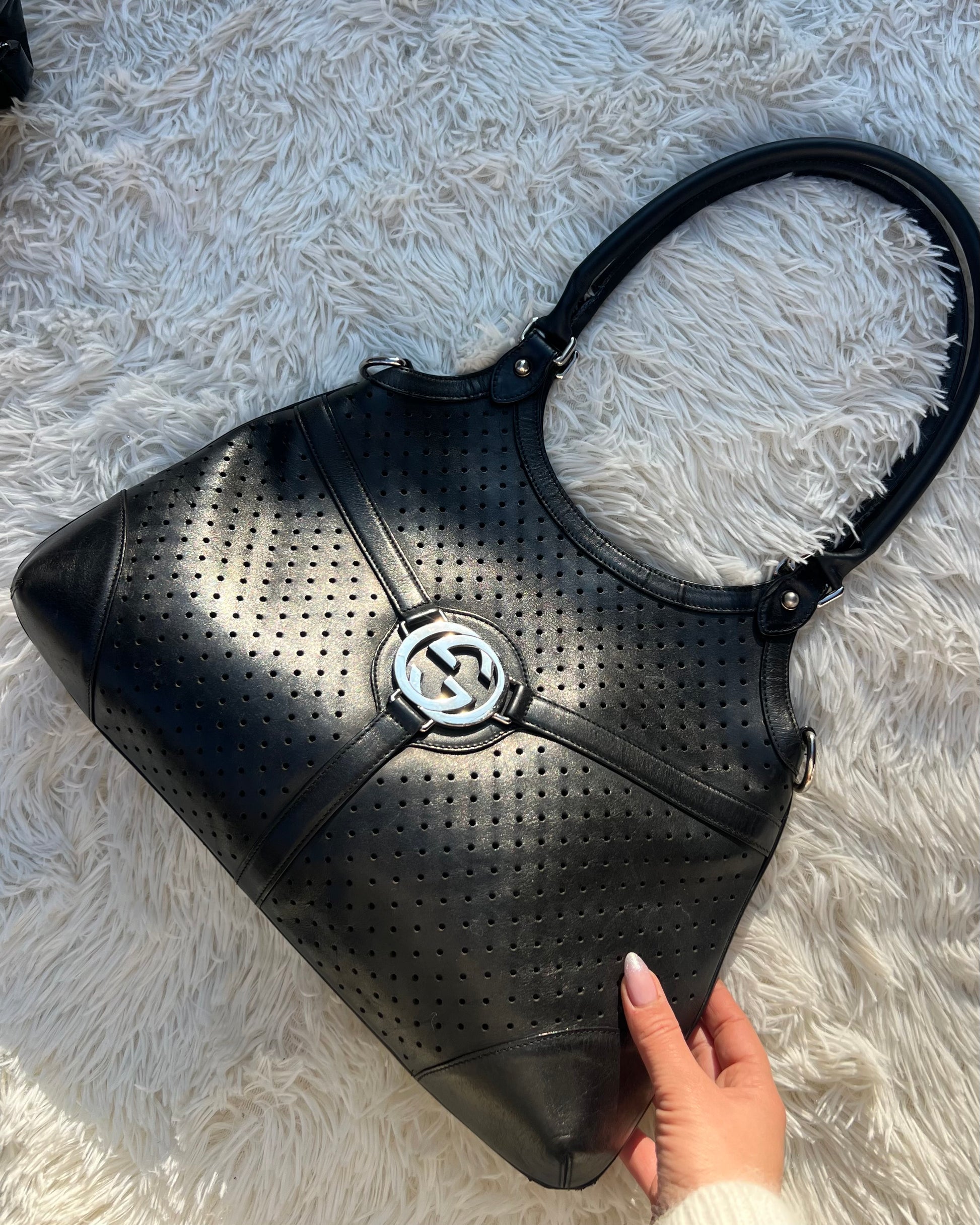 Iconica e senza tempo, questa borsa Gucci in pelle nera si distingue per la sua linea pulita ed essenziale, impreziosita dal logo centrale in metallo e da hardware color argento che aggiungono un tocco moderno e raffinato.