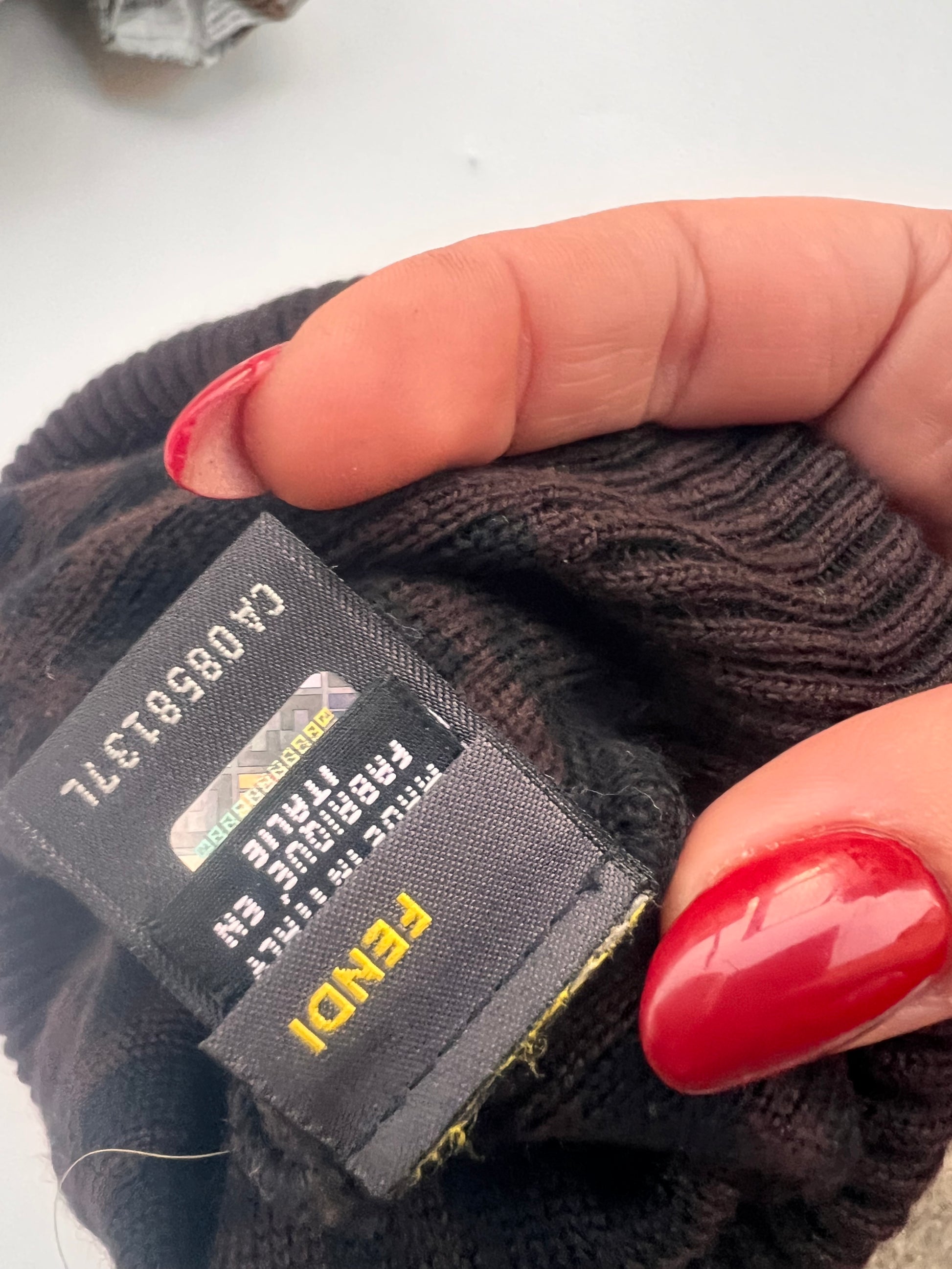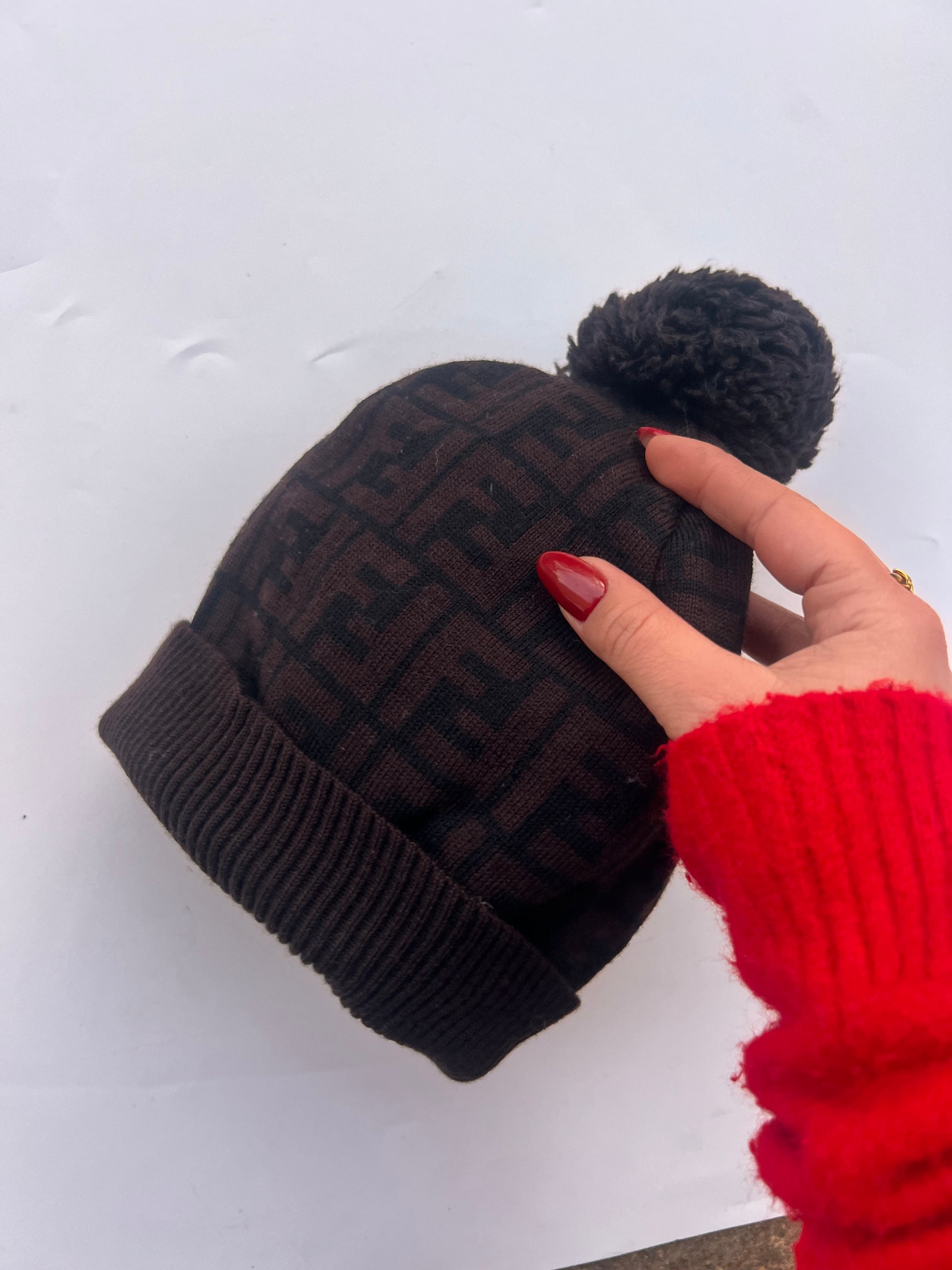 Cappello in lana Fendi con iconica fantasia Zucca, in una raffinata tonalità del marrone scuro . Realizzato con filato di alta qualità, offre calore e comfort senza rinunciare allo stile. Il design è impreziosito da un morbido pon-pon, che aggiunge un tocco giocoso e contemporaneo. Perfetto per completare i look invernali con eleganza e personalità, è un accessorio must-have per gli amanti del lusso e del brand Fendi.