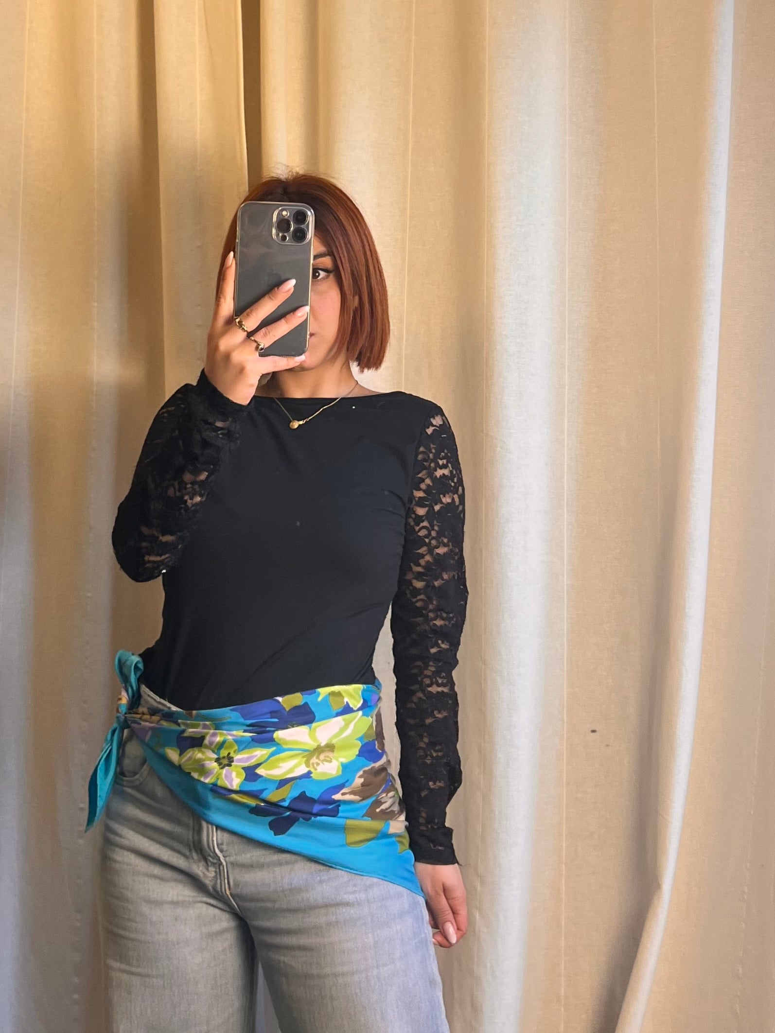 • Dettaglio in Vita: Annodato lateralmente sopra i jeans, aggiunge un tocco di colore inaspettato.