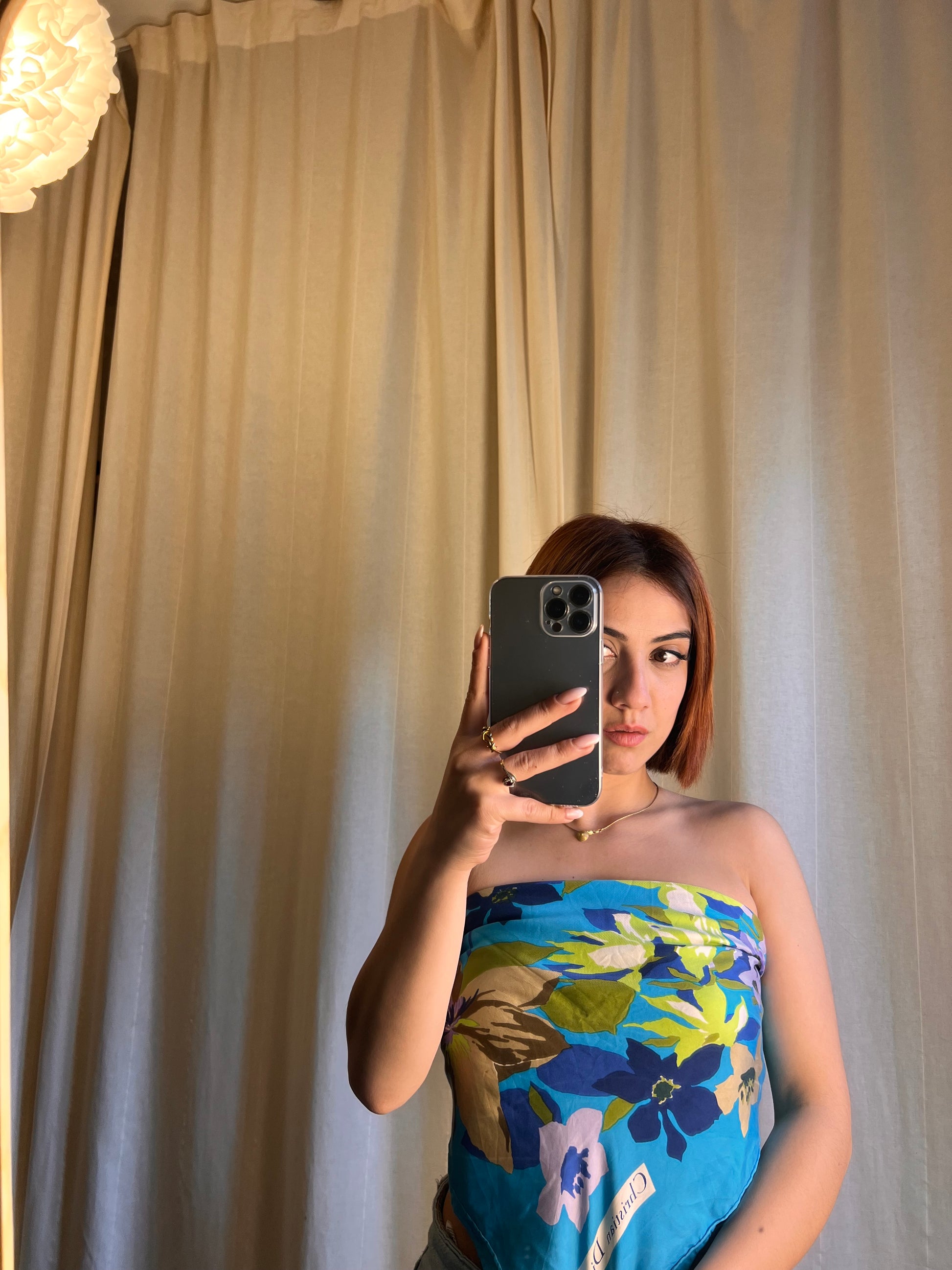 • Top a Fascia (Style Bandana): Come si vede nelle immagini, piegato a triangolo e annodato sulla schiena, diventa un top a fascia chic e audace, perfetto con jeans a vita alta.