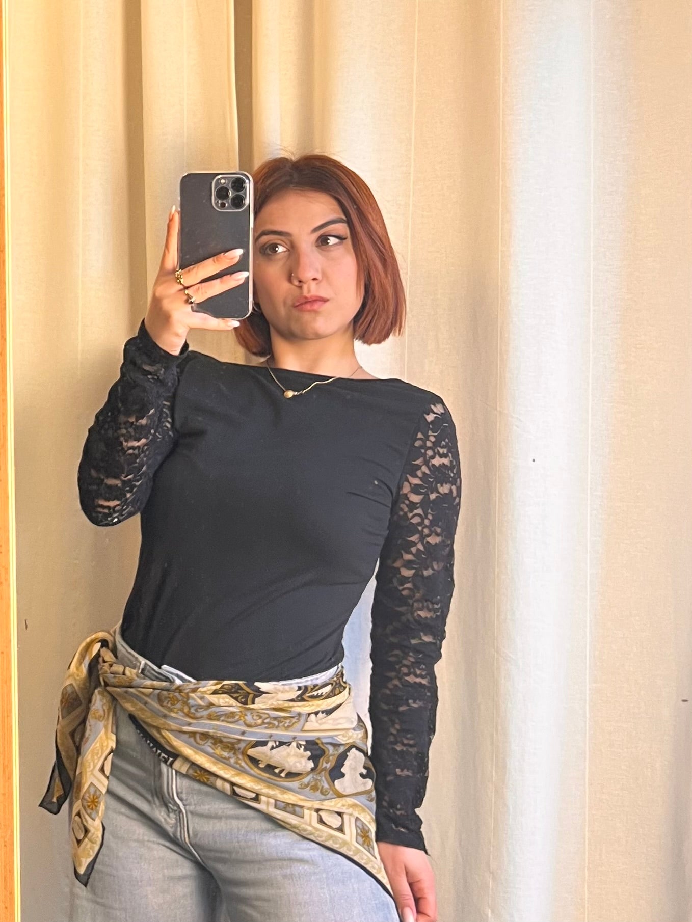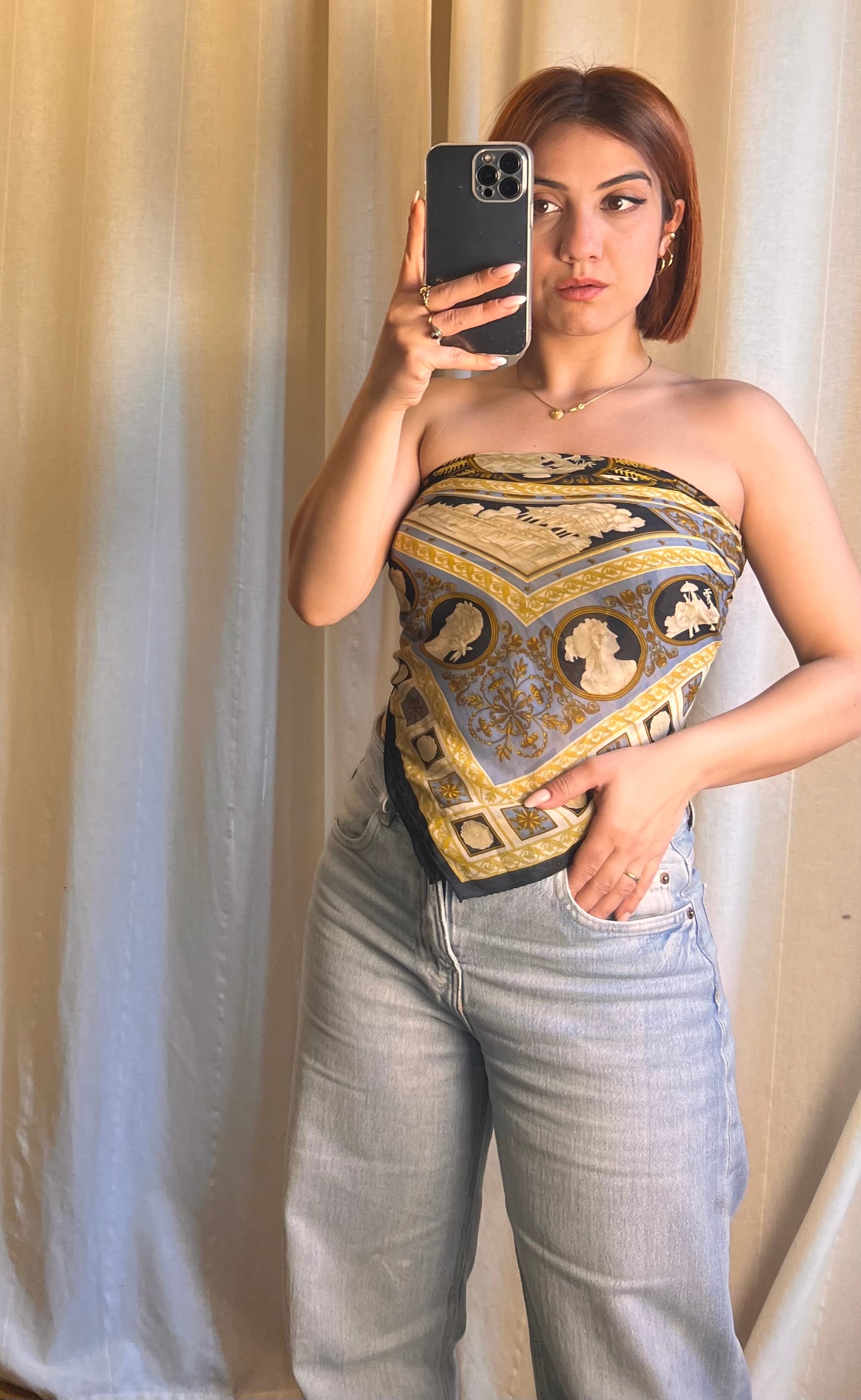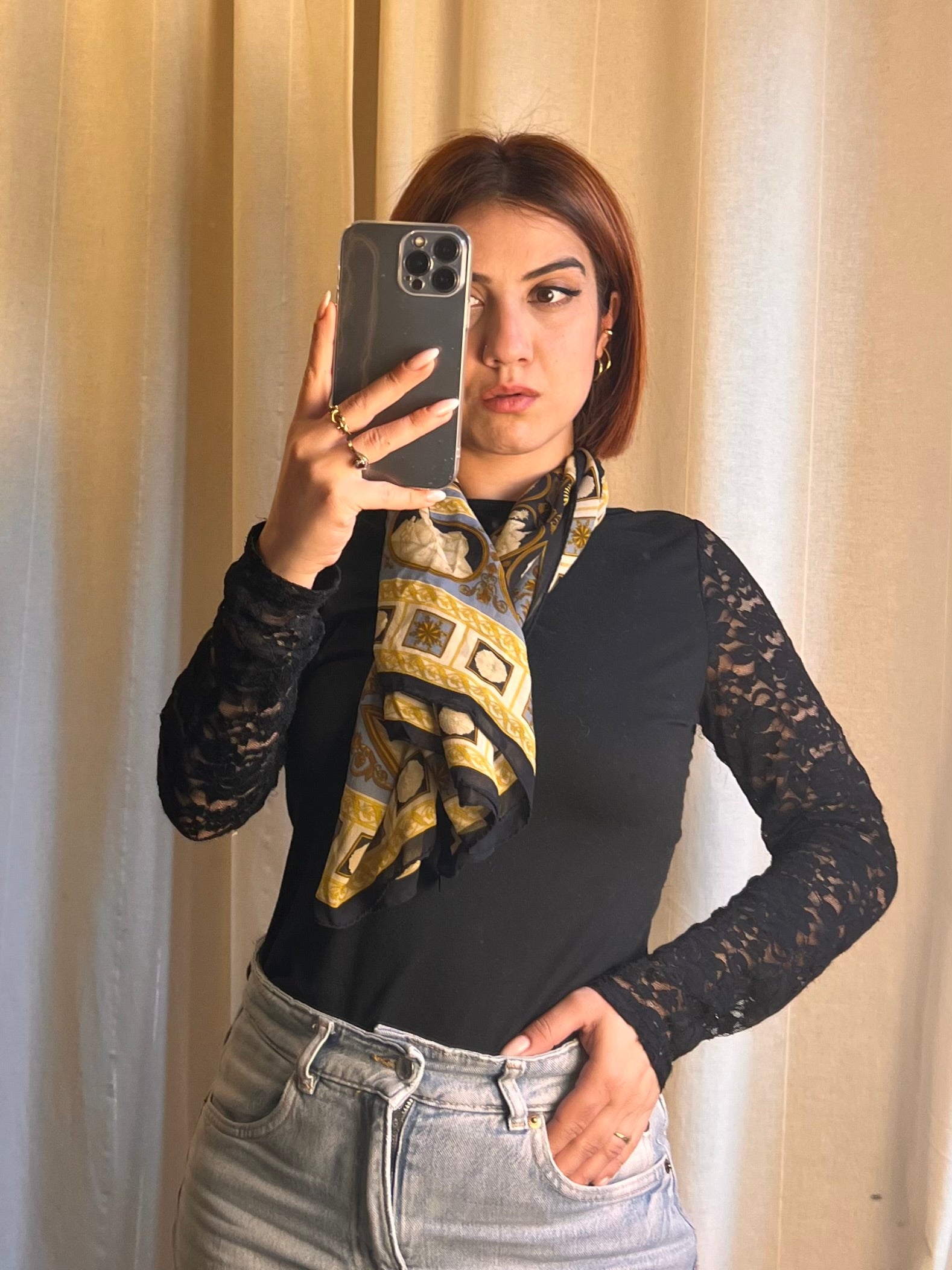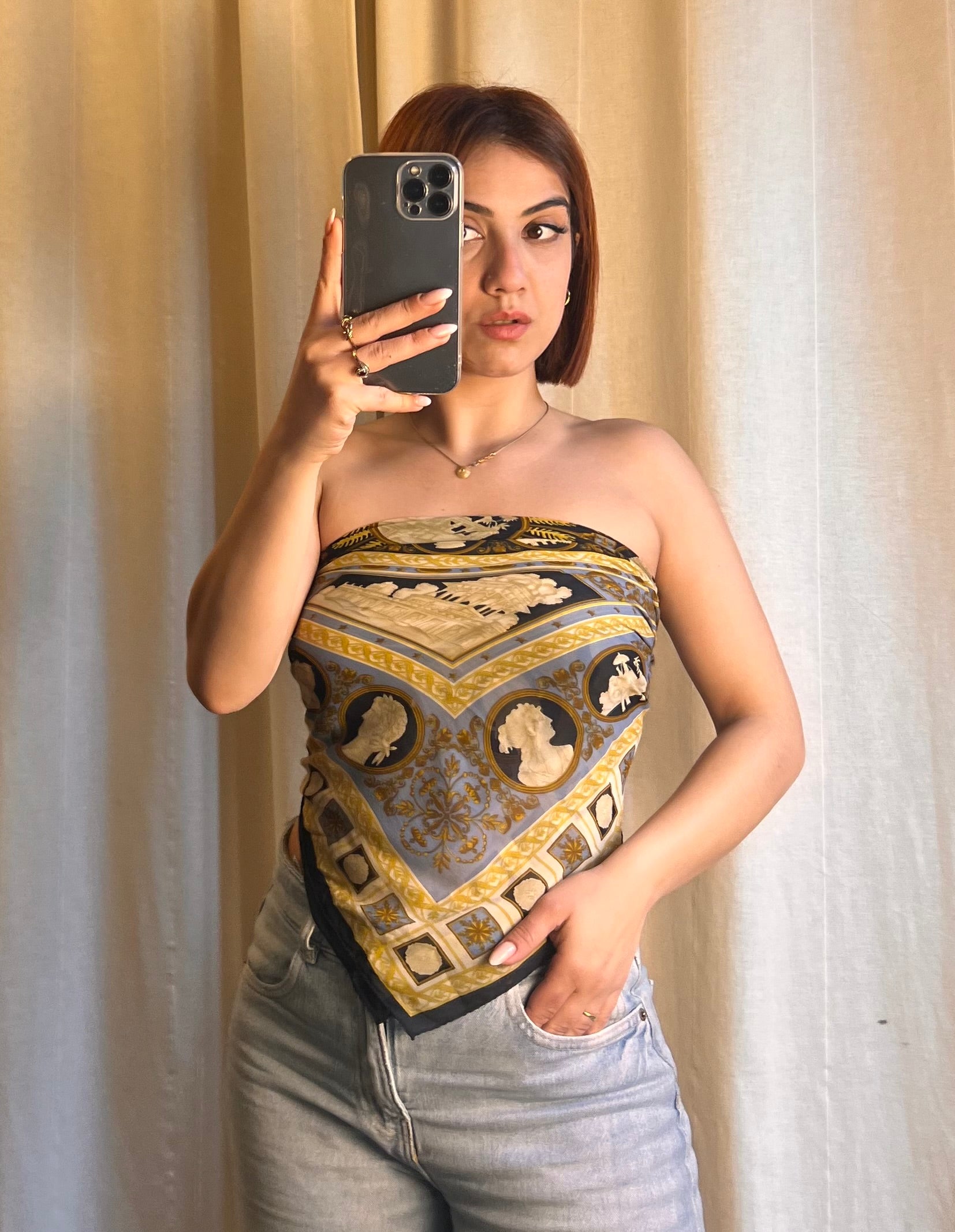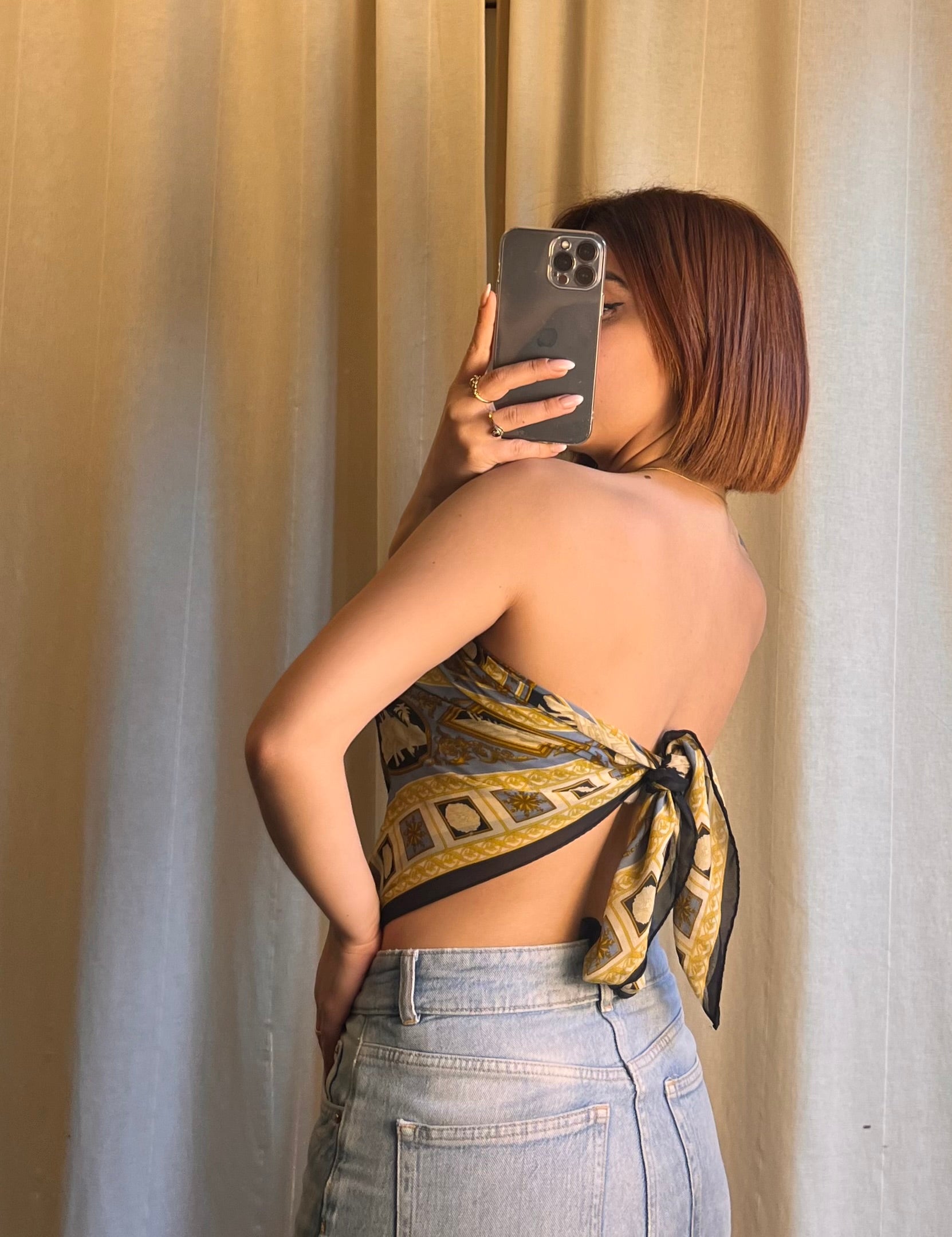 • Versatilità: Come mostrato nelle foto, le generose dimensioni permettono di indossarlo in molteplici modi: come top a fascia (stile bandana), annodato in vita sopra un jeans, come classico foulard al collo o come elegante copricapo.