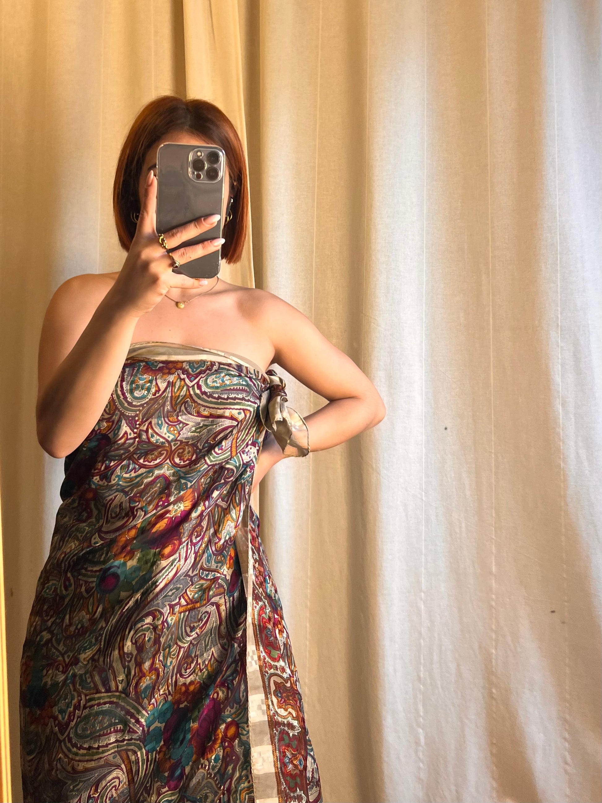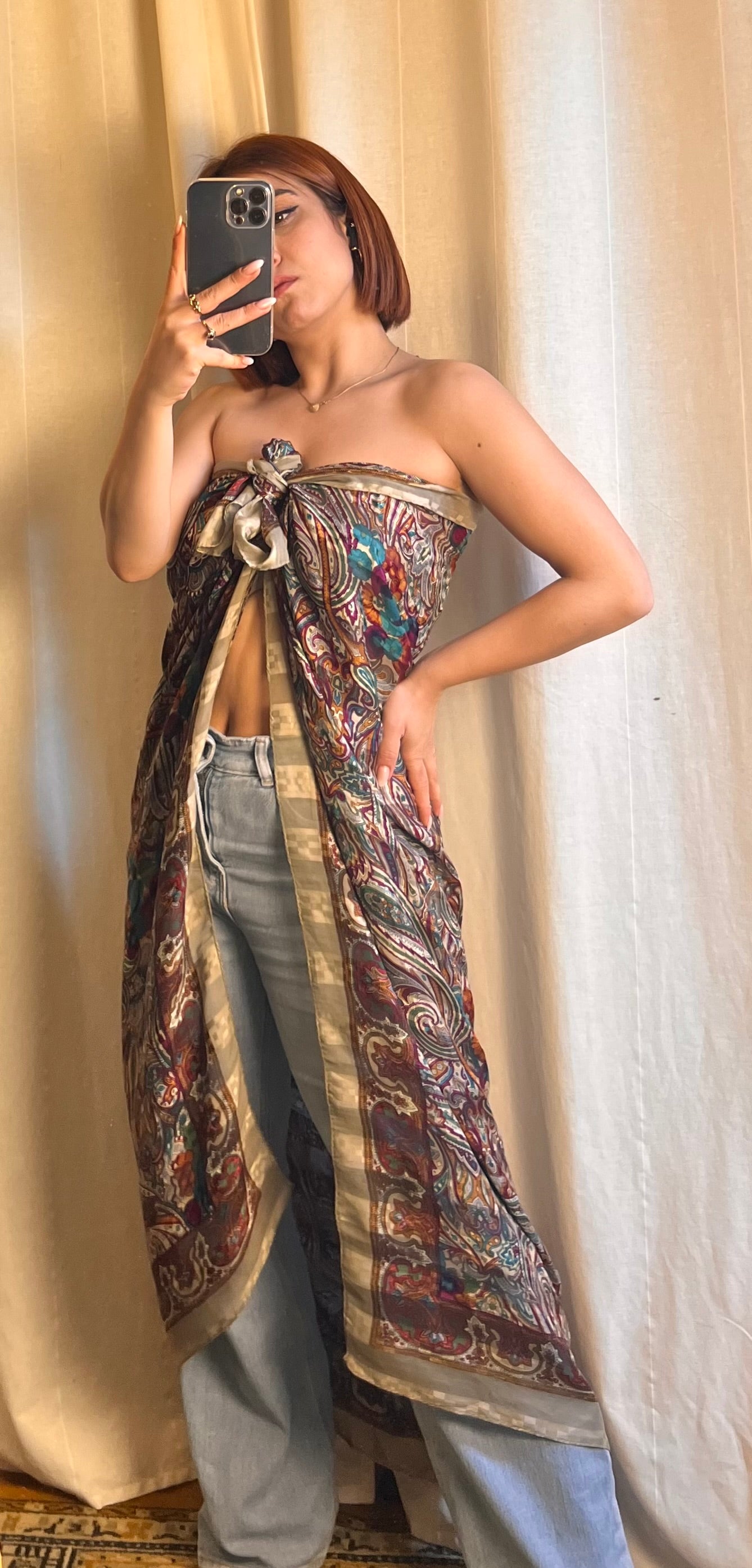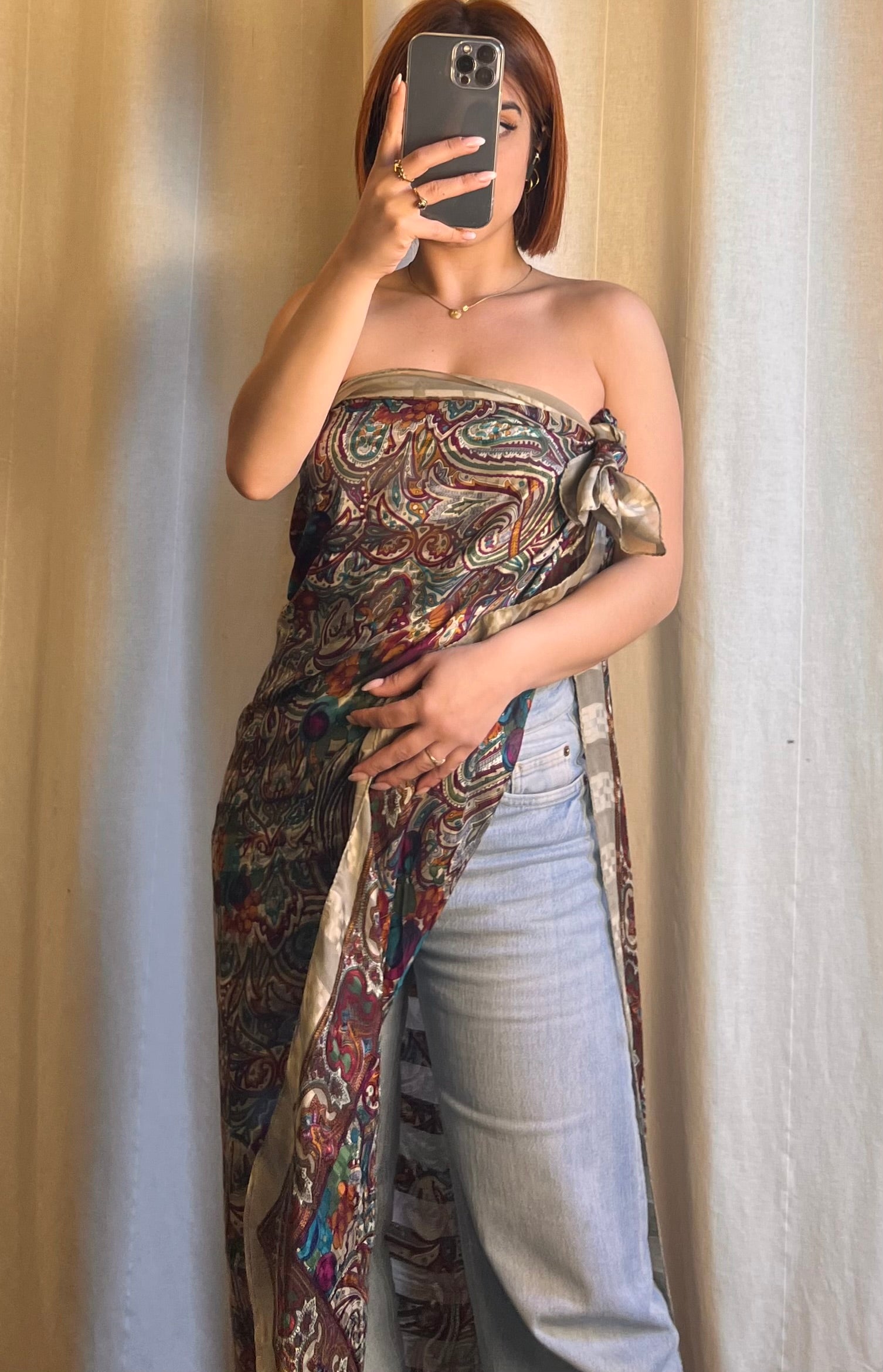• Top Scenografico: Grazie all'ampia metratura, può essere annodato come un top a fascia o incrociato (come mostrato nelle foto), perfetto per un look da sera o estivo.