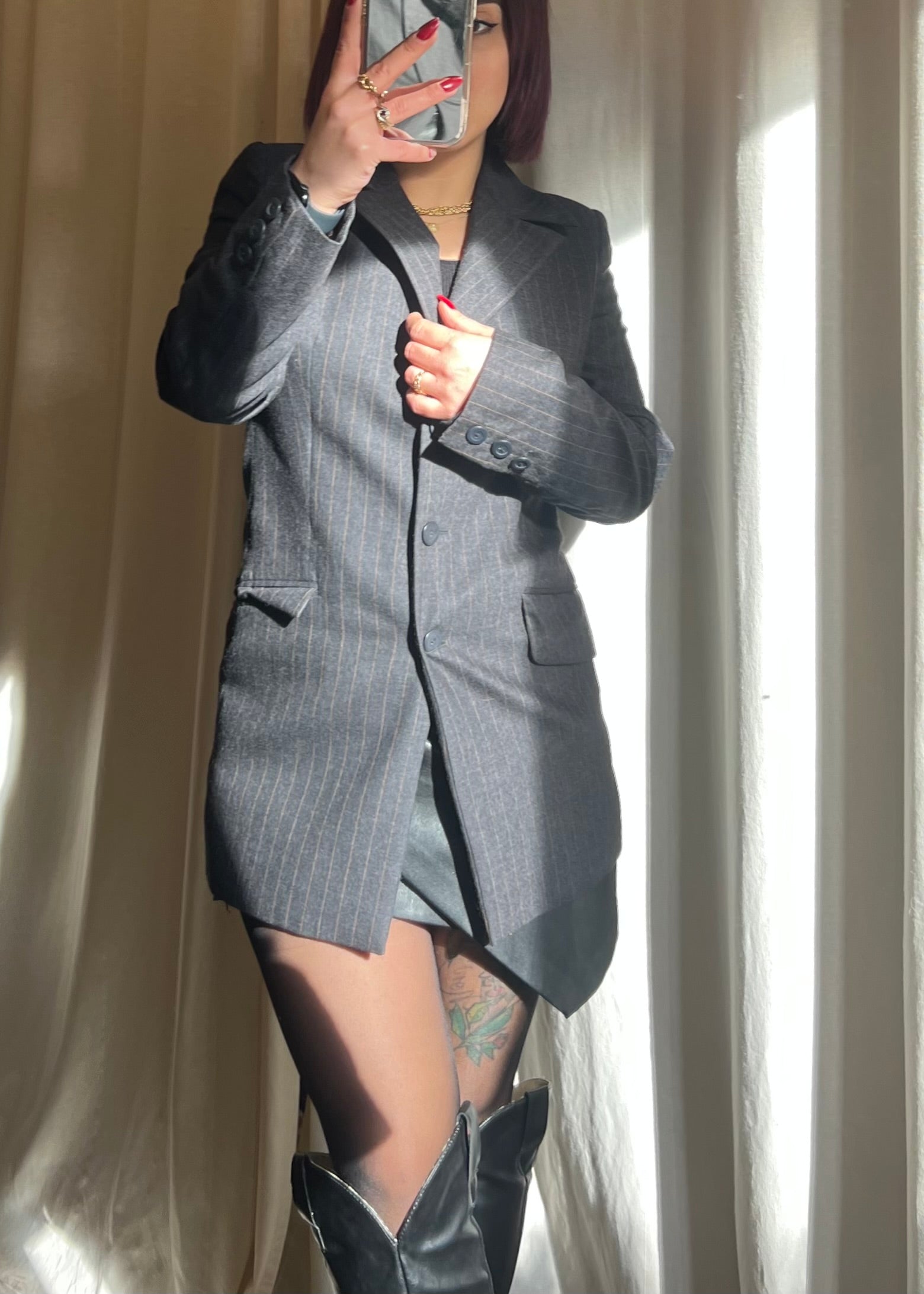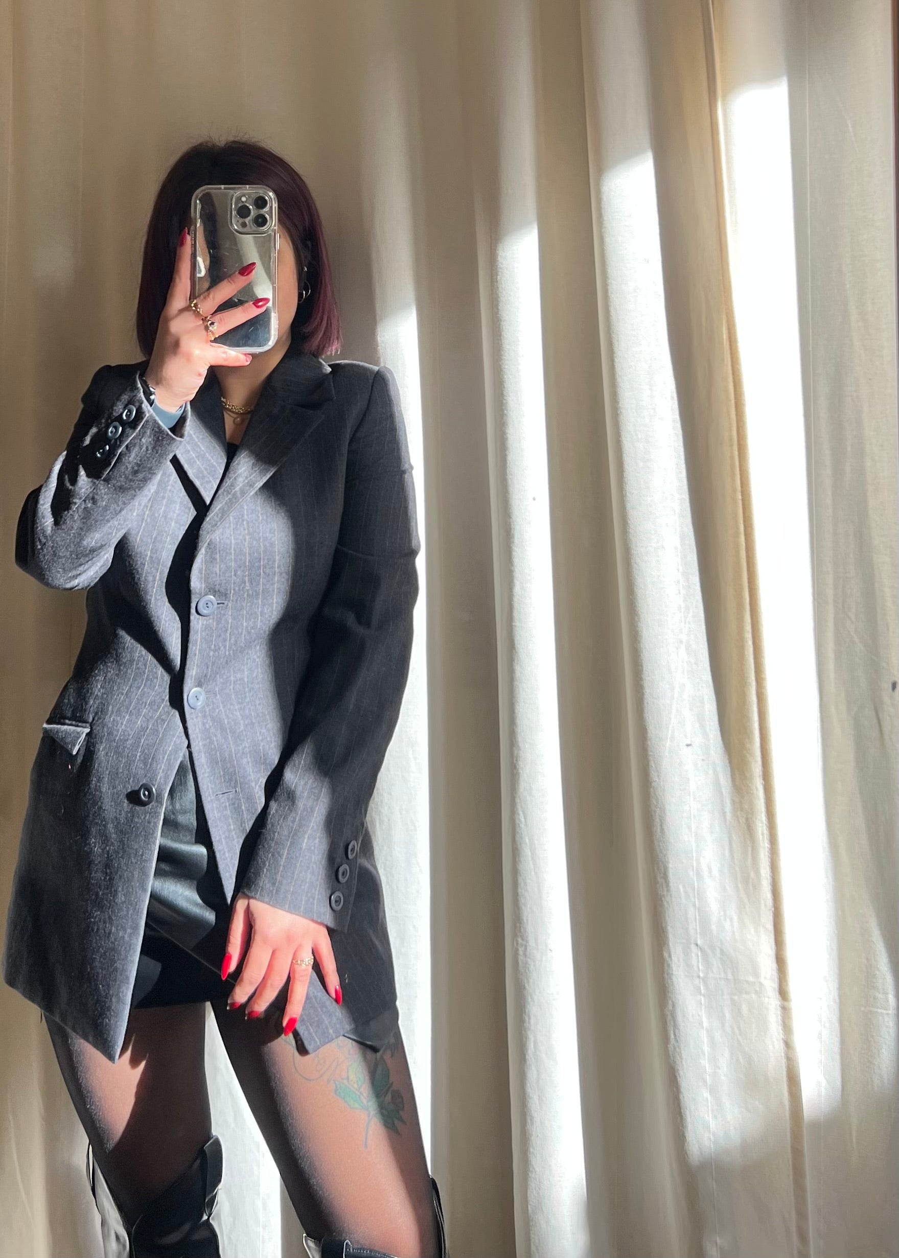 Blazer semilungo firmato Biblos, realizzato in tessuto gessato grigio, raffinato e senza tempo.