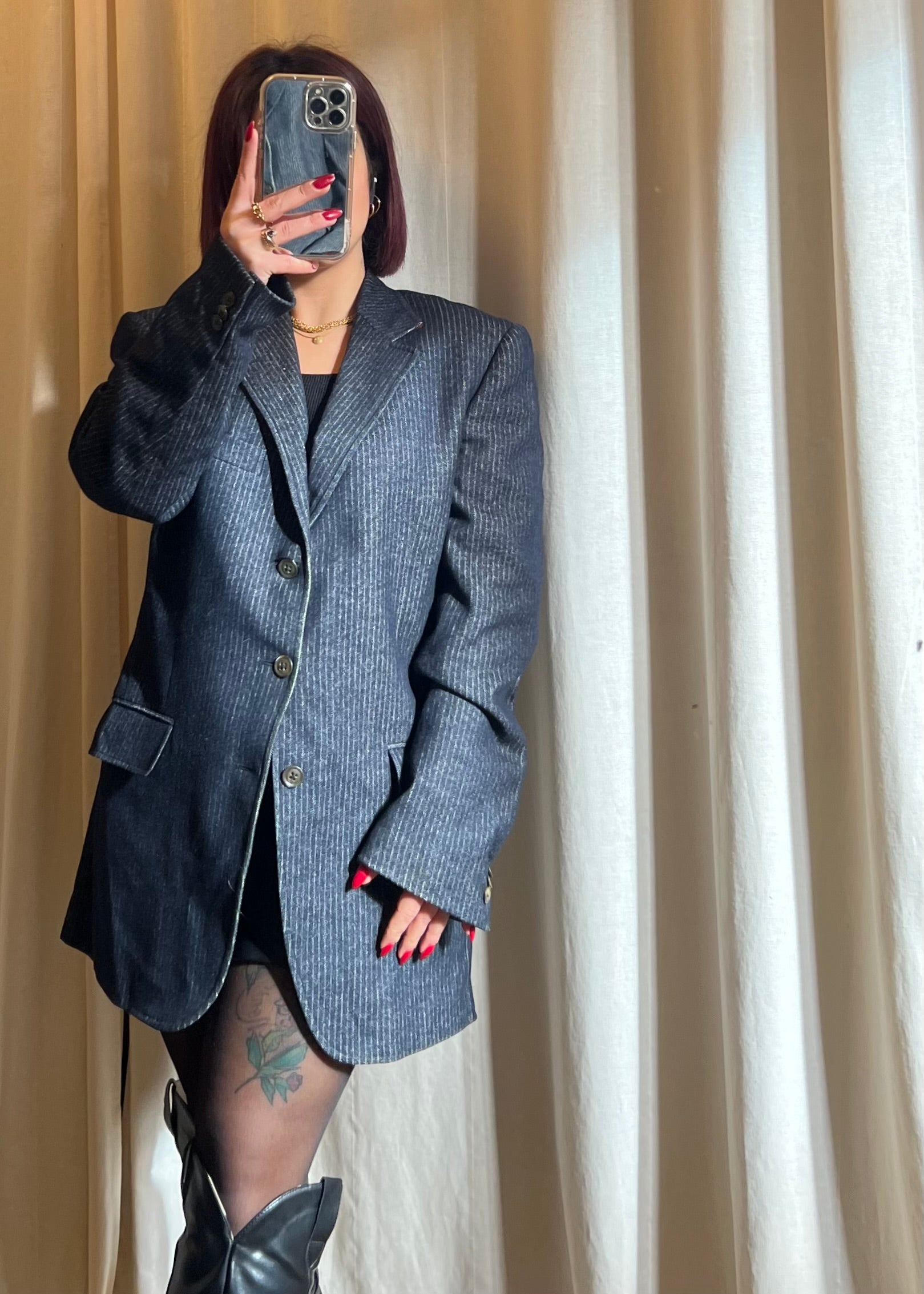 Blazer oversize firmato Etro, caratterizzato da un raffinato motivo gessato su una trama effetto jeans, che dona al capo un’allure contemporanea e ricercata.