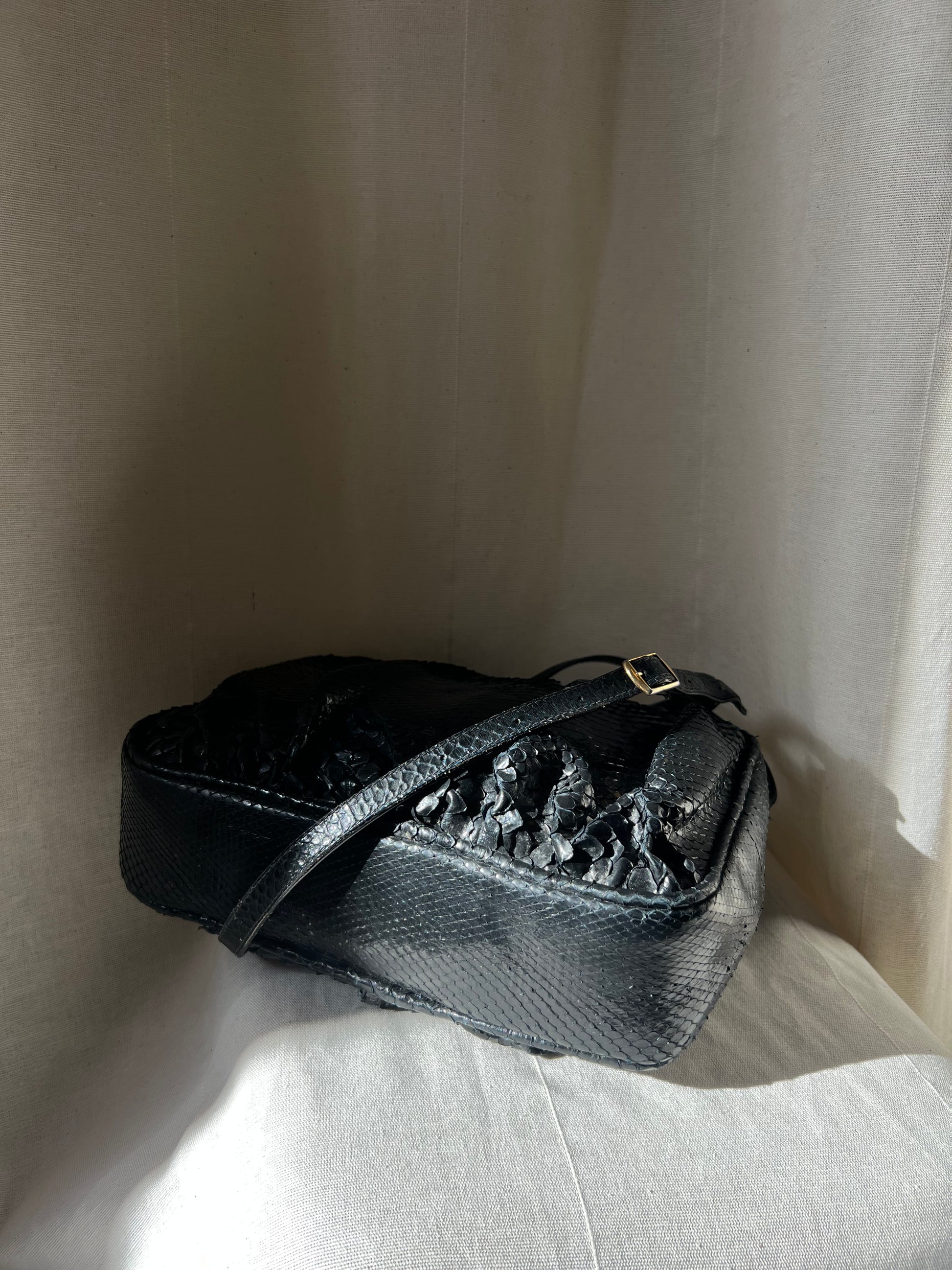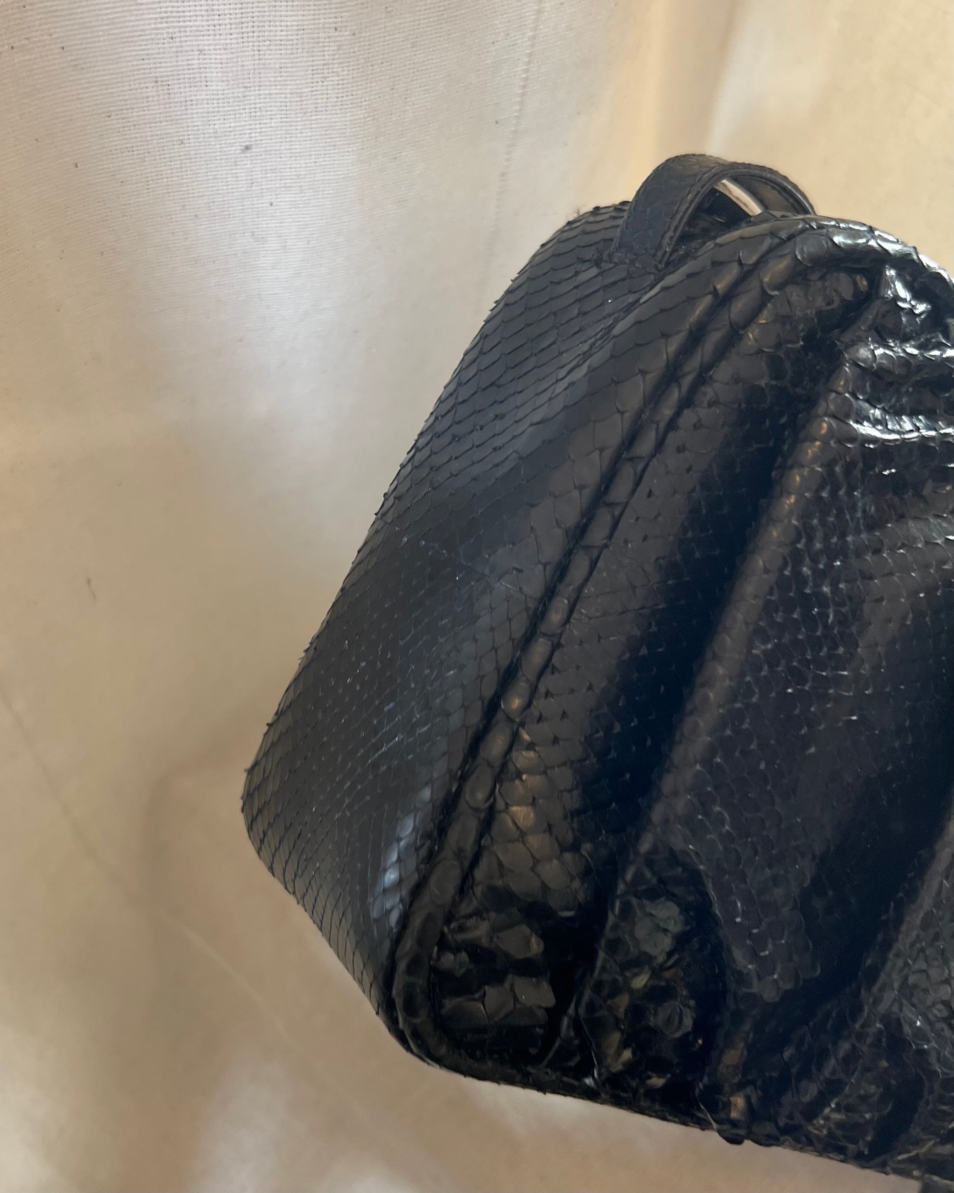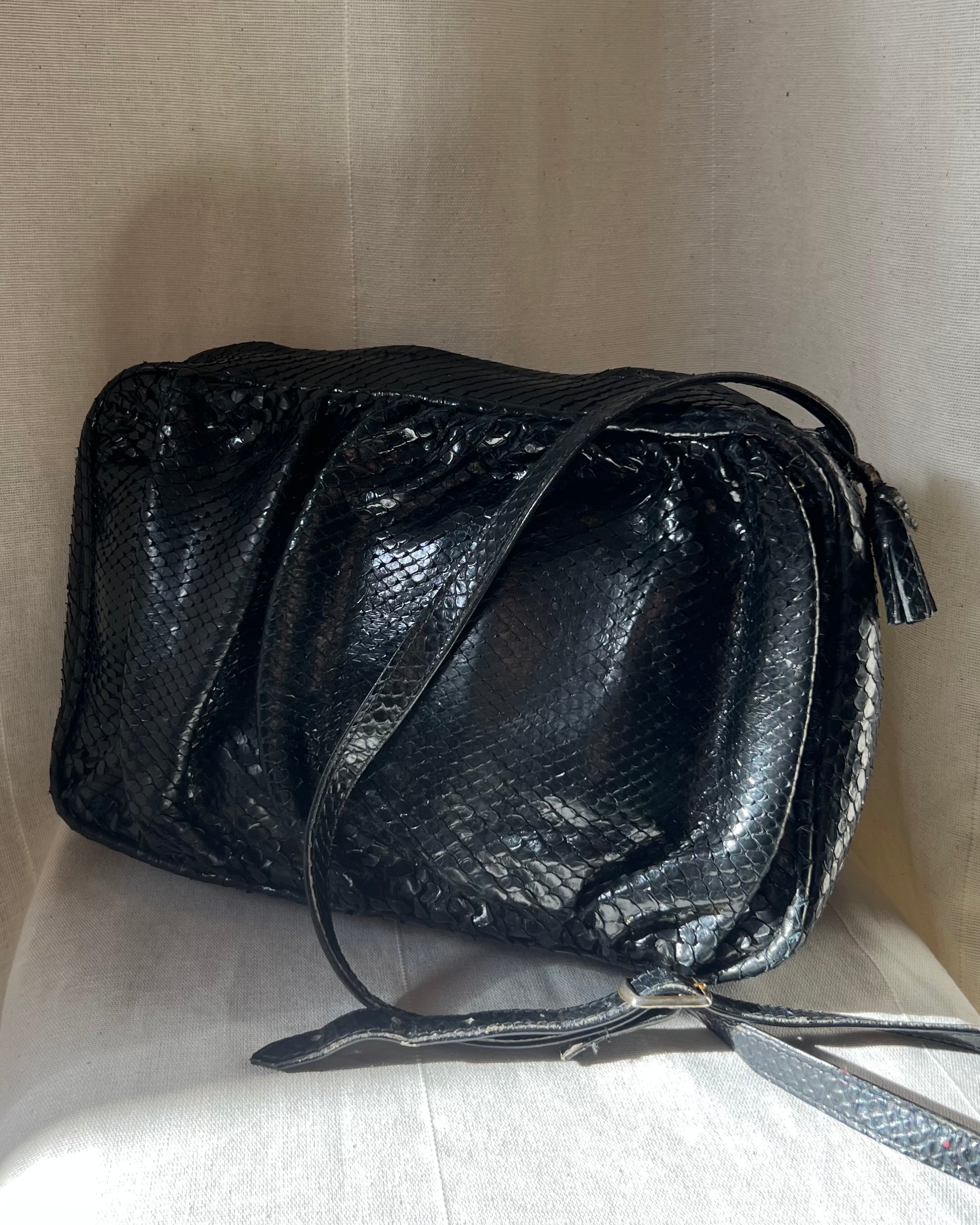 .Un vero capolavoro di stile, questa borsa modello camera bag con tracolla regolabile, unisce la raffinatezza del pitone a una vernice nera lucida e dettagli in metalleria oro, creando un accessorio elegante e super attuale. La chiusura con cerniera garantisce sicurezza e praticità, mentre l’ampio interno, tipico del modello camera bag, la rende sorprendentemente spaziosa. Perfetta da indossare sia con outfit casual che con look più eleganti, questa borsa è in eccellenti condizioni, un pezzo di grande impatto per chi cerca qualità e design senza tempo.