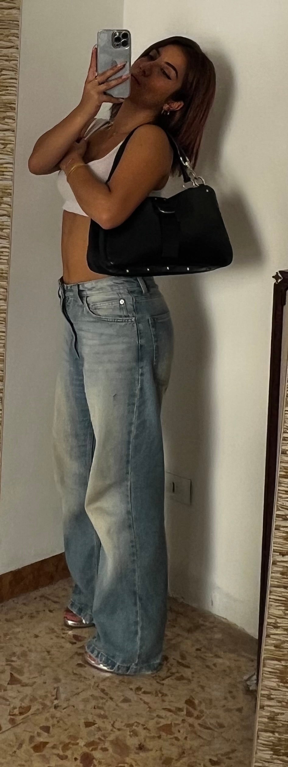 Il design è reso unico dalla doppia apertura: una con fasce decorative e l’altra con bottone a pressione, pratica e sicura. A completare il modello, un esclusivo gancio gioiello arricchito da cristalli Swarovski, dettaglio sofisticato che esalta l’eleganza del pezzo.