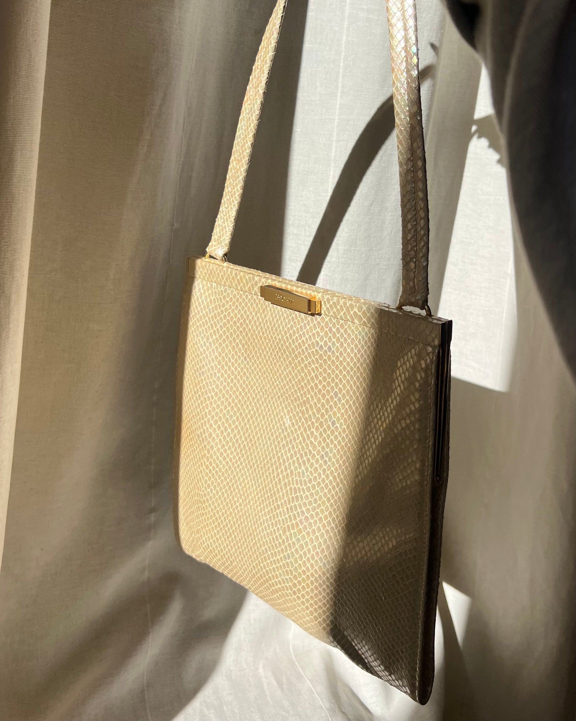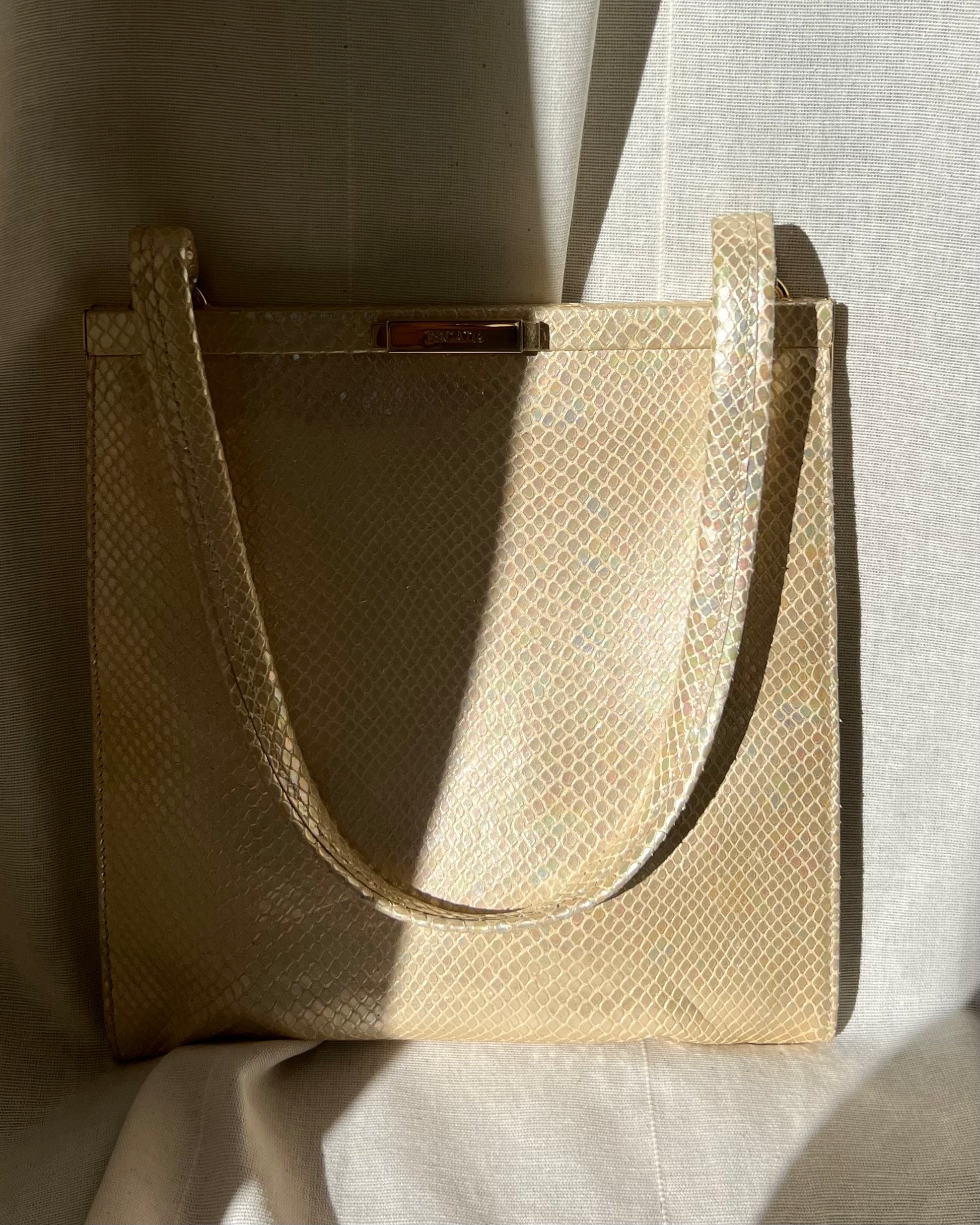 borsa Escada realizzata in pitone color crema, in controluce regala un effetto quasi olografico, unico e affascinante. Il modello Slip Bag, iconico e super fine, presenta apertura a scatto e dettagli in metalleria oro, aggiungendo un tocco di lusso discreto. Perfetta per collezionisti o per chi desidera un accessorio esclusivo, elegante e raffinato, capace di completare qualsiasi look con stile e originalità.