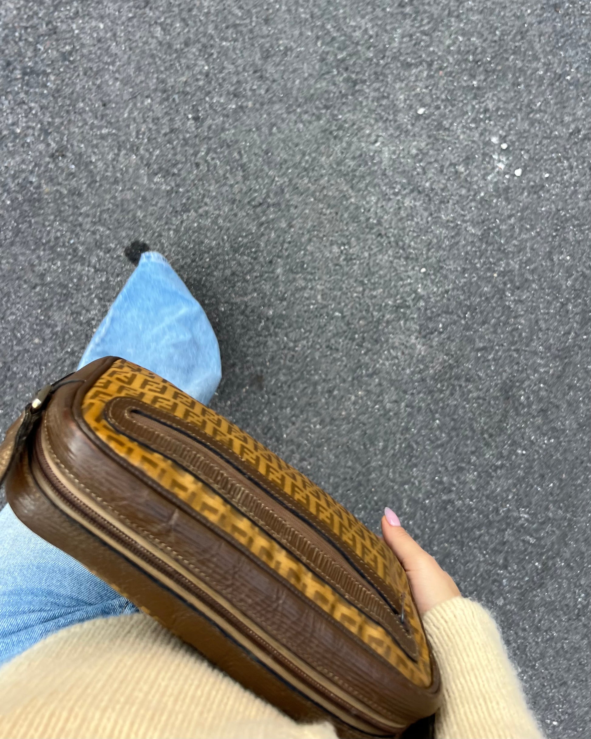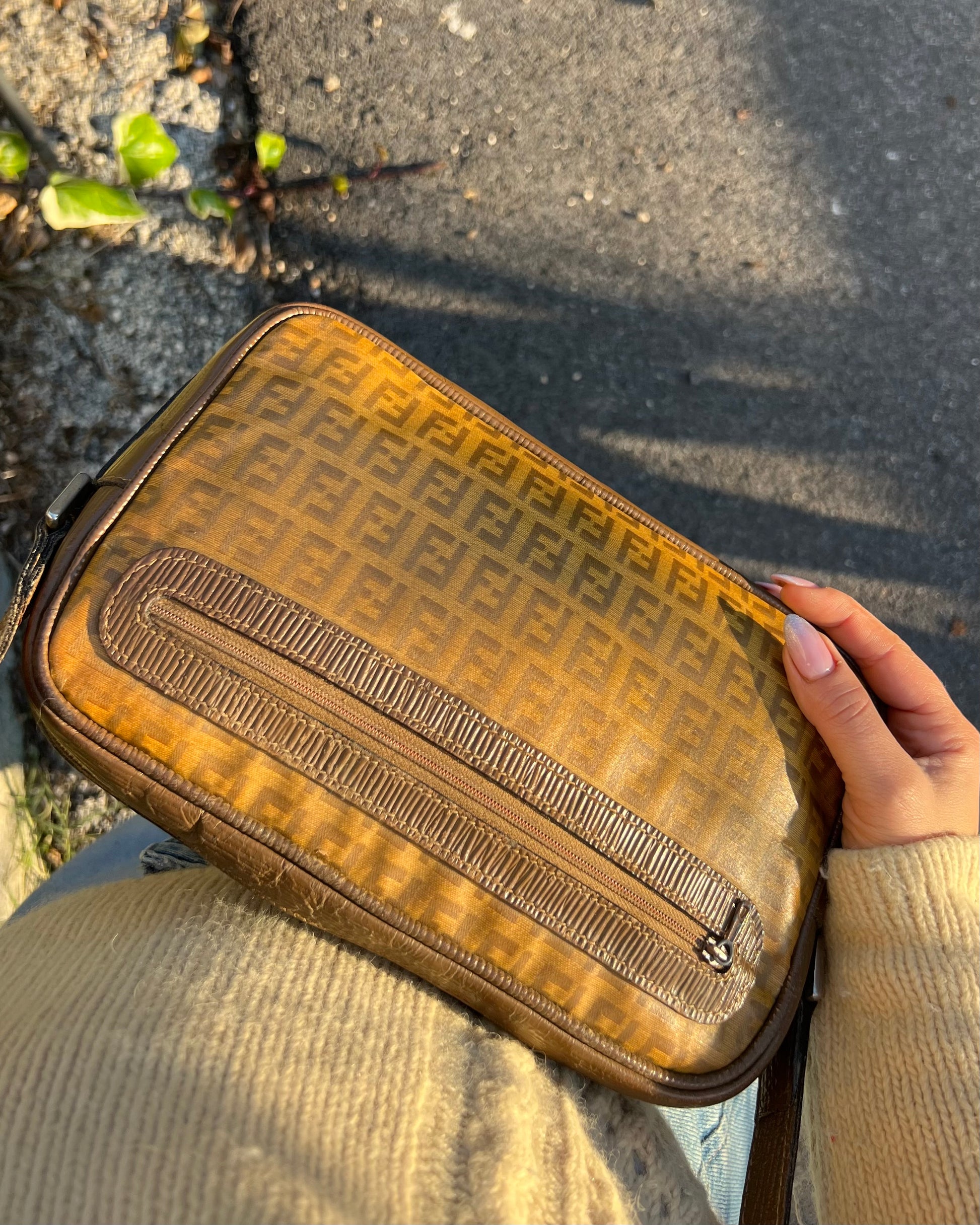 Raffinata e pratica, questa borsa a tracolla Fendi è realizzata in canvas monogram Zucchino plastificato nella tonalità miele, un colore caldo e versatile che valorizza l’iconico motivo della Maison. I dettagli in pelle rigata, insieme alla tracolla coordinata, richiamano lo stile classico e riconoscibile del brand.