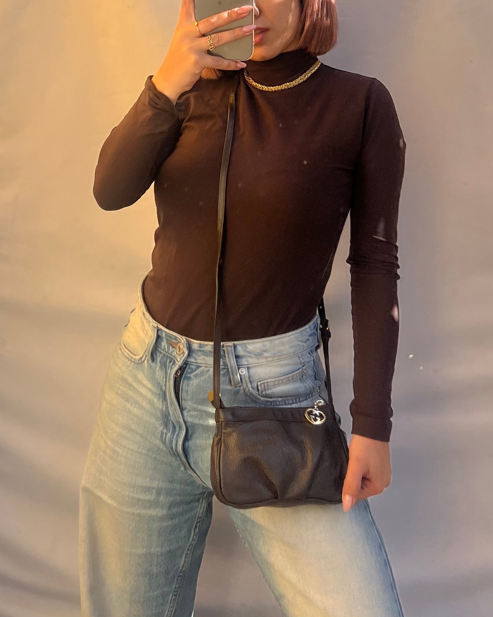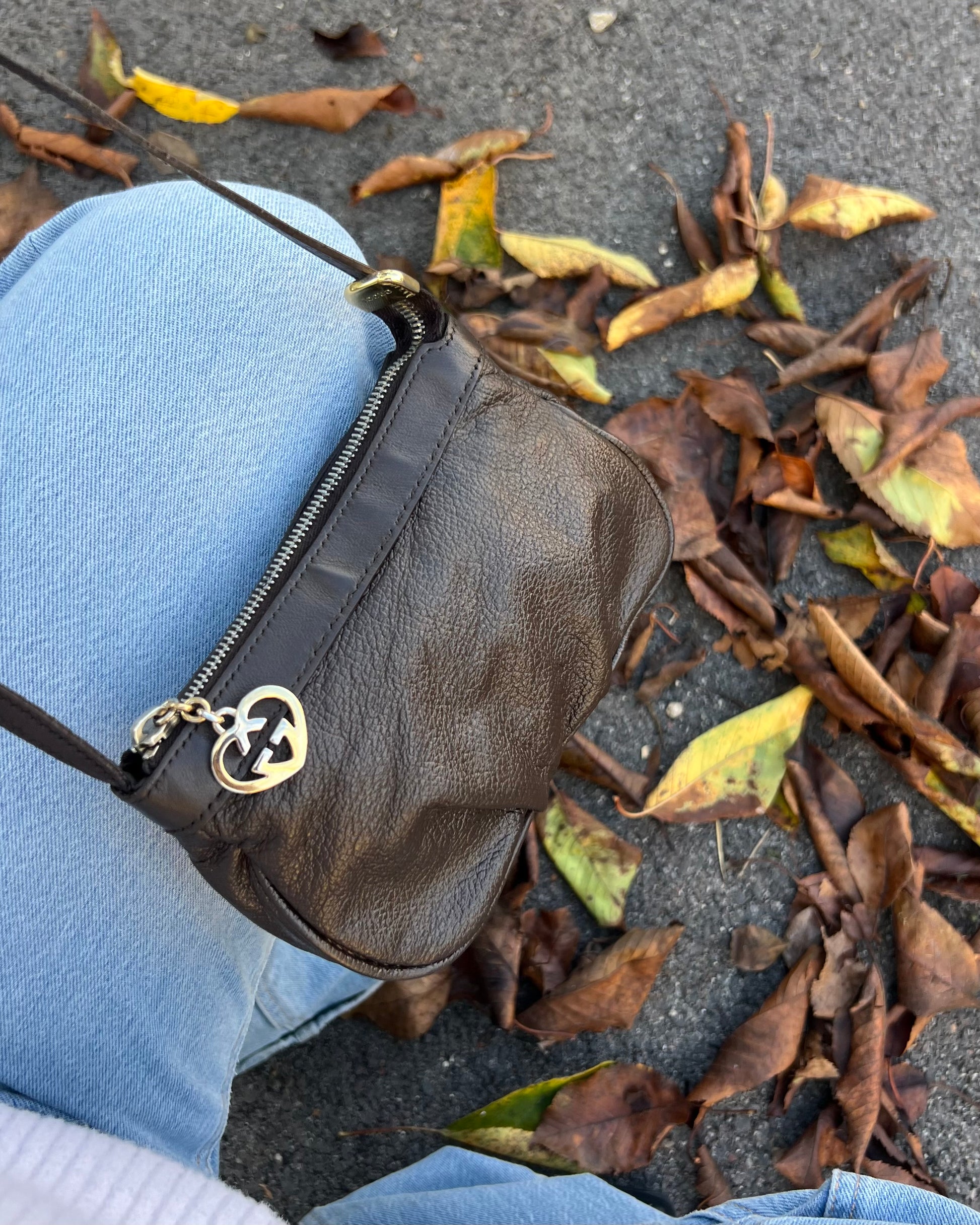 Raffinata e femminile, questa tracolla Gucci in pelle martellata color cioccolato si distingue per il suo elegante tiralampo gioiello con doppia G a forma di cuore, dettaglio iconico e romantico della maison.