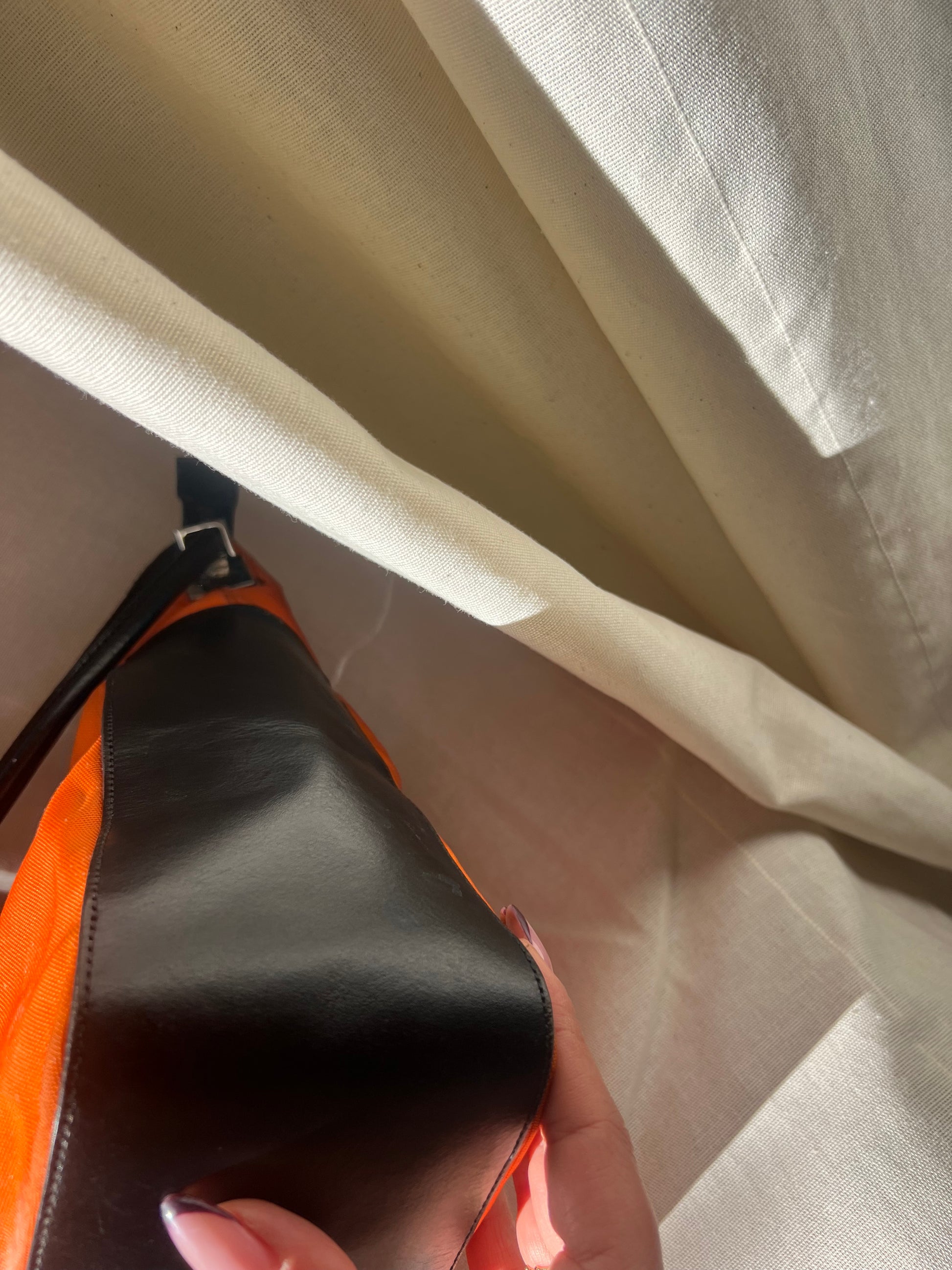 Questa raffinata borsa Gucci, risalente all’era Tom Ford, unisce stile iconico e funzionalità quotidiana. Realizzata in tela impermeabile resistente con un elegante arancio a contrasto, presenta bordi e dettagli in pelle nera che ne esaltano il design. Il logo Gucci sulla pelle frontale aggiunge un tocco distintivo. Pratica e versatile, si chiude con cerniera e può essere comodamente portata a spalla. Le dimensioni perfette la rendono ideale per l’uso di tutti i giorni, combinando estetica e praticità in un unico accessorio di lusso.