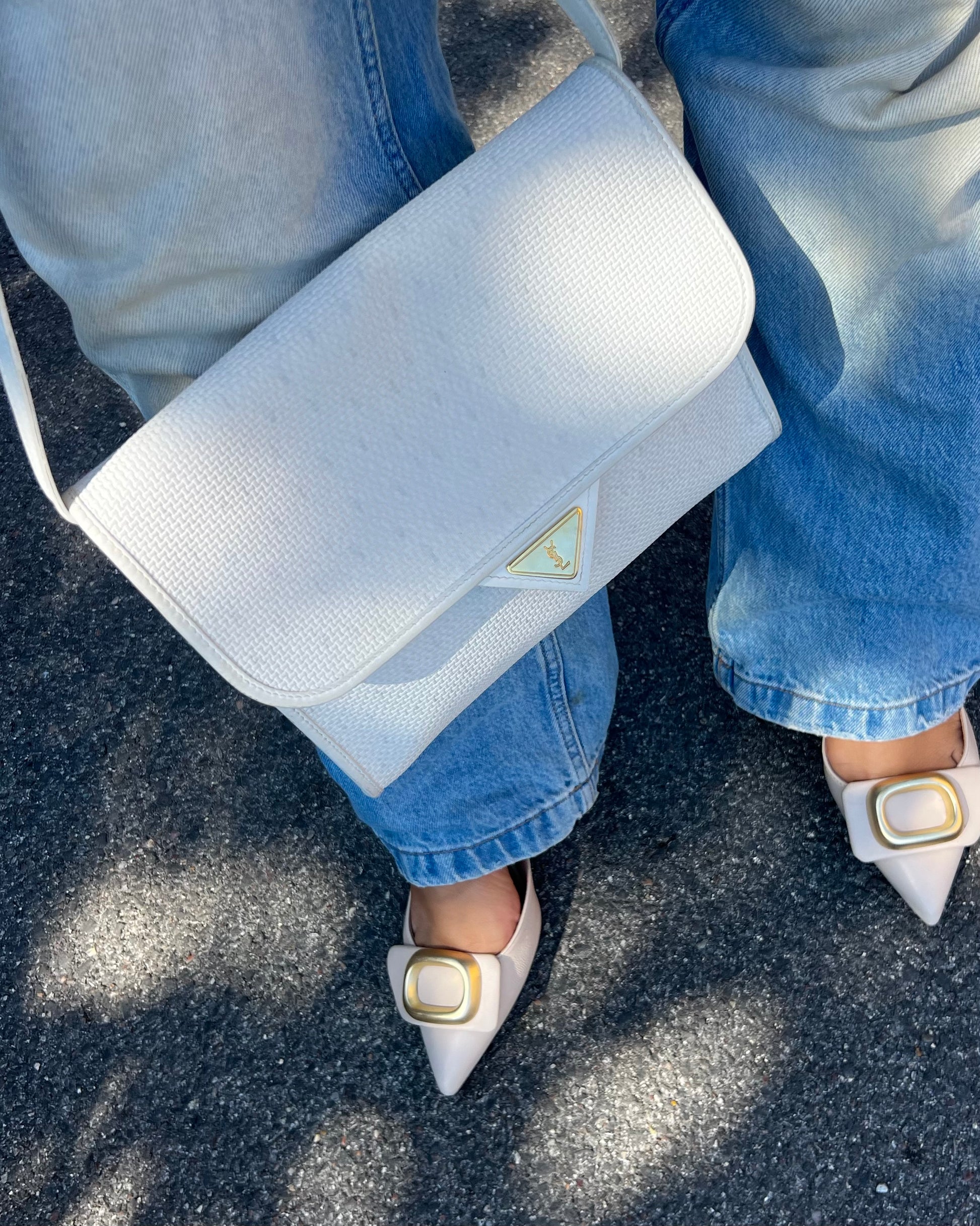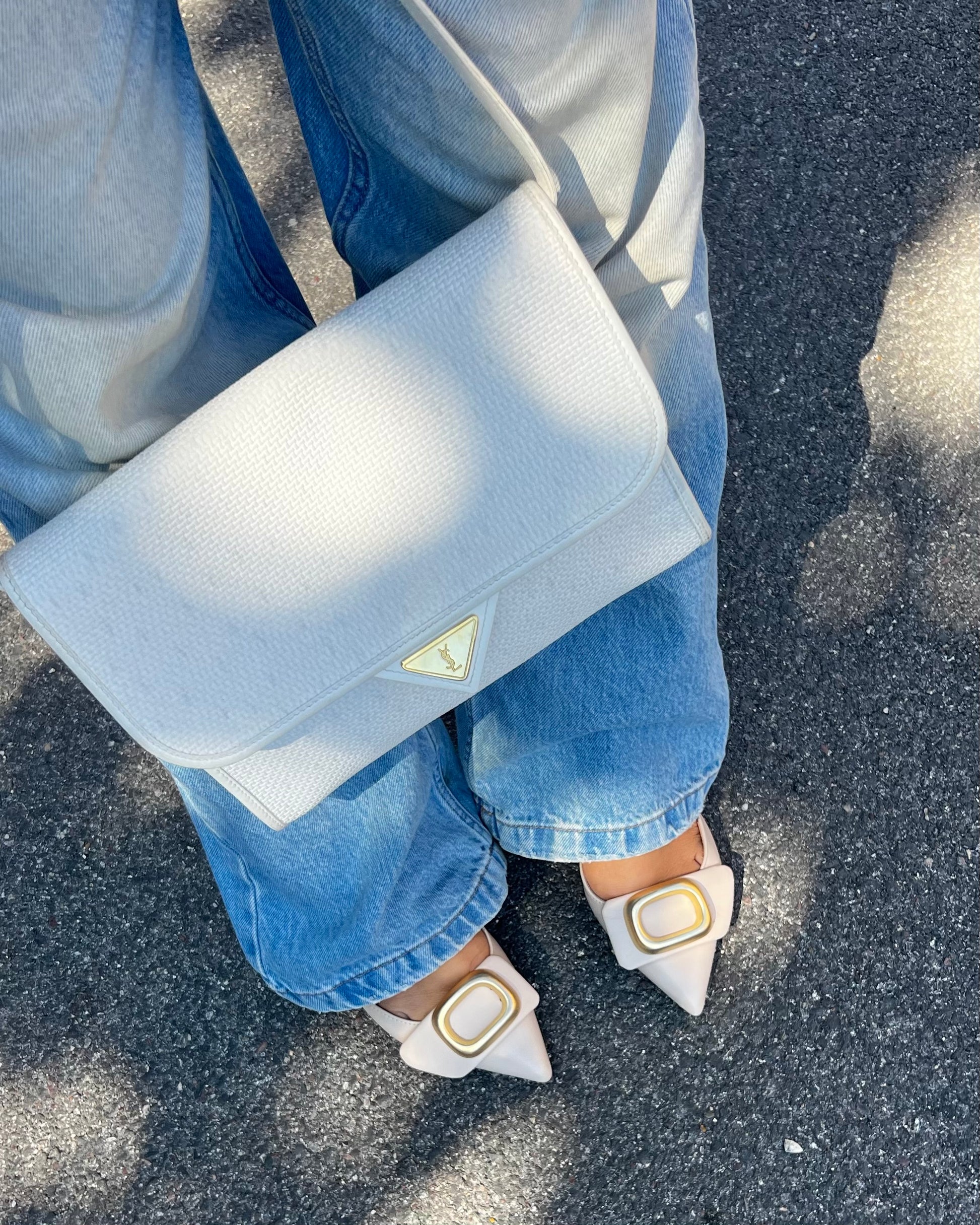 L’elegante hardware dorato arricchisce il design, mentre la chiusura con bottone gioiello firmato Yves Saint Laurent ne esalta l’allure sofisticata. L’interno è foderato in tessuto monogram bianco e grigio ed è dotato di pratico taschino con cerniera, impreziosito da tiralampo logato.