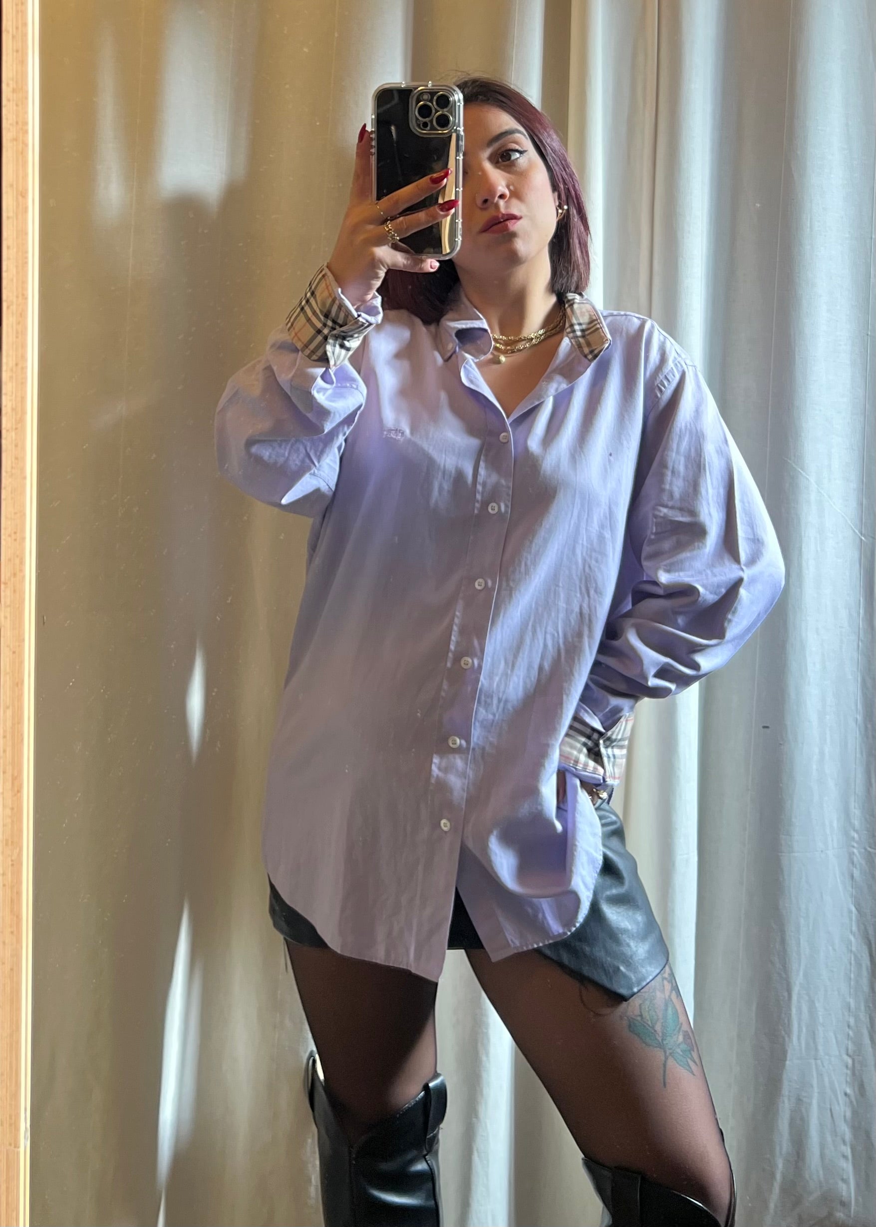 Camicia Burberry color lilla, un capo che unisce eleganza senza tempo e dettagli iconici. Il logo ricamato sul petto sottolinea l’autenticità del brand, mentre colletto e polsini in tartan check aggiungono un raffinato contrasto di stile. I bottoni logati Burberry completano la camicia con un tocco discreto di lusso. In foto è indossata da una taglia S; la vestibilità consigliata arriva fino a una taglia L, in linea con l’etichetta. Il colore lilla la rende luminosa e sofisticata, perfetta sia per look chic da giorno sia per outfit più ricercati, un vero must-have per chi ama la qualità e l’eleganza Made in England firmata Burberry.