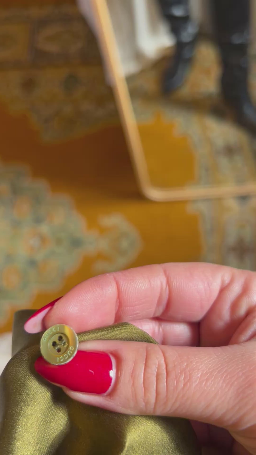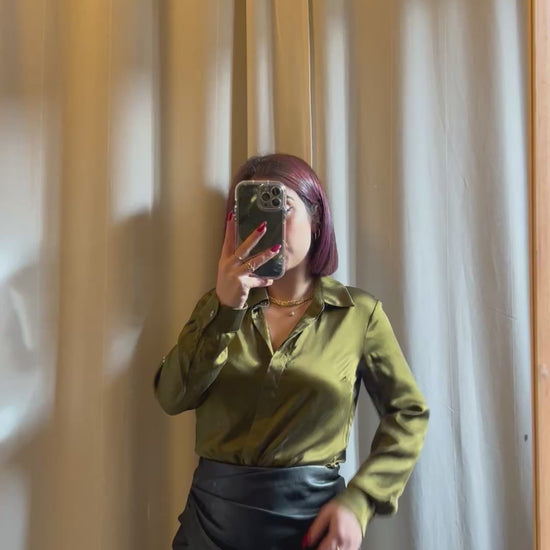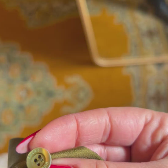Camicia Gucci in seta verde militare, dal finish semilucido effetto raso, elegante e senza tempo. In etichetta è riportata la taglia 38, ma la vestibilità flessibile la rende consigliata fino alla taglia 42. I bottoni in madreperla verde, logati Gucci, aggiungono un tocco di lusso discreto, mentre il design classico e raffinato la rende perfetta sia abbinata a un jeans casual sia a una gonna elegante. Un vero capolavoro del Made in Italy, versatile e intramontabile, pensata per chi ama lo stile sofisticato e l’eleganza autentica.