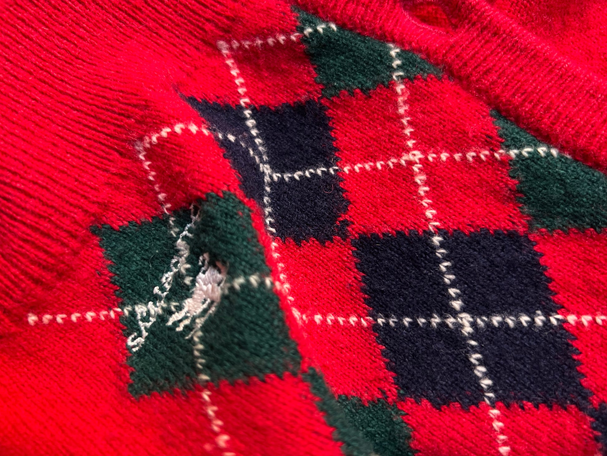 Elegante e raffinato, questo cardigan Burberry presenta una base rossa con motivo a rombi verdi e blu, impreziosito dal logo ricamato sul fondo. La chiusura è costituita da una fila di bottoni delicati, che aggiungono un tocco di raffinatezza al capo.