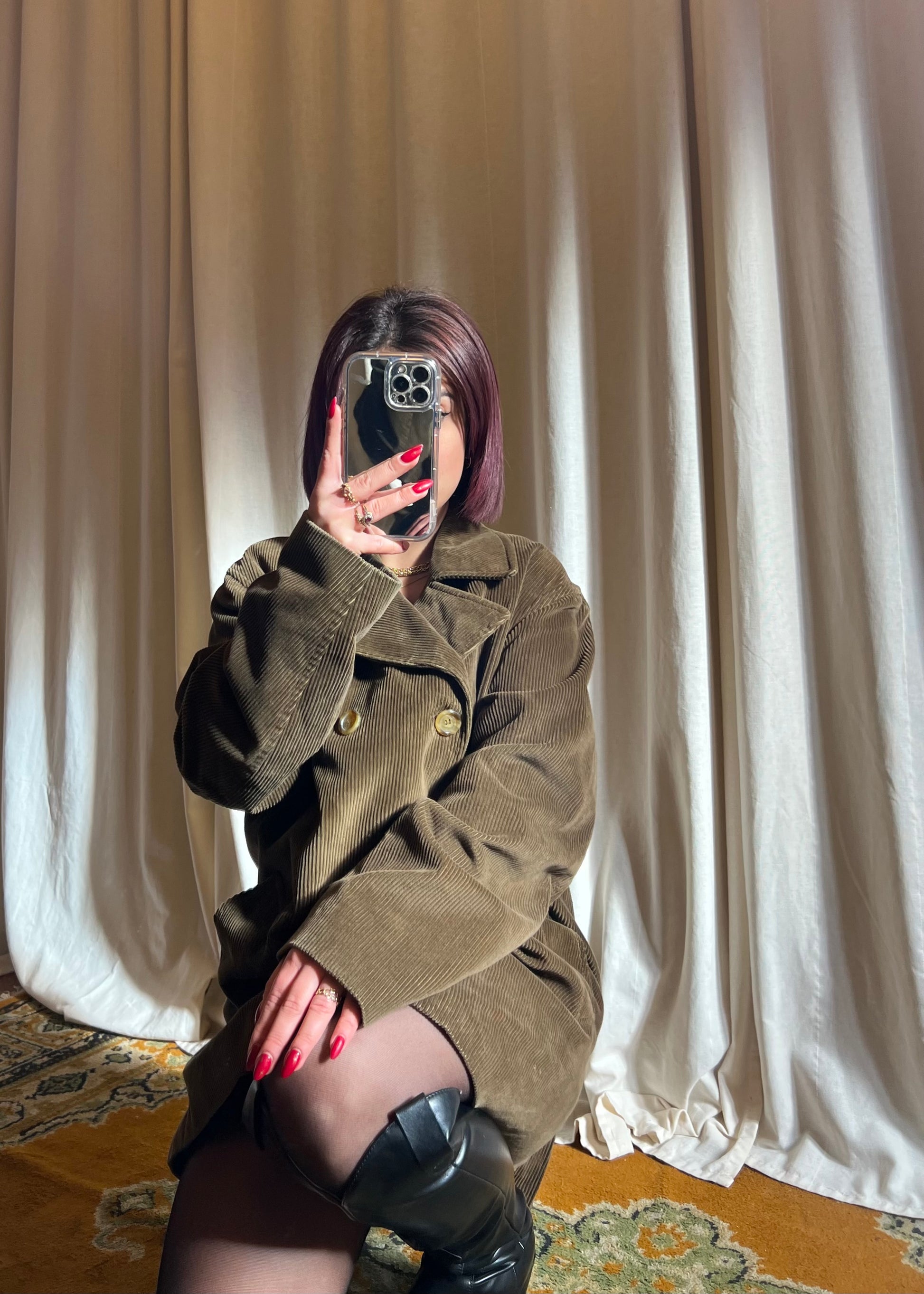 Giacca doppio petto in velluto color verde oliva del brand Burberry, con interno in tartan check in lana per un dettaglio iconico ed elegante. In foto è indossata su una taglia S, ma è consigliata fino a una taglia L. Bellissima, calda e sofisticata, è il capo perfetto per affrontare l’inverno con stile senza rinunciare alla comodità.