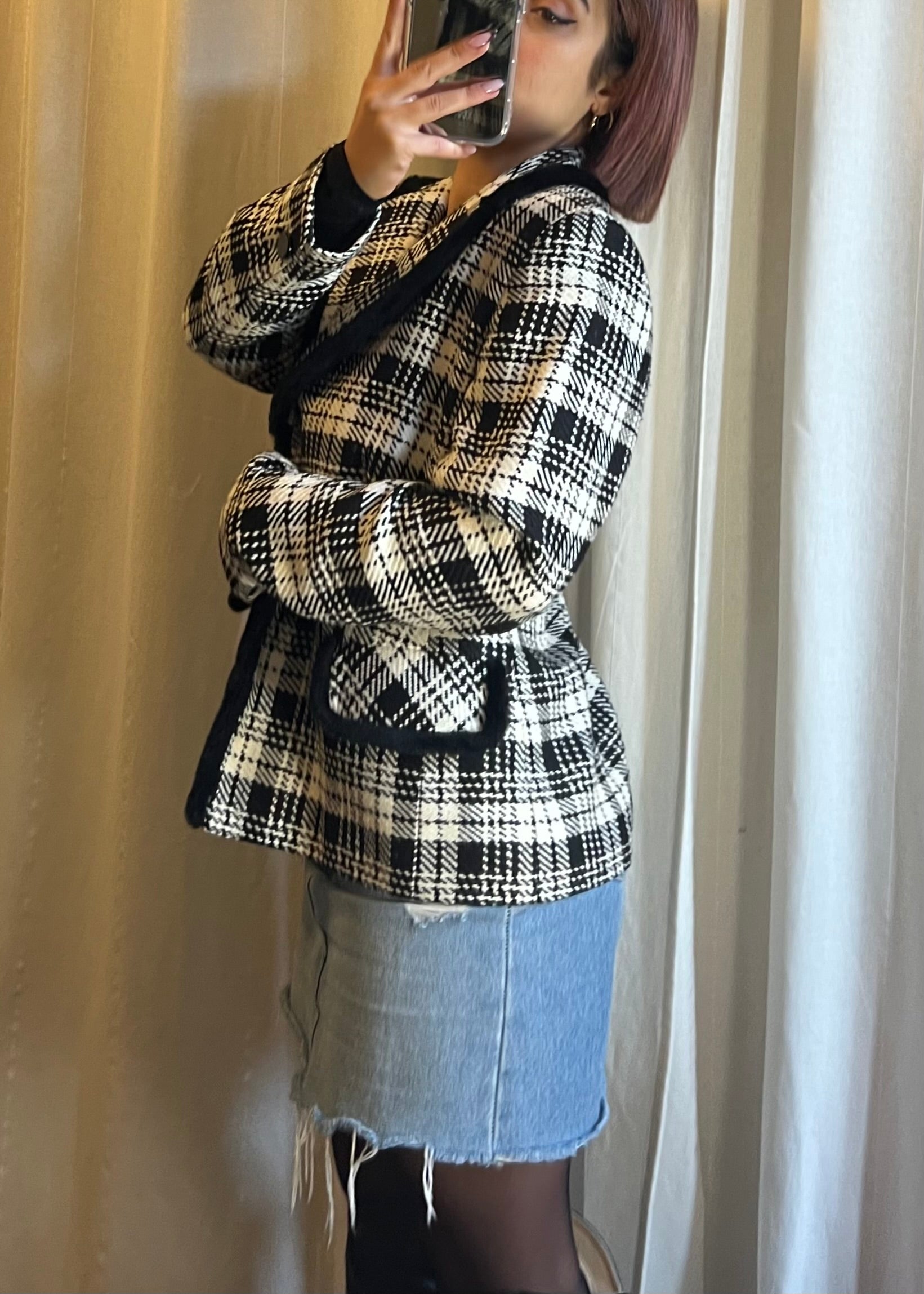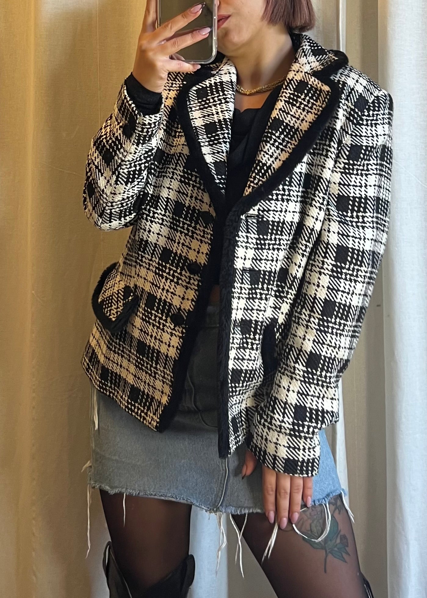 Blazer a quadri bianco e nero in lana, un capo strutturato ma femminile, perfetto per dare carattere a qualsiasi outfit.