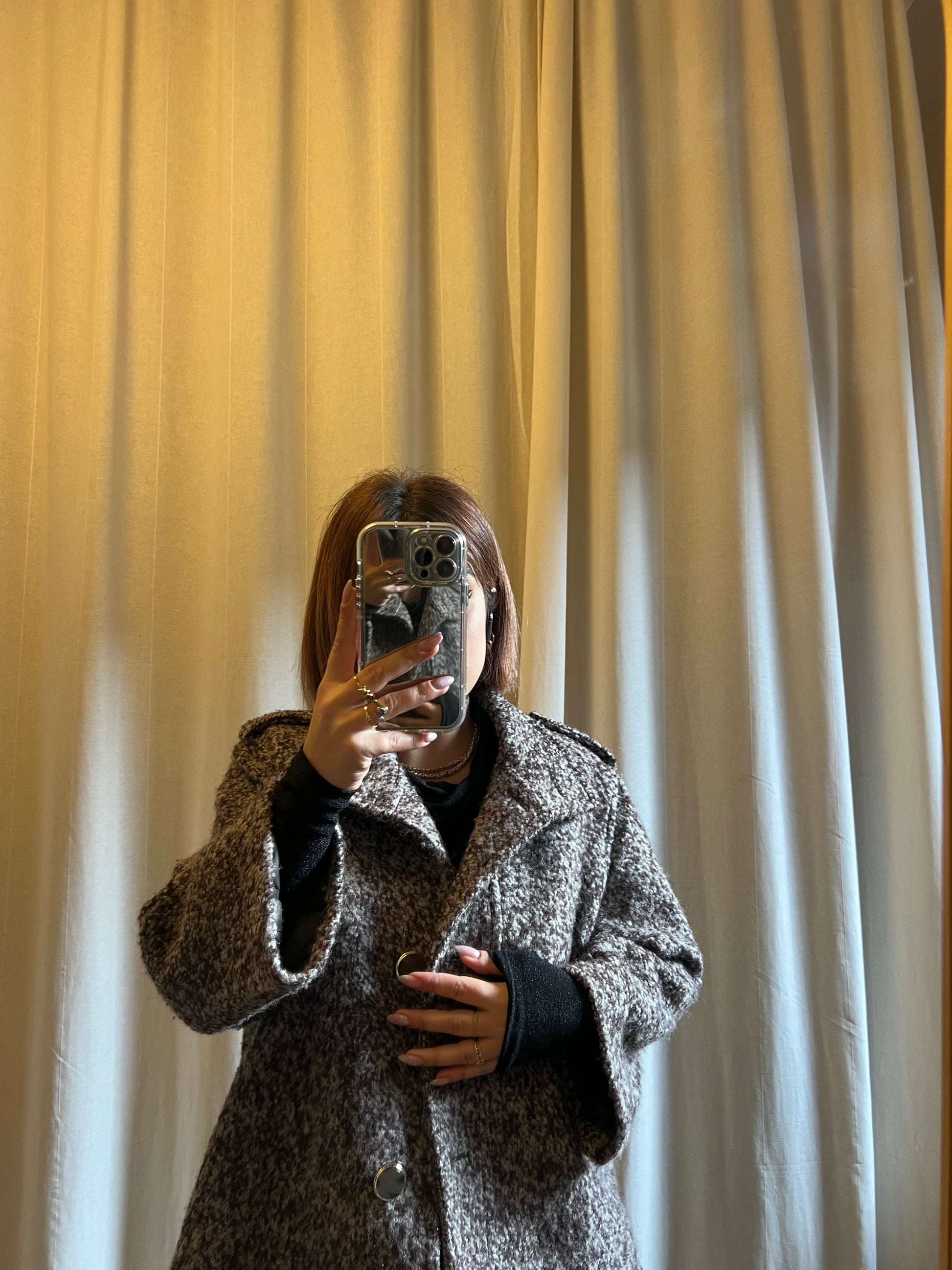 Il mix cromatico marrone e bianco dona profondità e movimento alla texture, mentre la lavorazione bouclé esalta la qualità del tessuto e il carattere sartoriale della giacca.