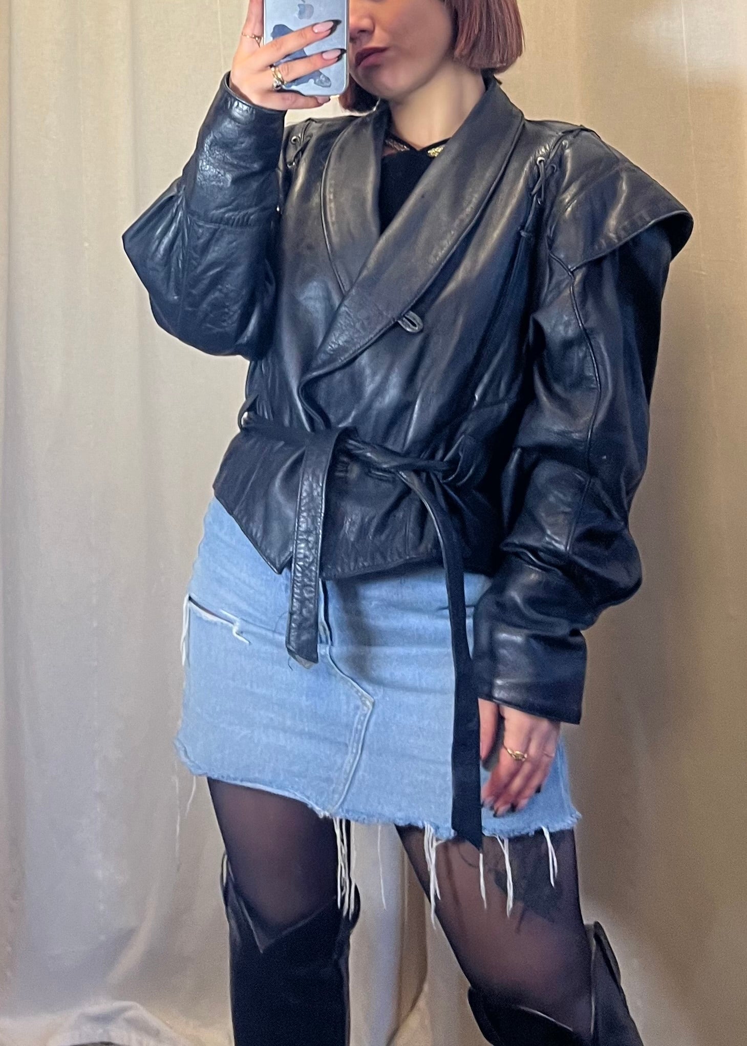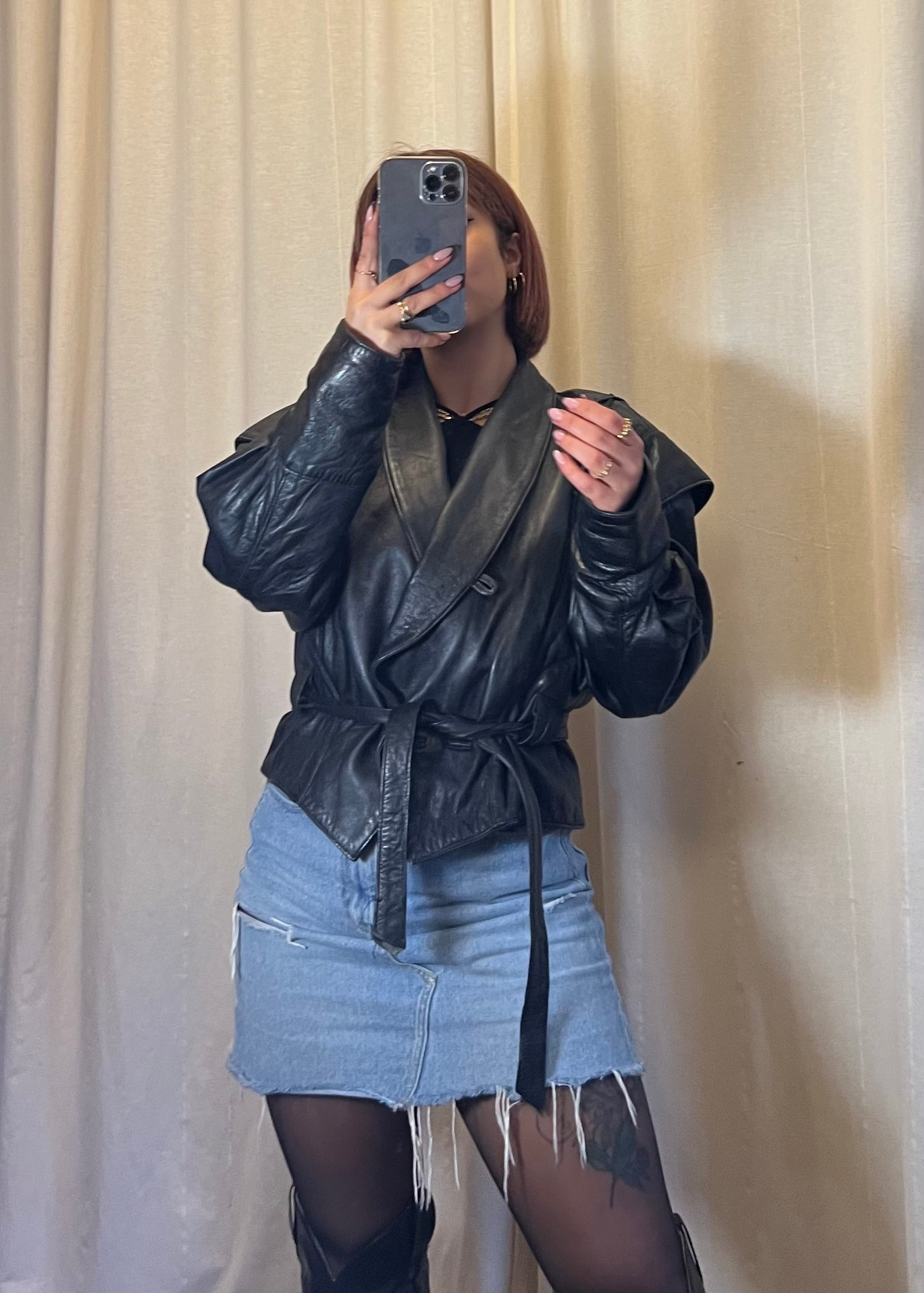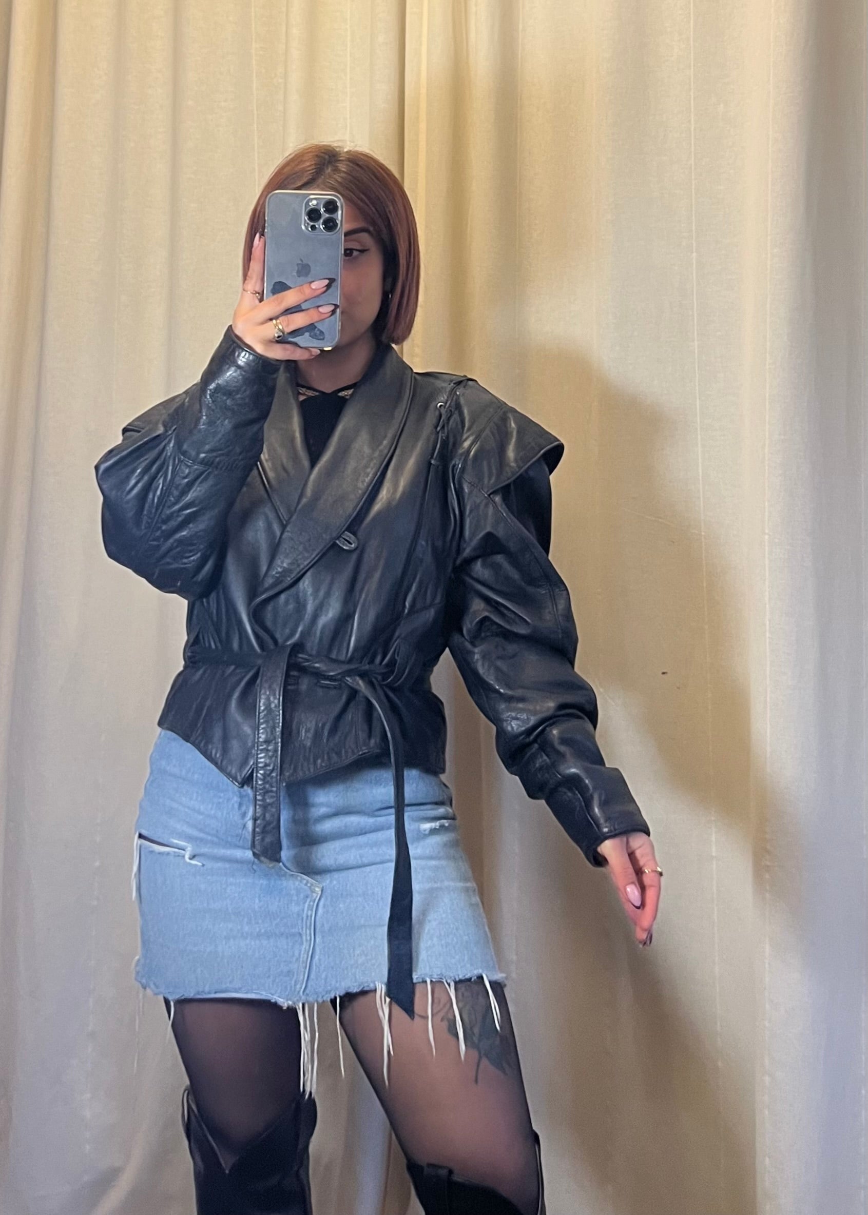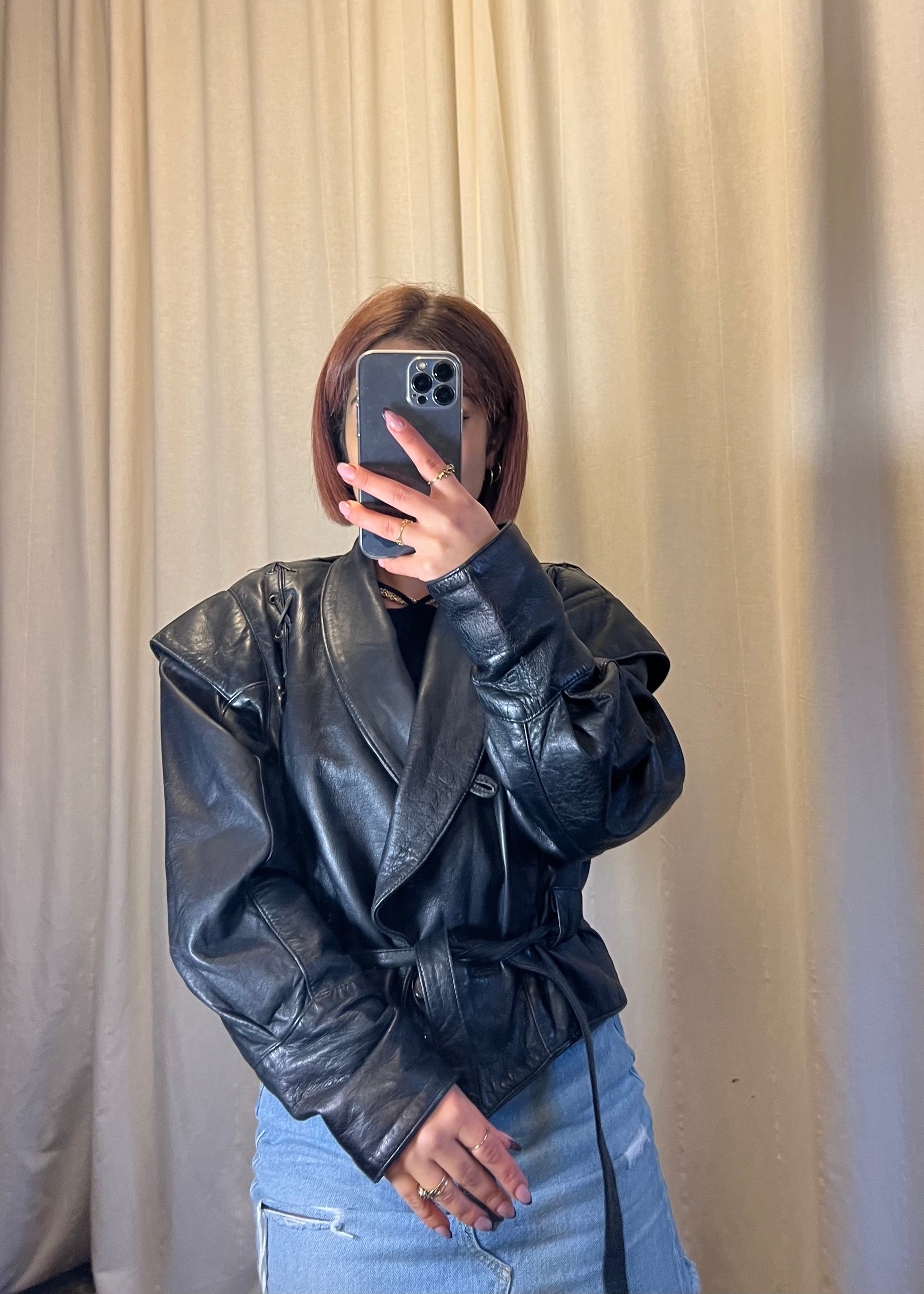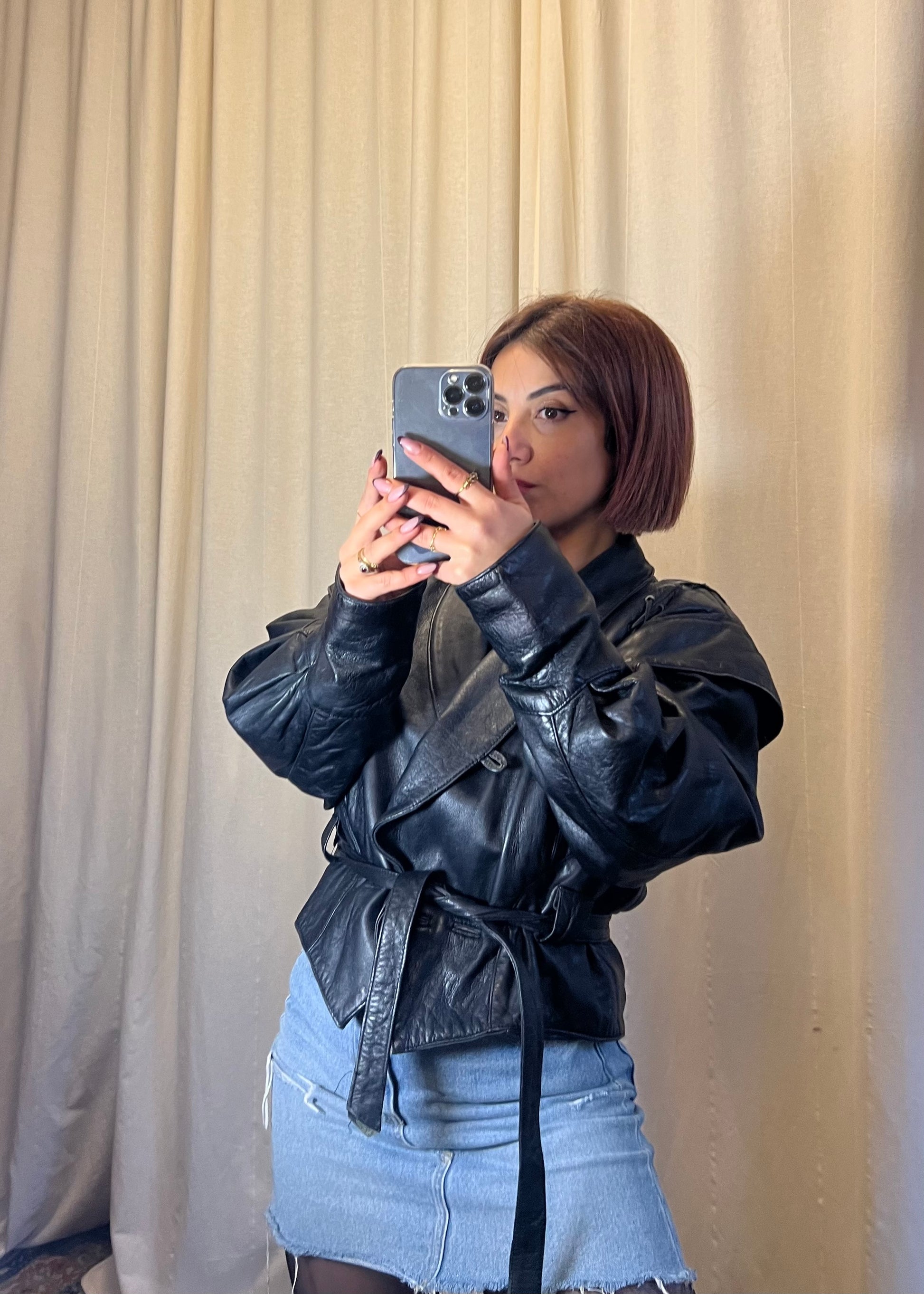 - Modello: giacca in pelle con spalle definite e cintura in vita