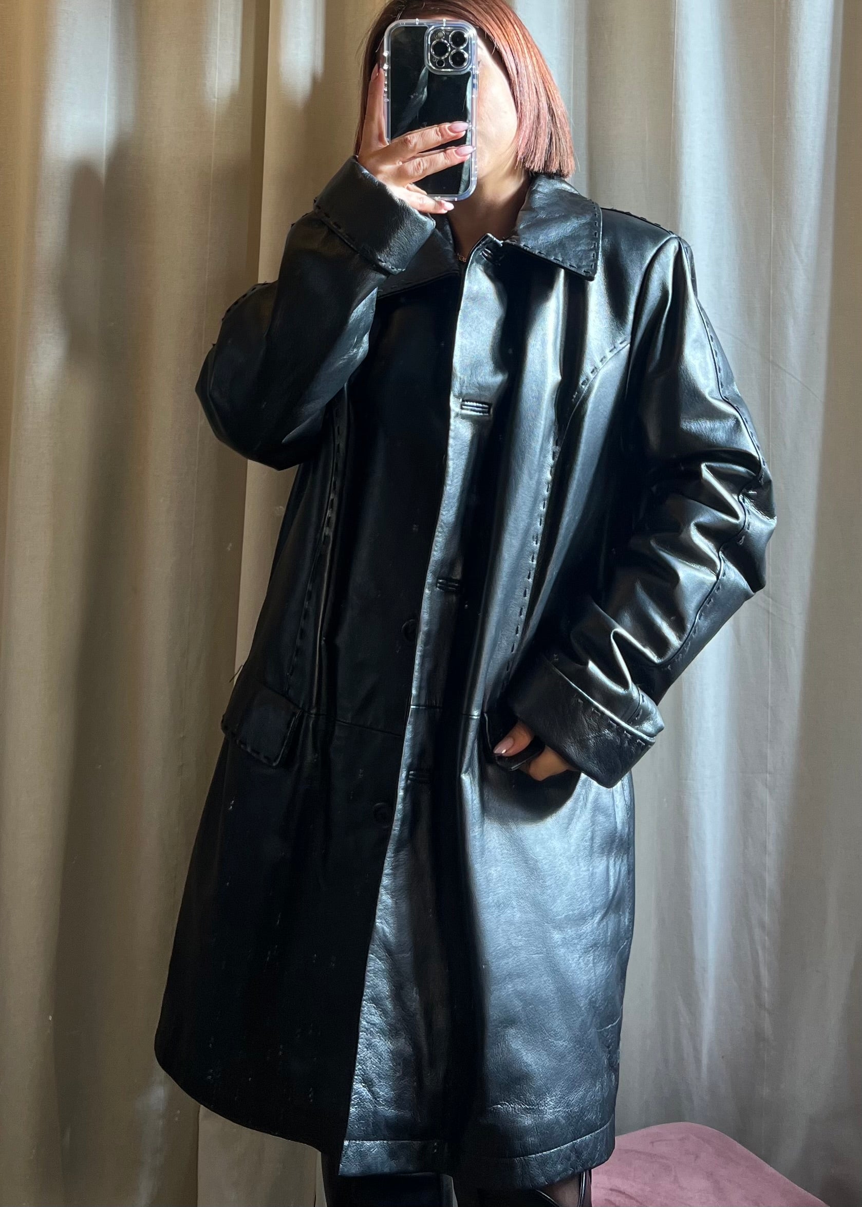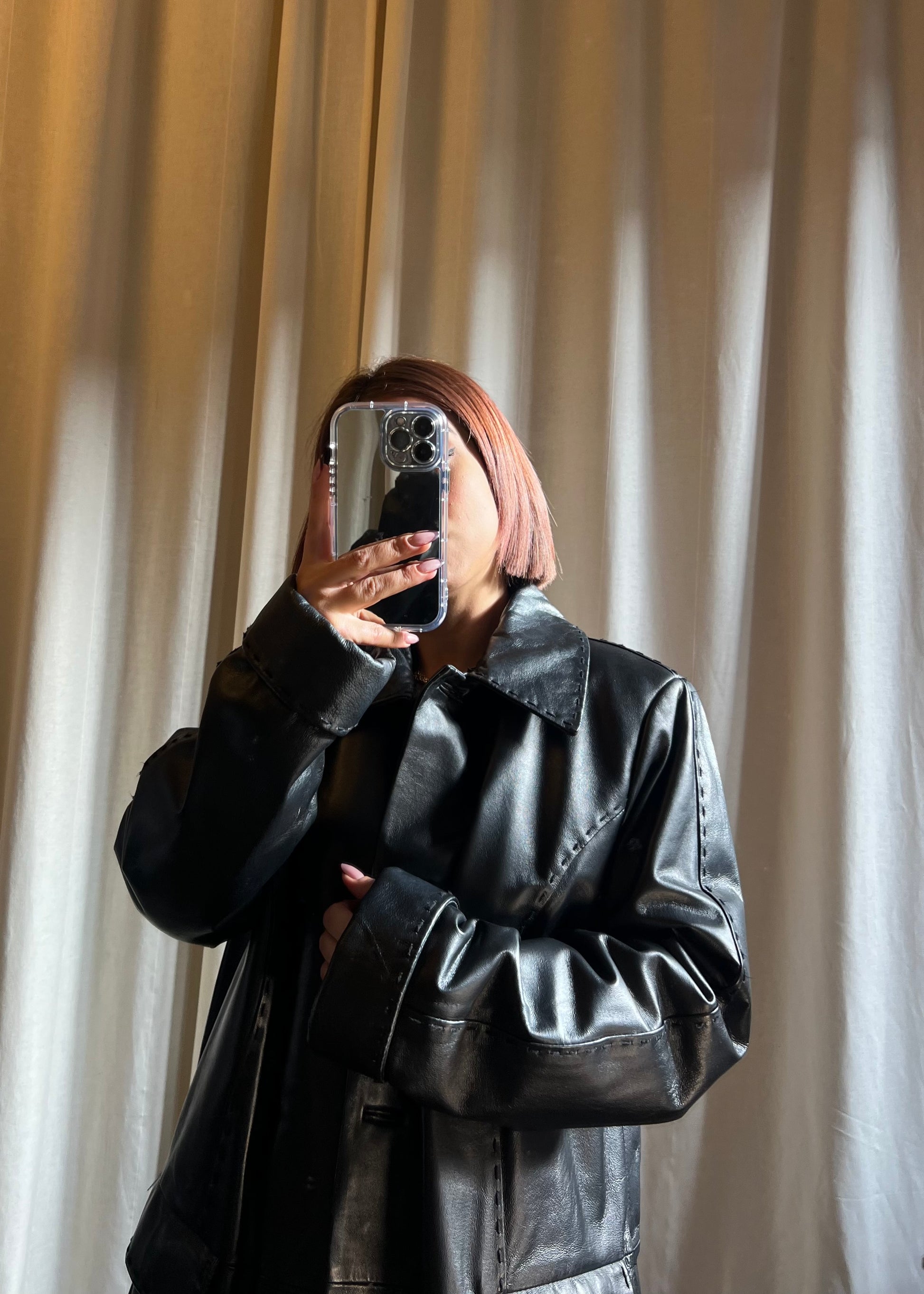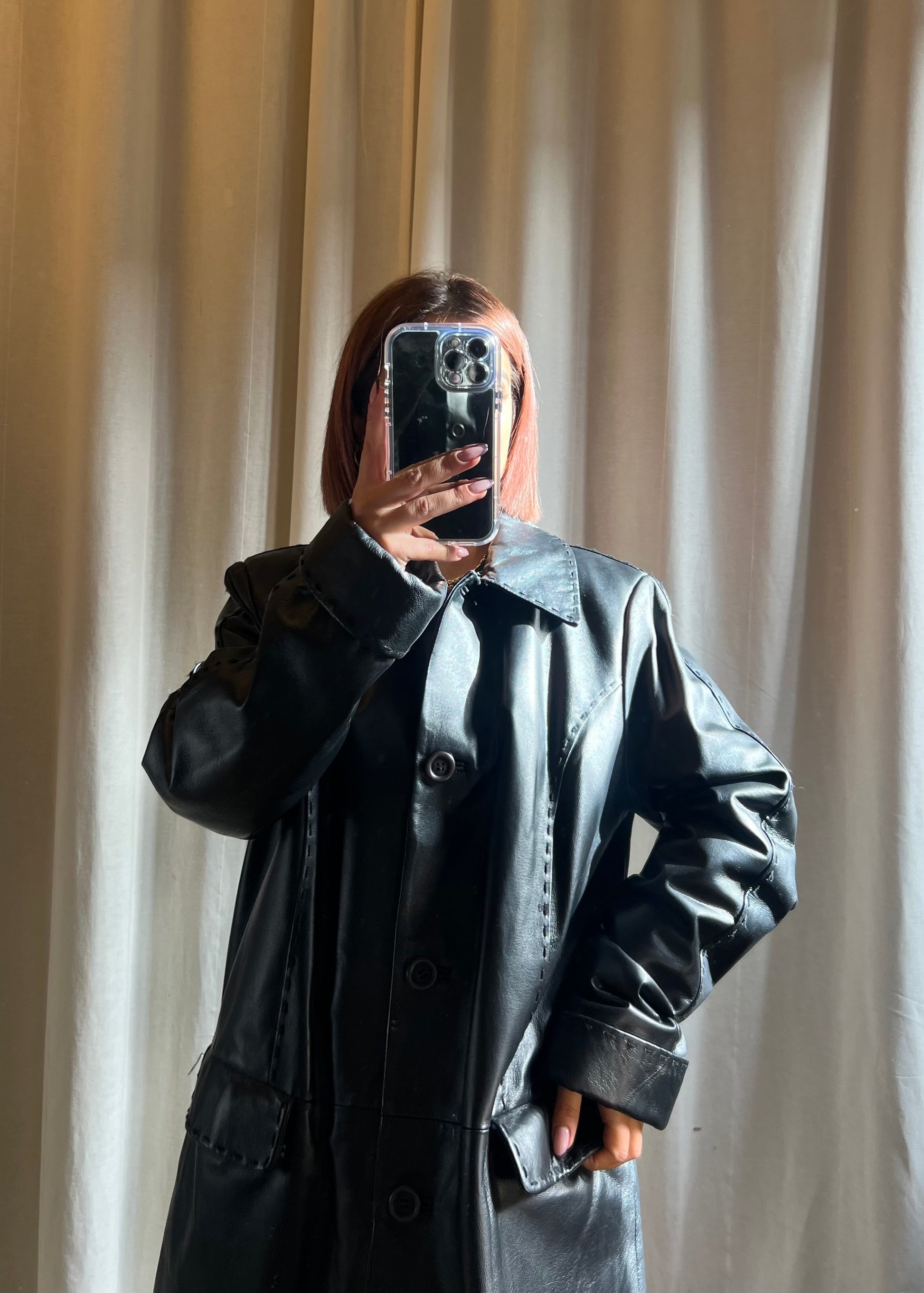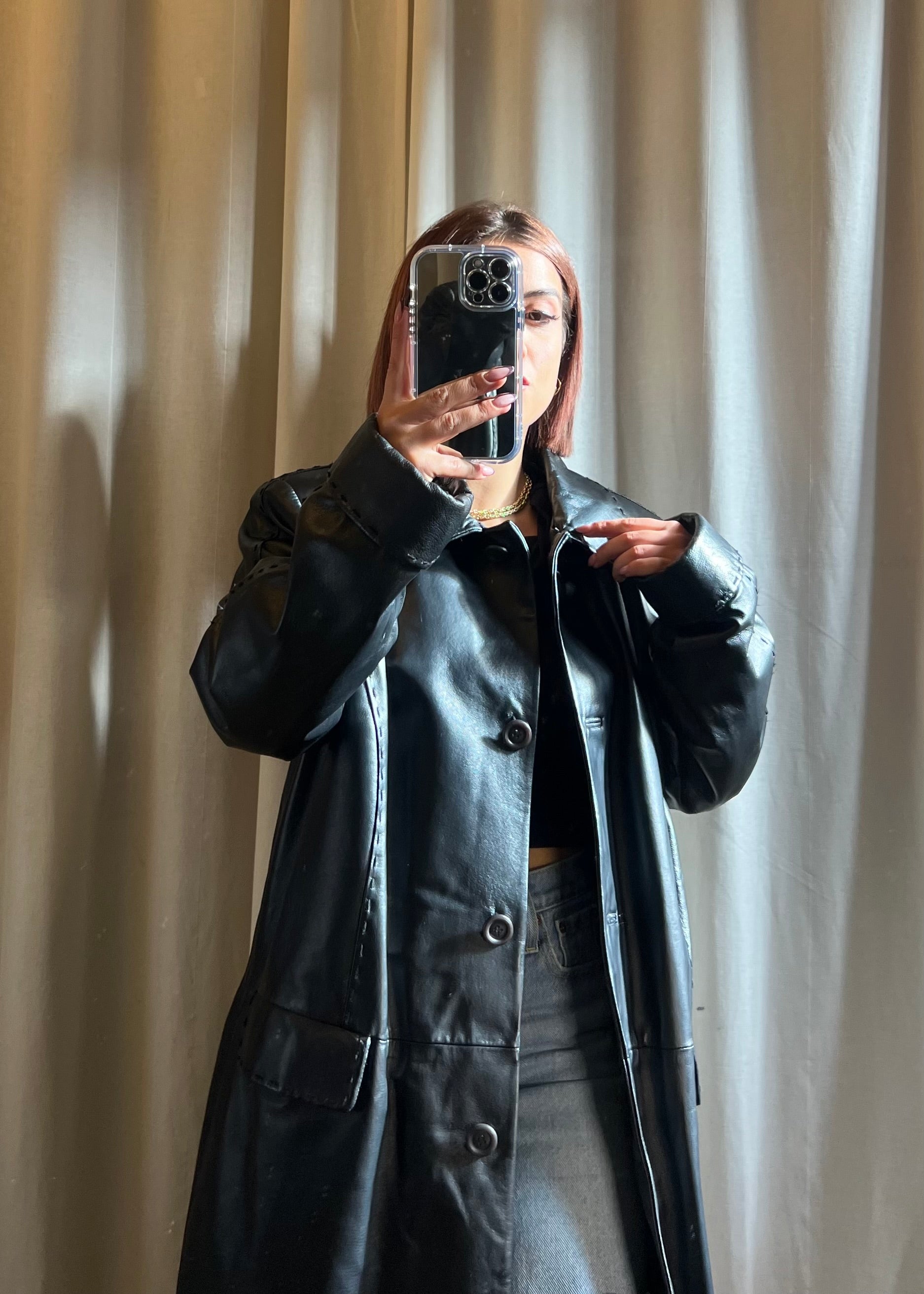 Giacca lunga in pelle nera, dal fascino super elegante e avvolgente.La pelle al tatto è morbida e di alta qualità, piacevole da indossare e perfetta per chi ama i capi in pelle che restano confortevoli addosso.Il modello è lungo, arriva sotto il ginocchio ed è ideale anche per la stagione invernale, soprattutto abbinato a maglioni o blazer sotto. In foto la vedete indossata da una taglia S; a seconda di come preferite la vestibilità, può arrivare fino a una taglia L (meglio se non troppo abbondante per mantenere la linea del modello).