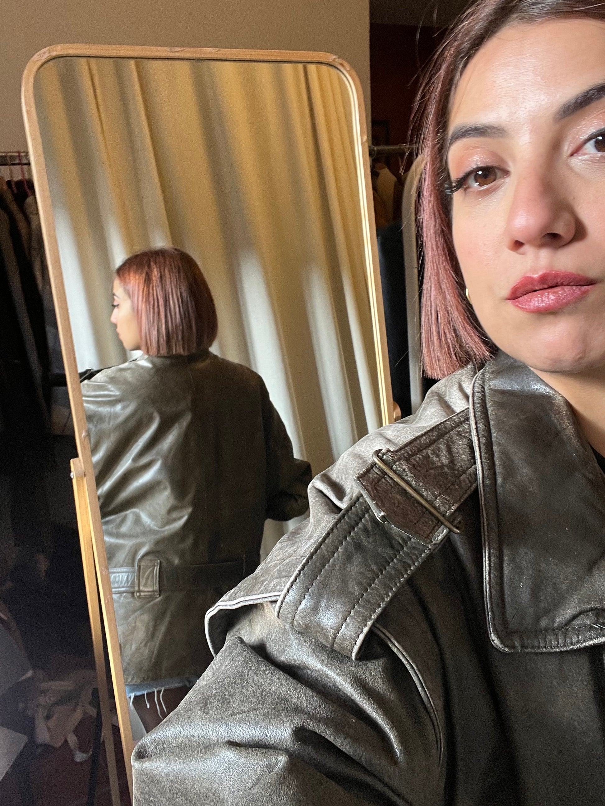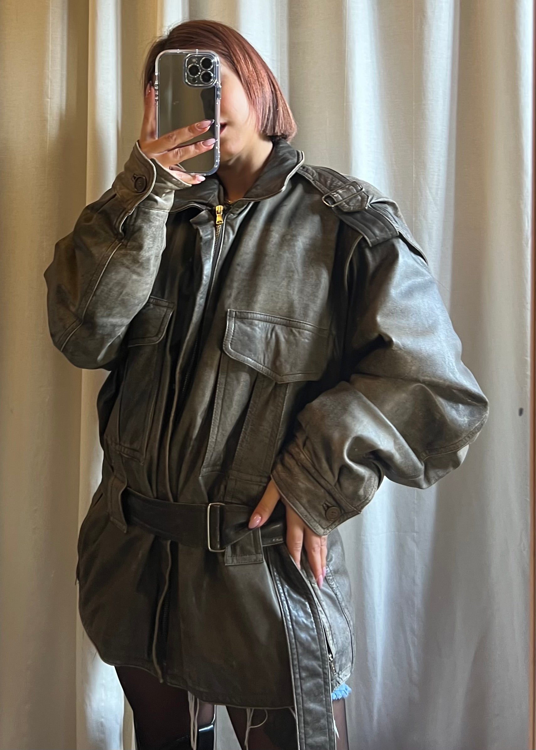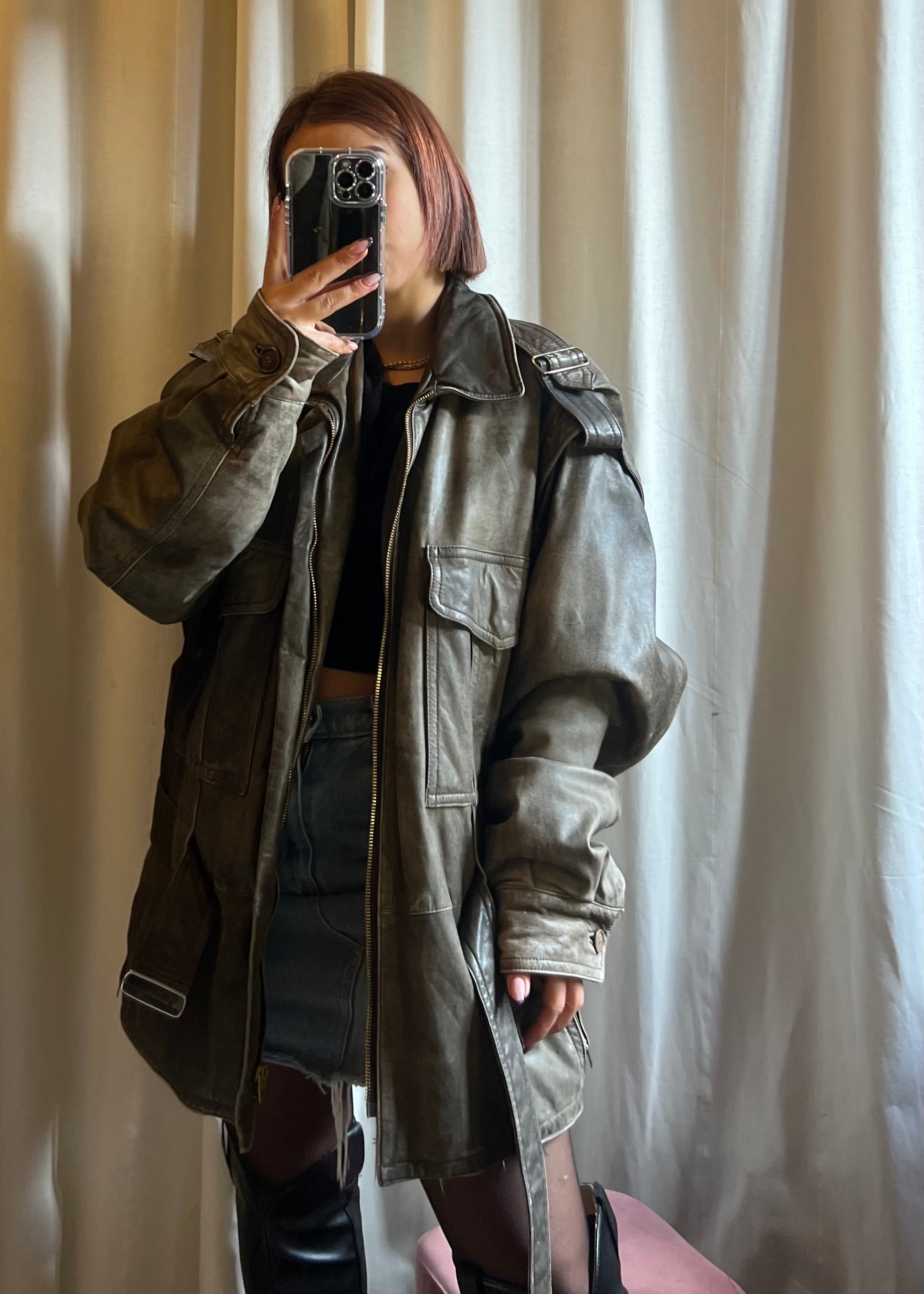 Giacca in pelle over in pieno stile Miu Miu, un capo dall’eleganza grintosa e contemporanea.