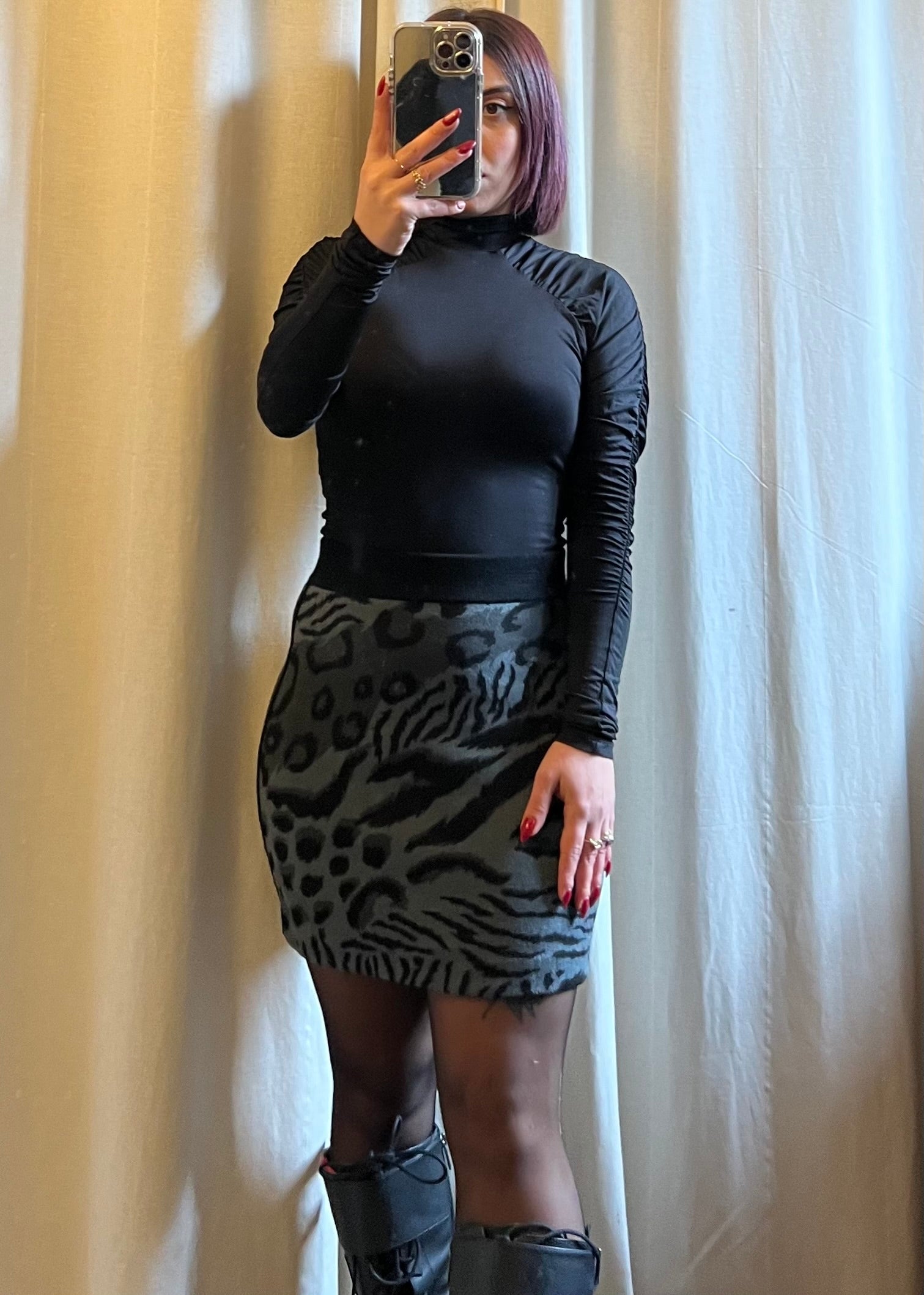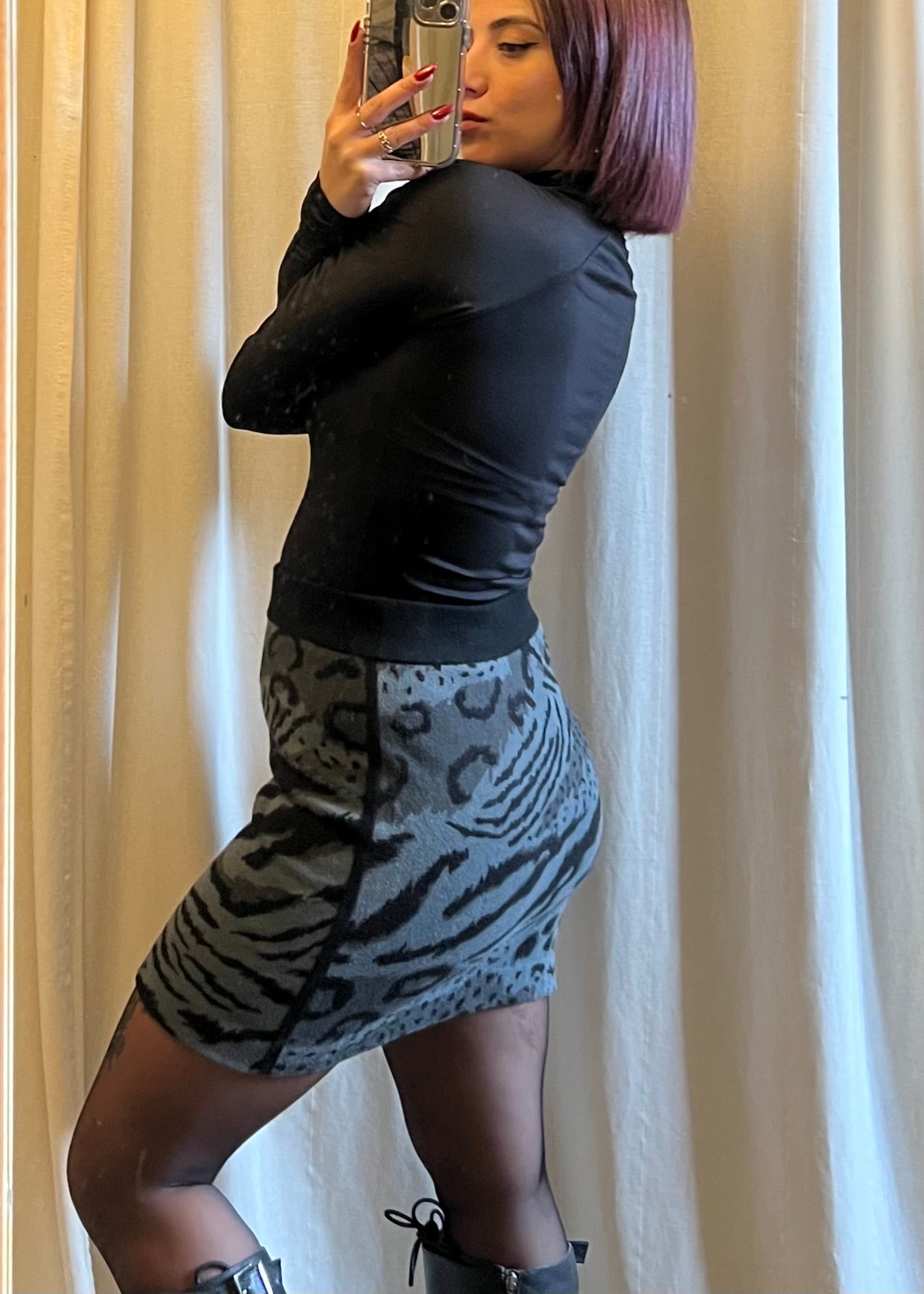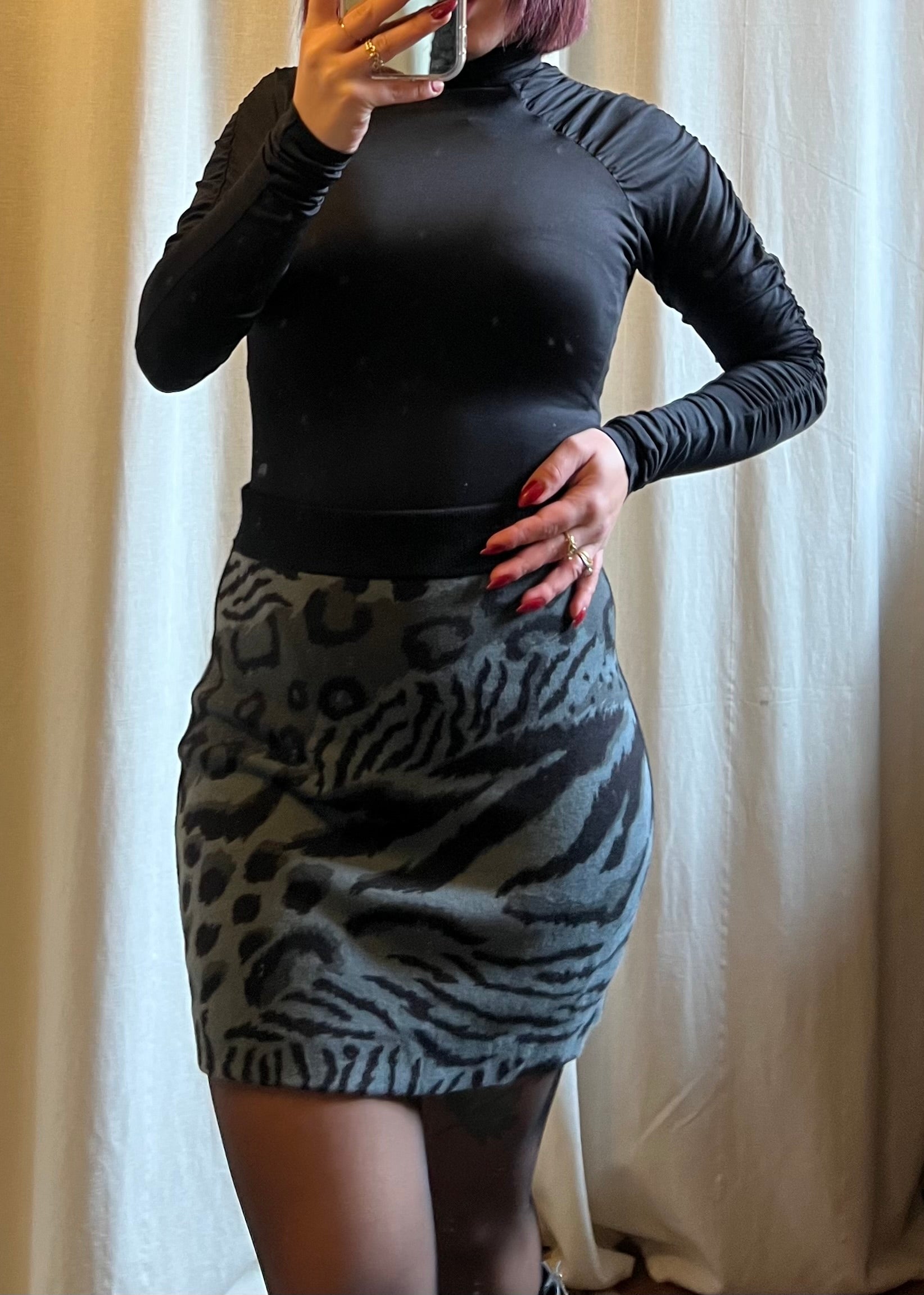 Gonna Kenzo a fantasia jungle, modello attillato, taglia M. In foto è indossata da una taglia S; grazie al tessuto semilastico il capo si modella perfettamente, consigliato fino a una taglia 42 piena. In ottime condizioni, l’etichetta è stata rimossa ma si tratta chiaramente di un capo in lana. Un pezzo unico, elegante e versatile, perfetto per aggiungere un tocco di colore e stile ai tuoi outfit.