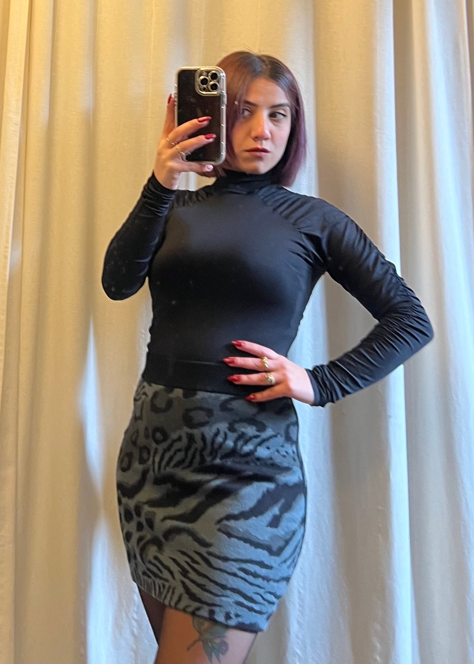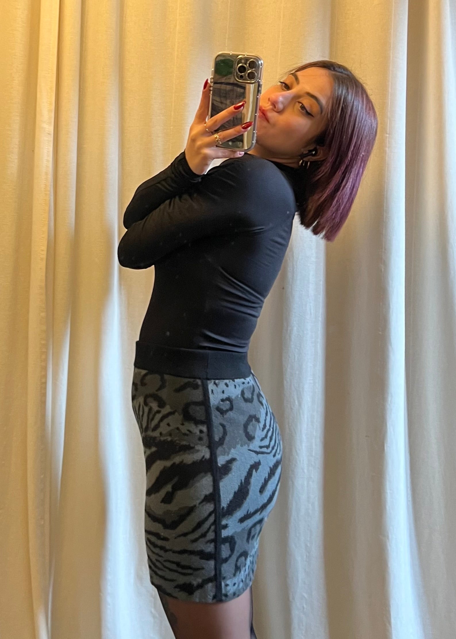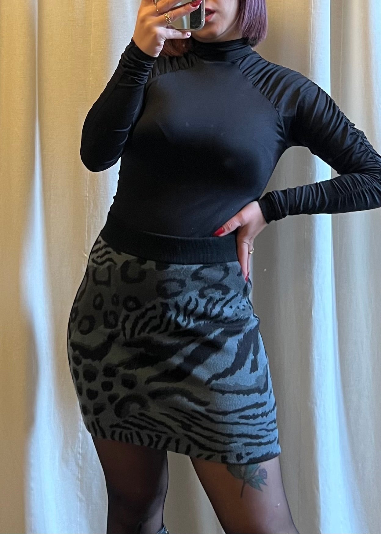 Gonna Kenzo a fantasia jungle, modello attillato, taglia M. In foto è indossata da una taglia S; grazie al tessuto semilastico il capo si modella perfettamente, consigliato fino a una taglia 42 piena. In ottime condizioni, l’etichetta è stata rimossa ma si tratta chiaramente di un capo in lana. Un pezzo unico, elegante e versatile, perfetto per aggiungere un tocco di colore e stile ai tuoi outfit.