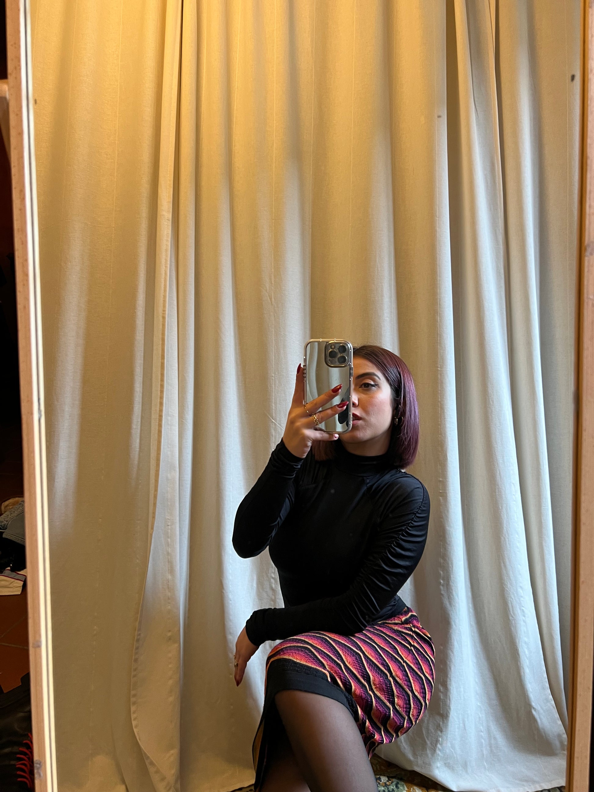 Gonna Missoni lunghezza midi, multicolor, realizzata nelle iconiche trame della Maison. In foto è indossata da una taglia S; grazie al tessuto elasticizzato, si adatta perfettamente al corpo e è consigliata fino a una taglia M piena. La composizione originale è stata rimossa perché dava fastidio durante l’uso, ma si tratta chiaramente di lana. Elegante, versatile e dal carattere distintivo, è il capo ideale per aggiungere colore e stile ai tuoi look.
