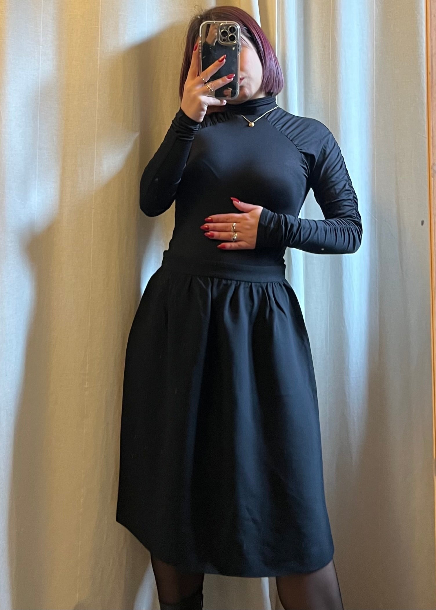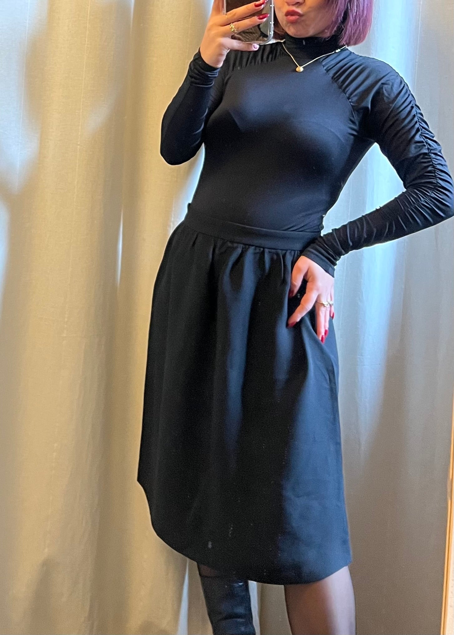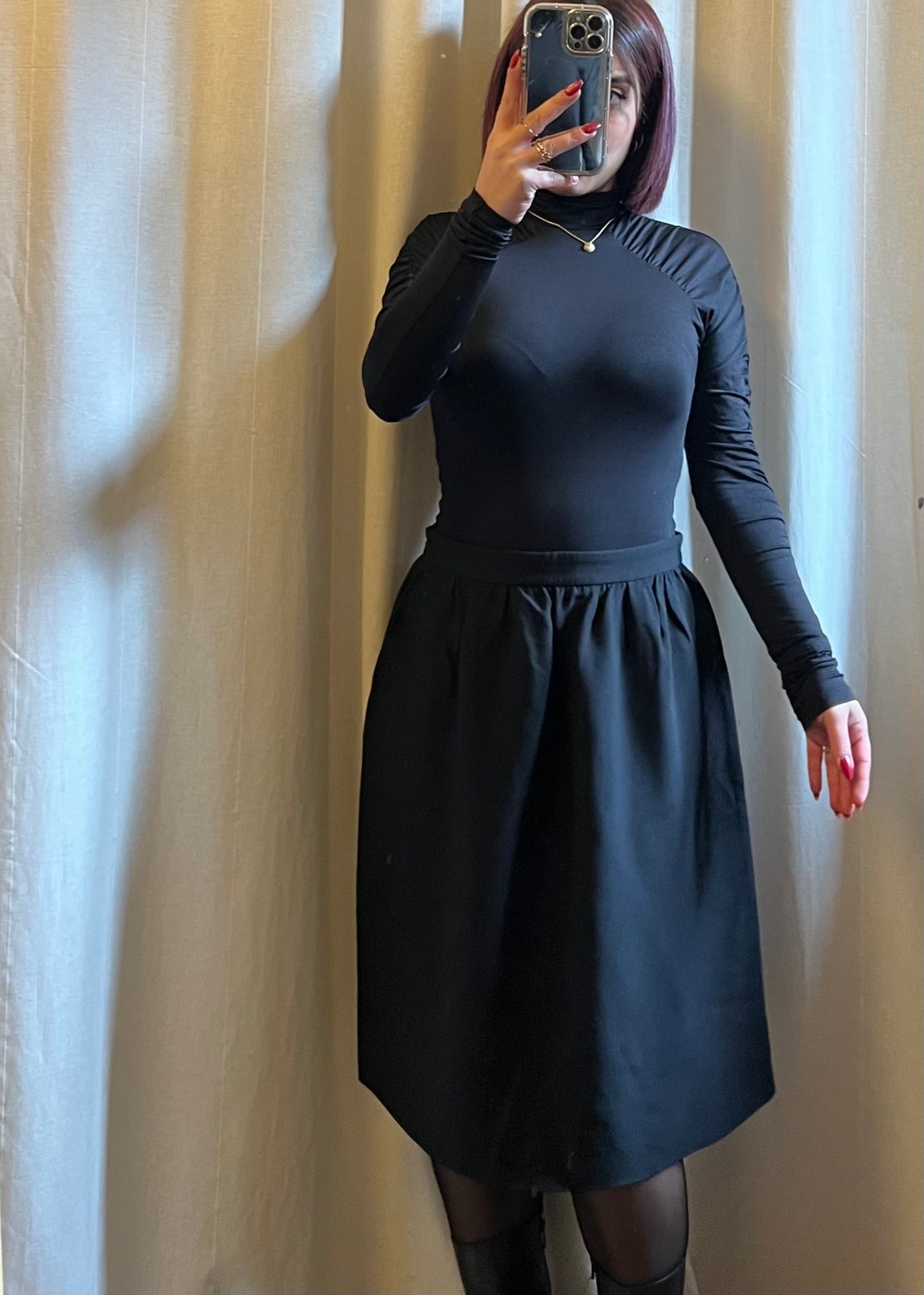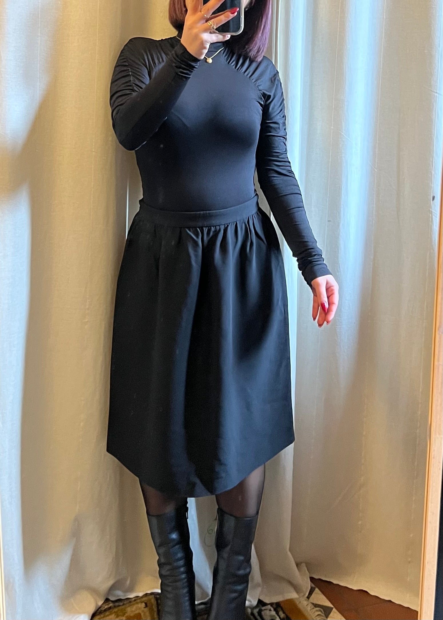 Gonna Miu Miu nera, un classico intramontabile dal fascino immediato. Il modello ampio, impreziosito da una fascia in vita, valorizza la silhouette e conferisce un’eleganza senza tempo, mentre la lunghezza midi rende il capo versatile e raffinato. In foto è indossata da una taglia S; la gonna è riportata come taglia 42, confermando la corretta vestibilità. Realizzata in 100% viscosa, comoda, morbida e perfetta da indossare in ogni occasione, è un pezzo iconico capace di trasformare anche il look più semplice in un outfit sofisticato e di grande stile.