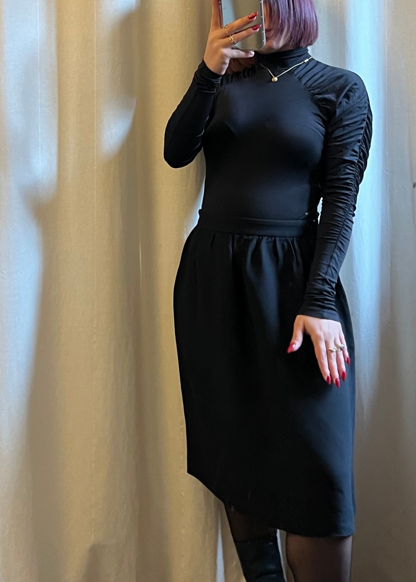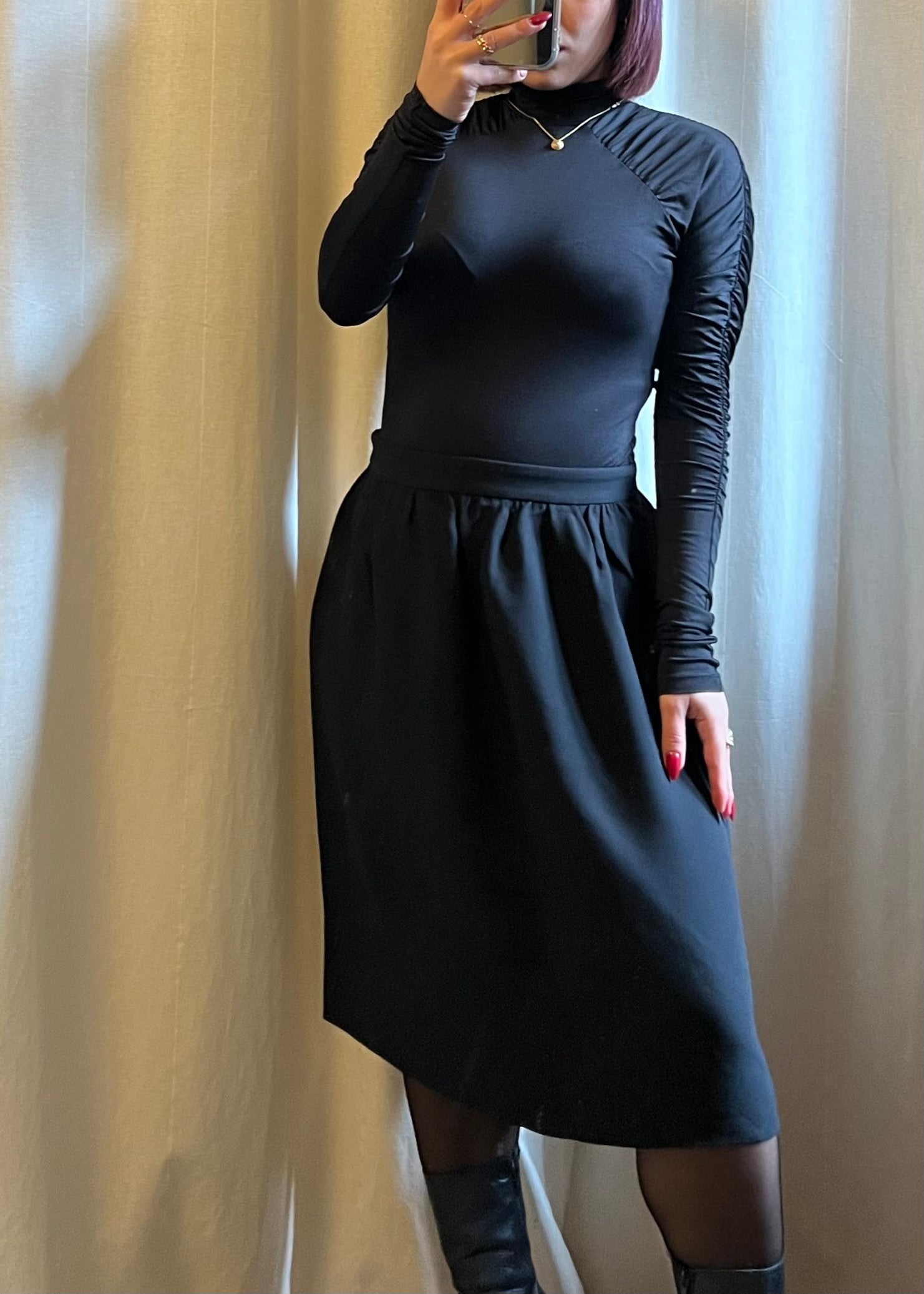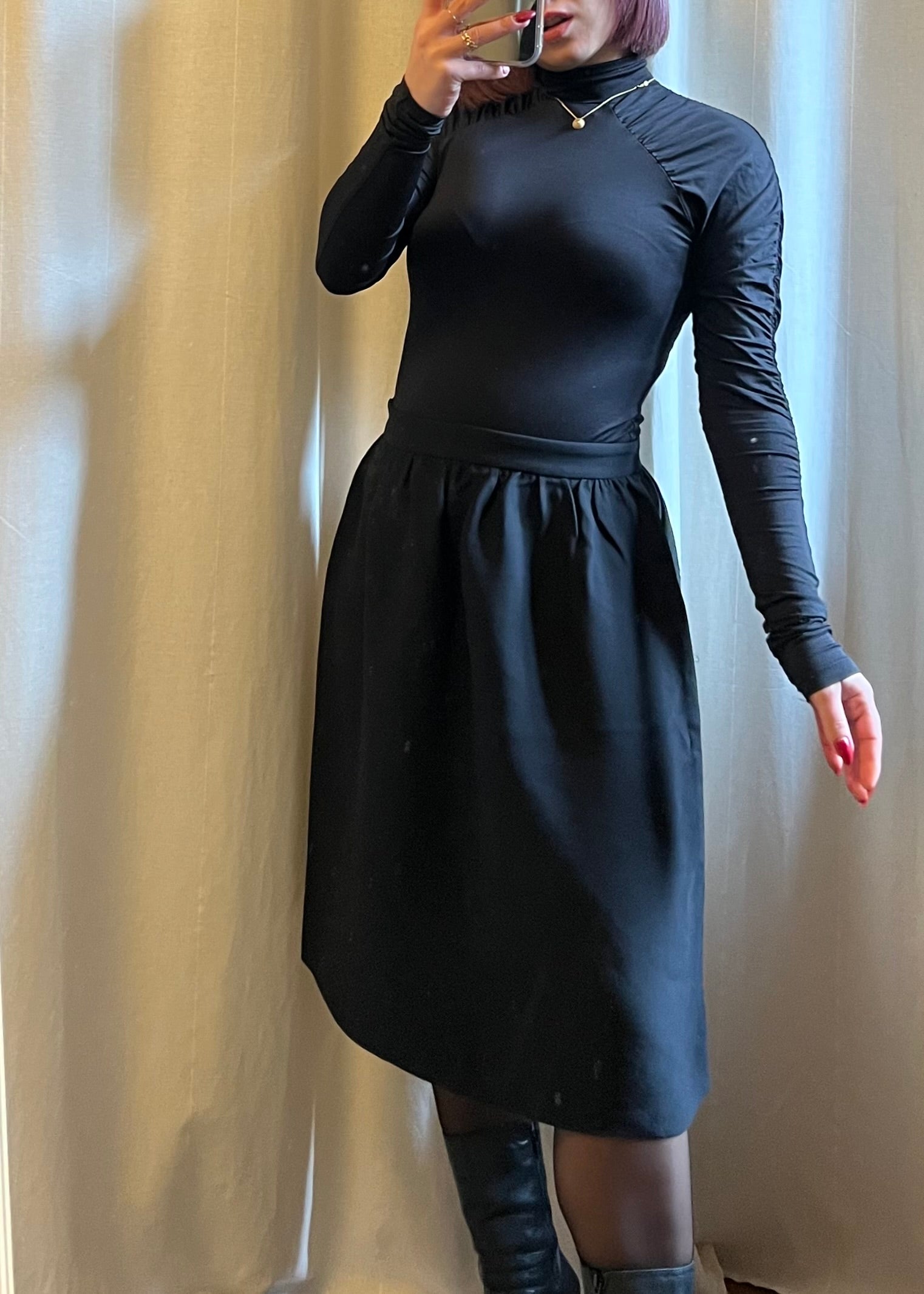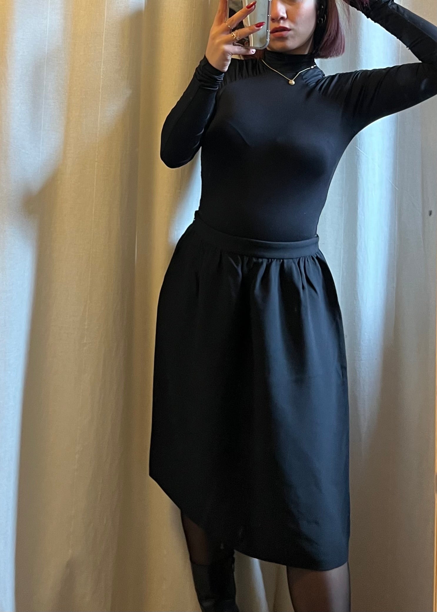 Gonna Miu Miu nera, un classico intramontabile dal fascino immediato. Il modello ampio, impreziosito da una fascia in vita, valorizza la silhouette e conferisce un’eleganza senza tempo, mentre la lunghezza midi rende il capo versatile e raffinato. In foto è indossata da una taglia S; la gonna è riportata come taglia 42, confermando la corretta vestibilità. Realizzata in 100% viscosa, comoda, morbida e perfetta da indossare in ogni occasione, è un pezzo iconico capace di trasformare anche il look più semplice in un outfit sofisticato e di grande stile.