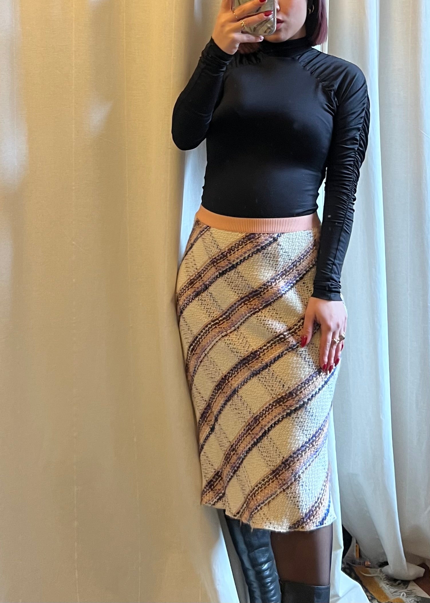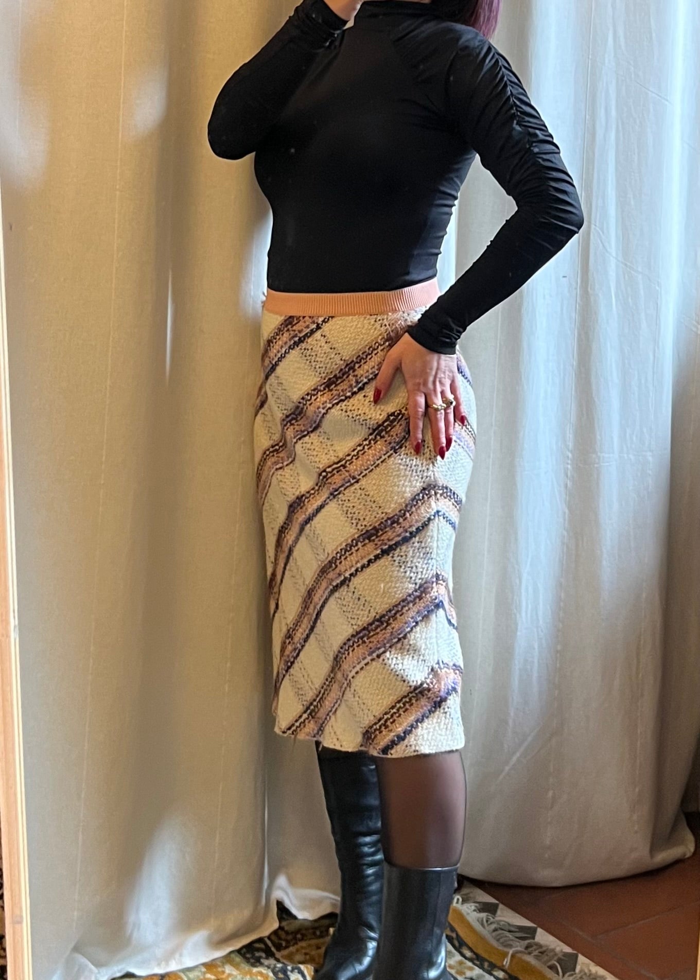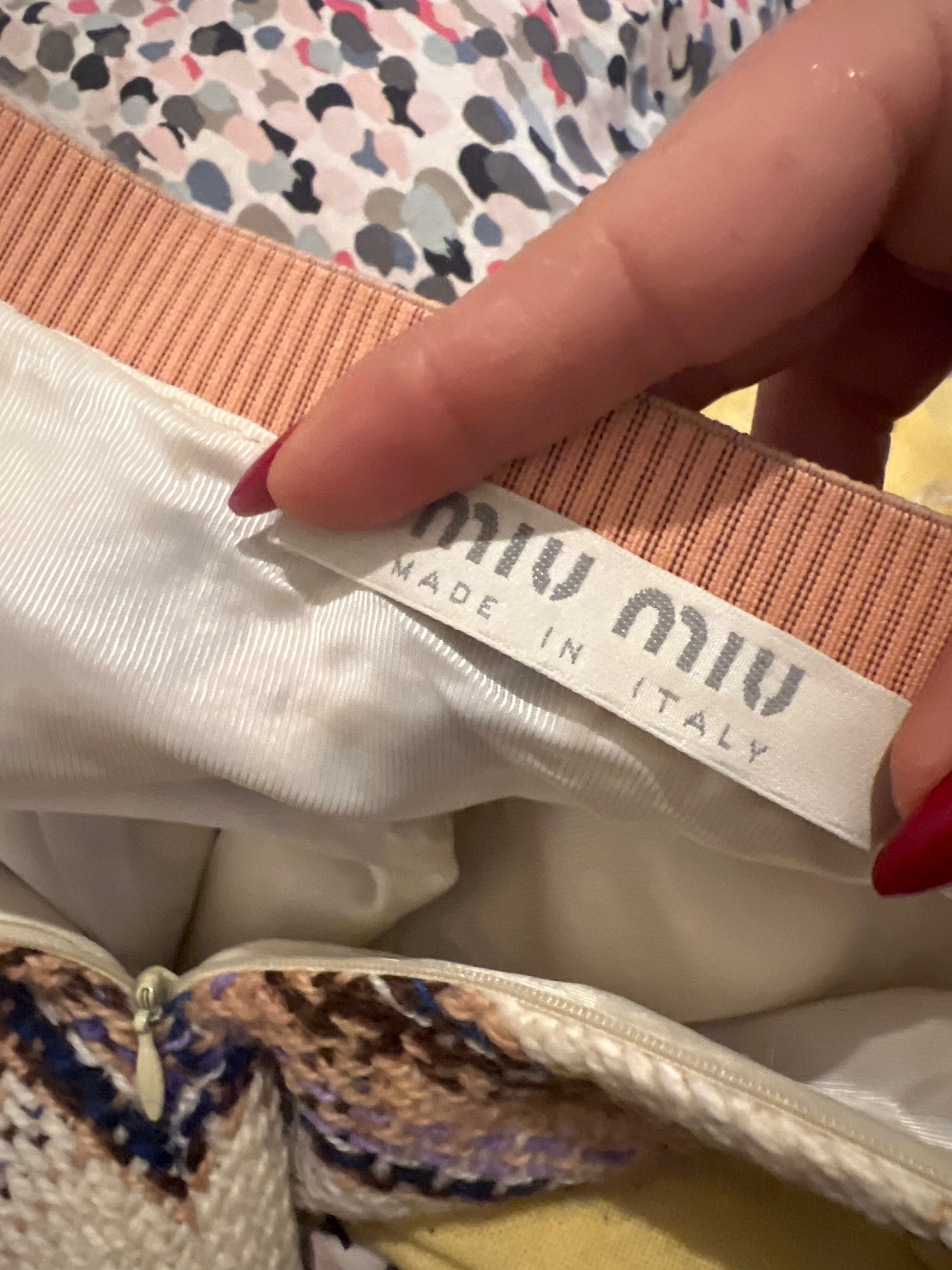 Gonna modello lunghetto Miu Miu, in 100% lana vergine, a quadri con base bianca, fascia rosa e dettagli multicolor. Bellissima e in condizioni eccellenti, unisce eleganza e stile contemporaneo. In foto è indossata da una taglia S; la gonna è riportata come taglia 42 e confermo la corretta vestibilità. Un capo versatile e raffinato, perfetto per look chic e colorati.
