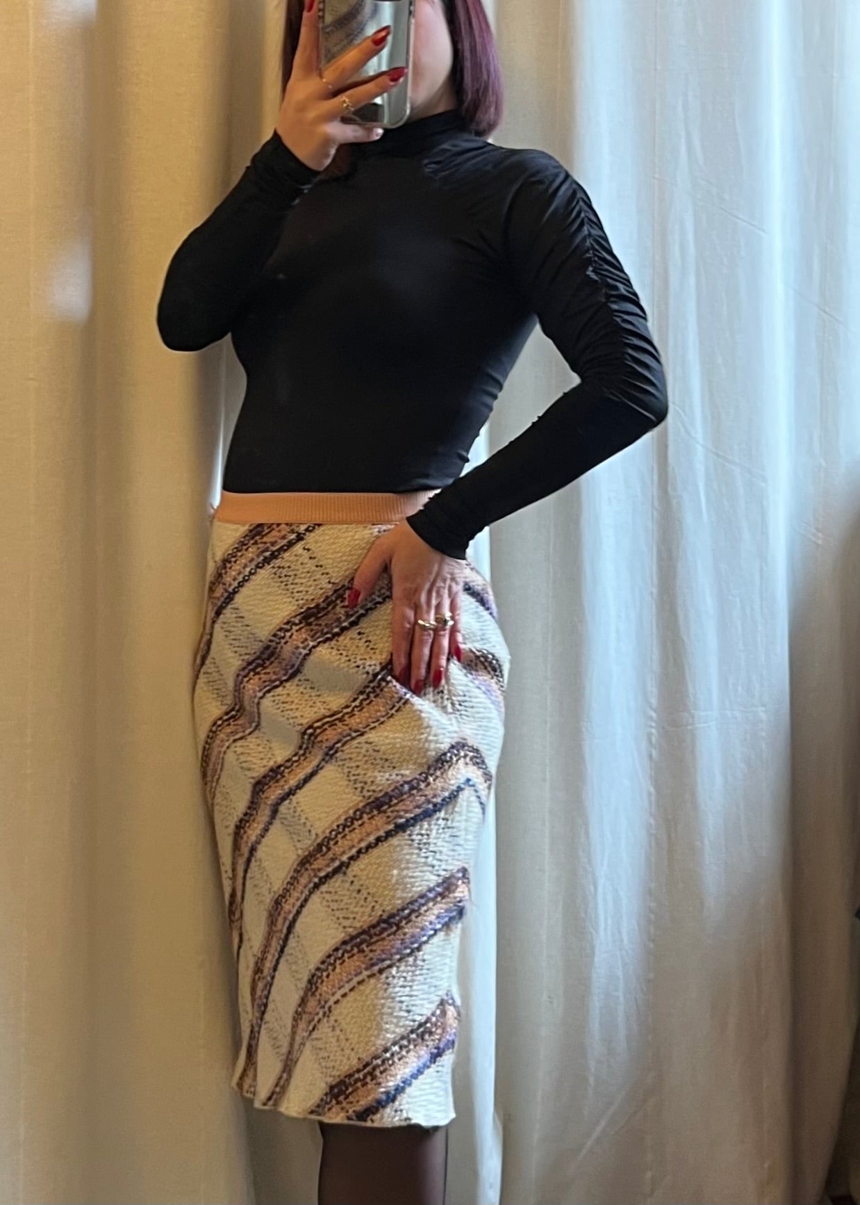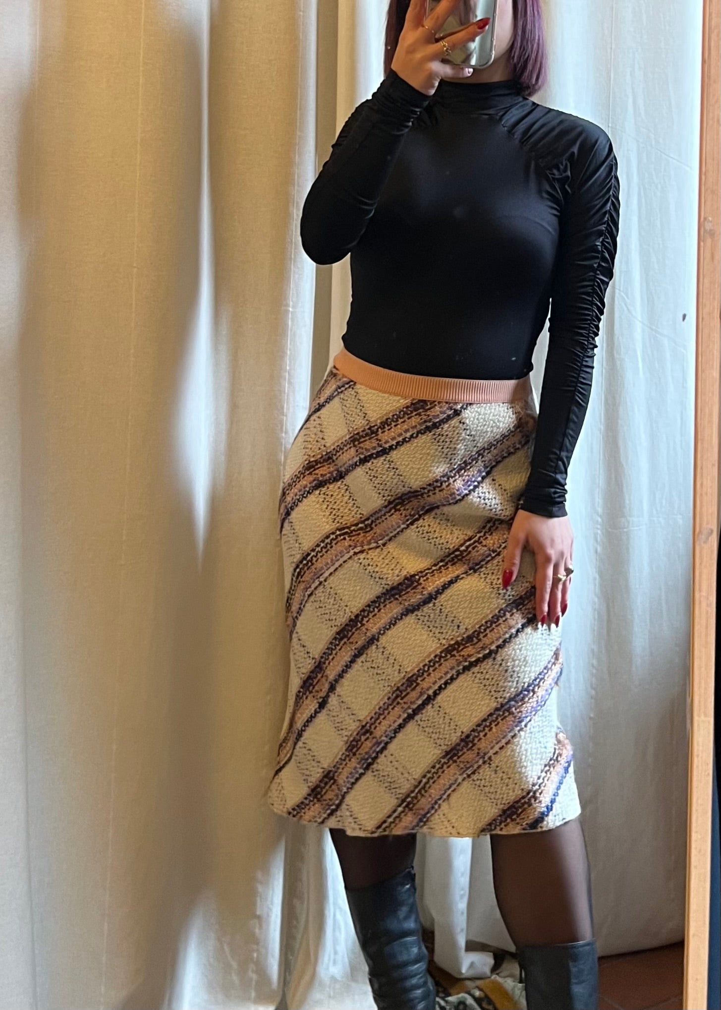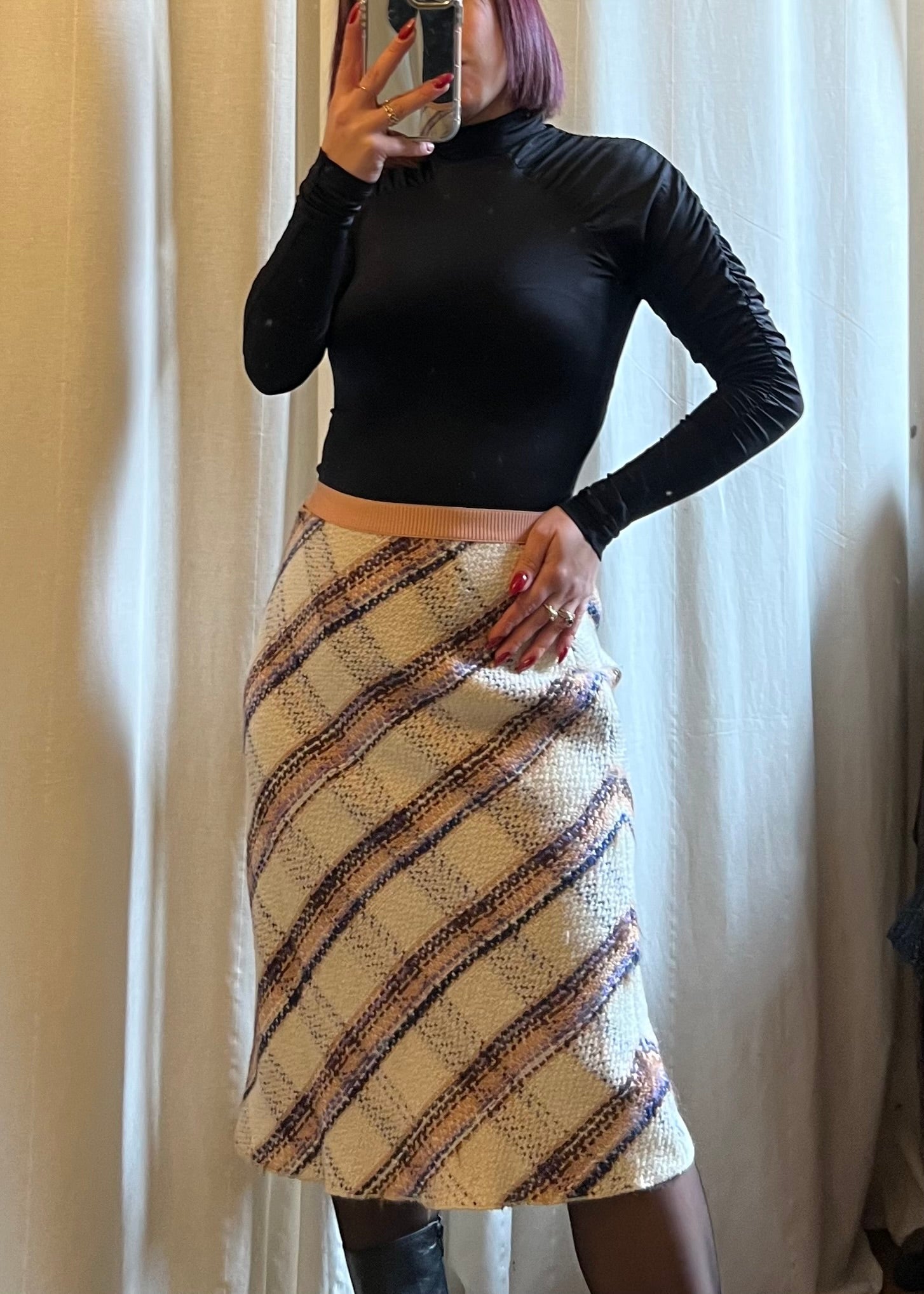 Gonna modello lunghetto Miu Miu, in 100% lana vergine, a quadri con base bianca, fascia rosa e dettagli multicolor. Bellissima e in condizioni eccellenti, unisce eleganza e stile contemporaneo. In foto è indossata da una taglia S; la gonna è riportata come taglia 42 e confermo la corretta vestibilità. Un capo versatile e raffinato, perfetto per look chic e colorati.