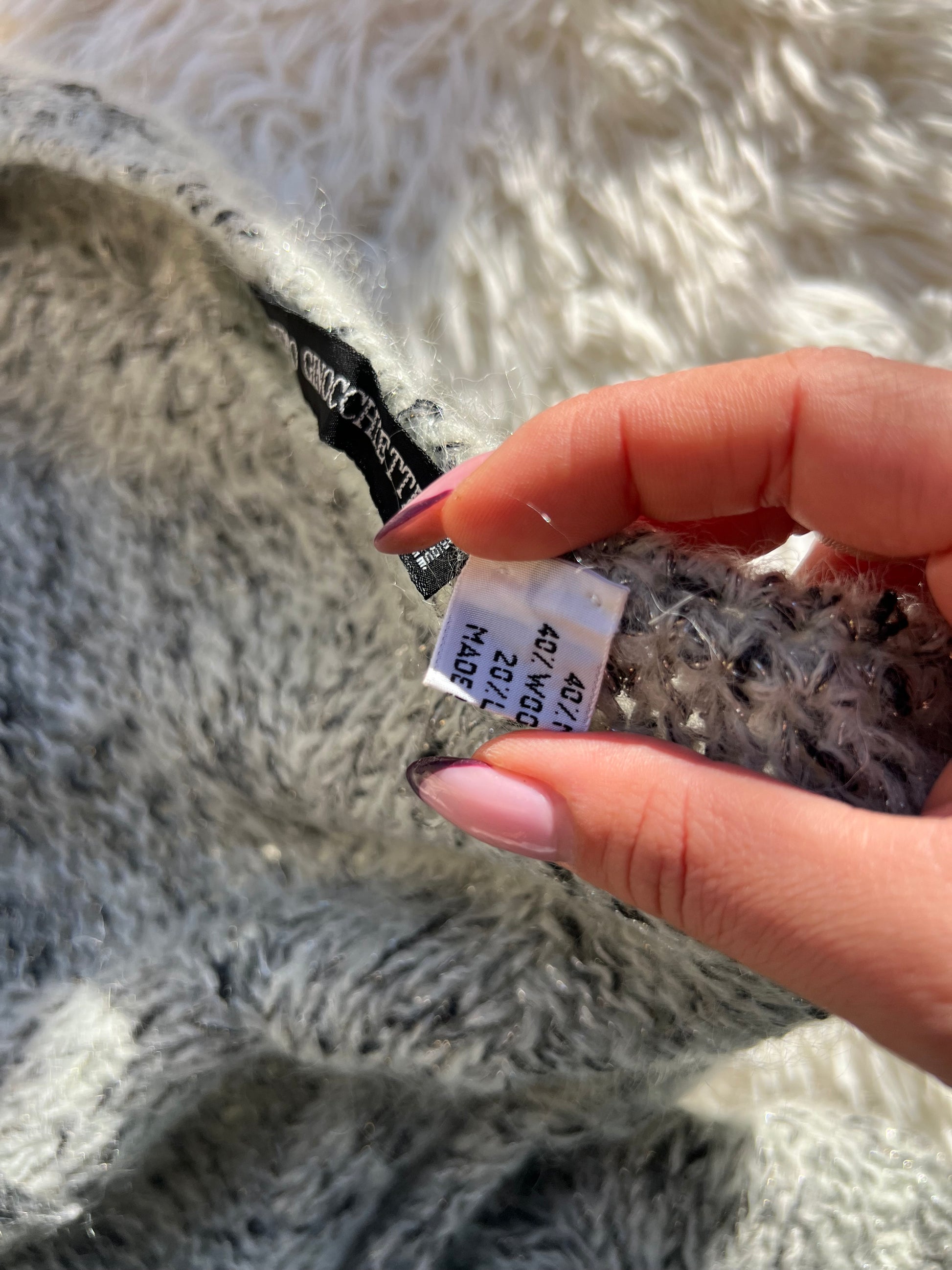 Il capo è impreziosito da delicati fili metallici argentati, che aggiungono luminosità e un tocco sofisticato senza risultare eccessivi.