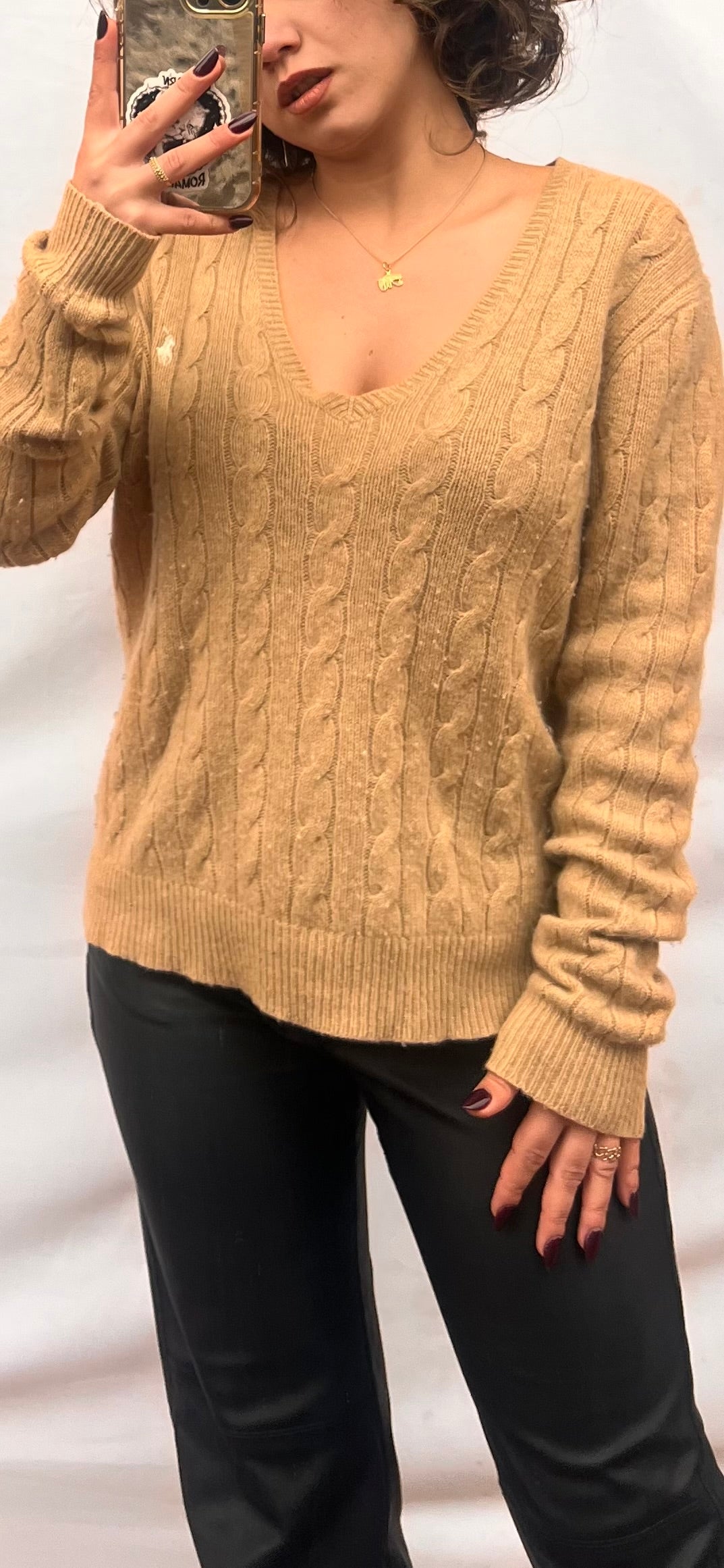 Il maglione a trecce Ralph Lauren è un capo intramontabile, simbolo di eleganza casual e stile raffinato. Realizzato in beige chiaro, il maglione presenta una lavorazione a trecce che aggiunge texture e movimento al tessuto, donando al capo un aspetto sofisticato ma accogliente.Il collo a V offre una scollatura delicata, perfetta per essere indossato da solo o sopra una camicia per un look più formale. Il logo Ralph Lauren ricamato sul petto, in modo discreto ma distintivo, aggiunge un tocco di classe senza sopraffare il design pulito del maglione. Realizzato con materiali di alta qualità, il maglione è morbido e confortevole, ideale per le giornate più fresche. La sua versatilità lo rende perfetto per ogni occasione, da un’uscita casual a un abbinamento più elegante con pantaloni o gonne. Un classico senza tempo che trasmette l’heritage di Ralph Lauren. In etichetta è riportata la taglia L in foto lo vedete indossato da una taglia S, consiglio fino alla taglia 44 piena