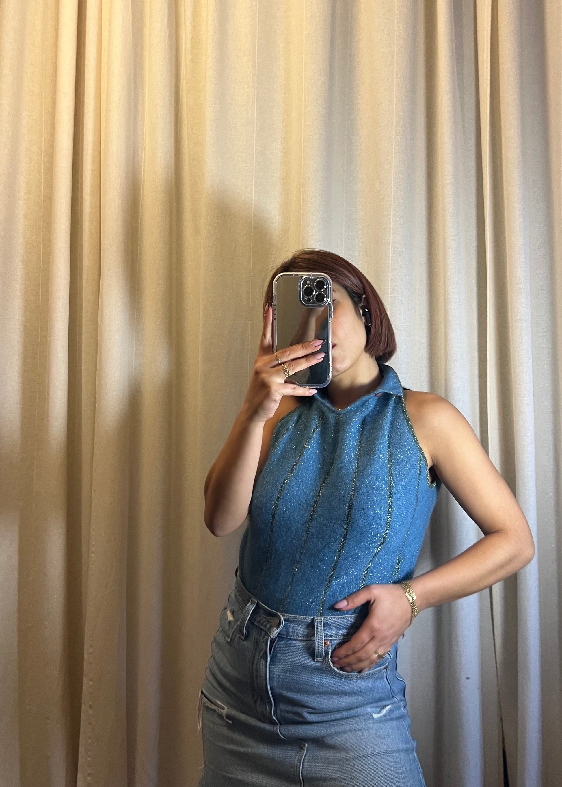 Maglioncino smanicato azzurro modello lupetto, in morbida lana d’angora, elegante e super versatile.