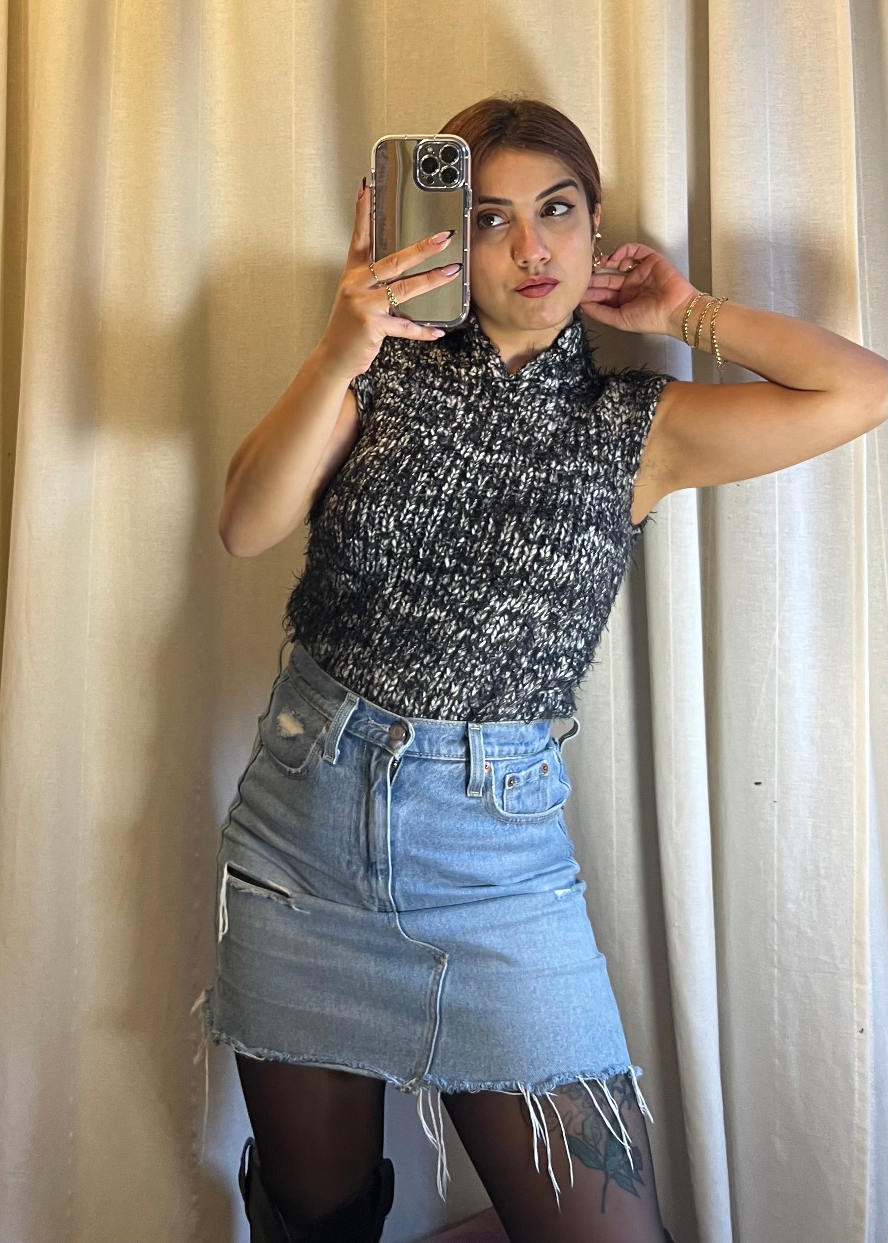 Maglione vintage smanicato con collo alto che arriva a metà collo, elegante e unico nel suo genere.