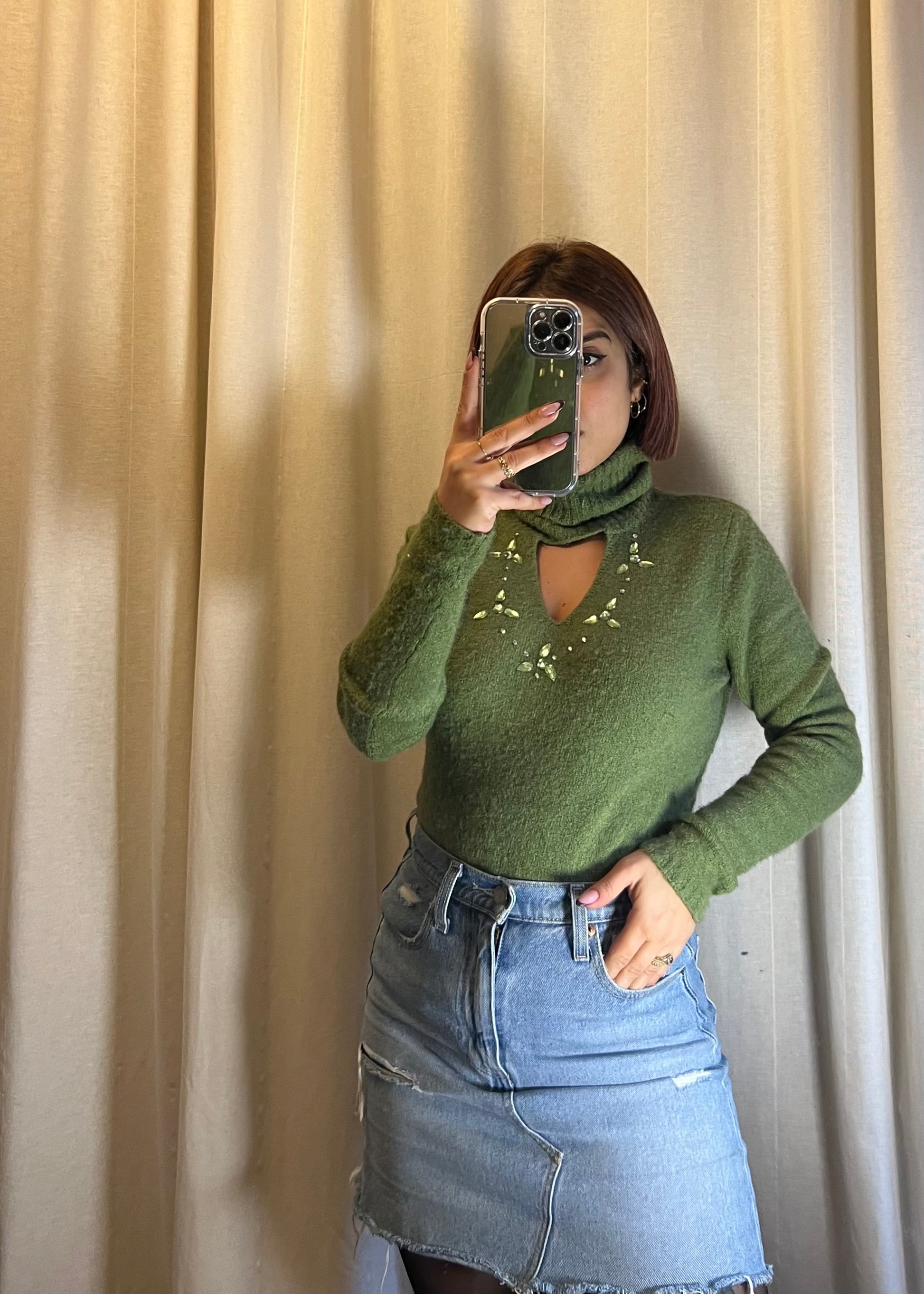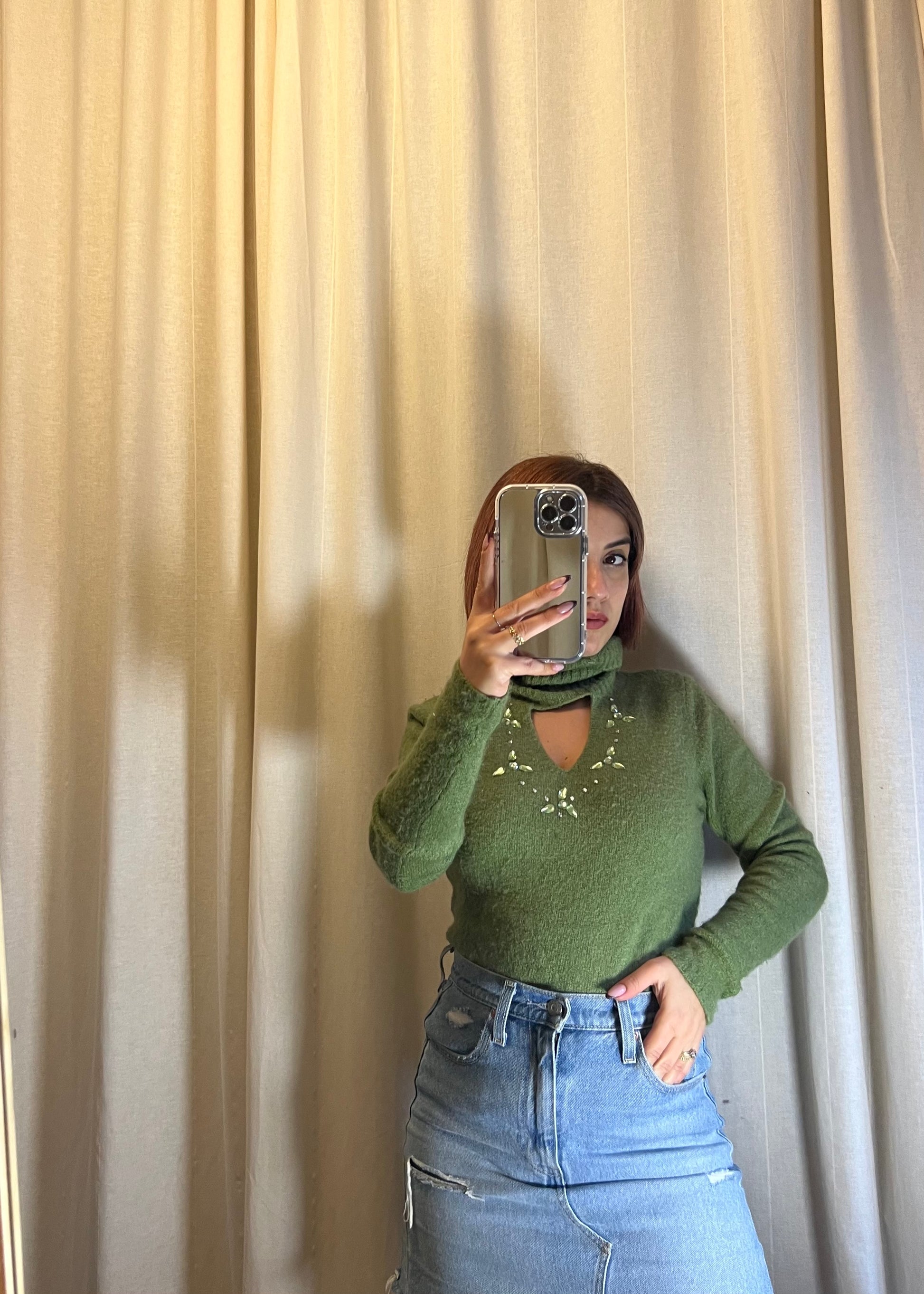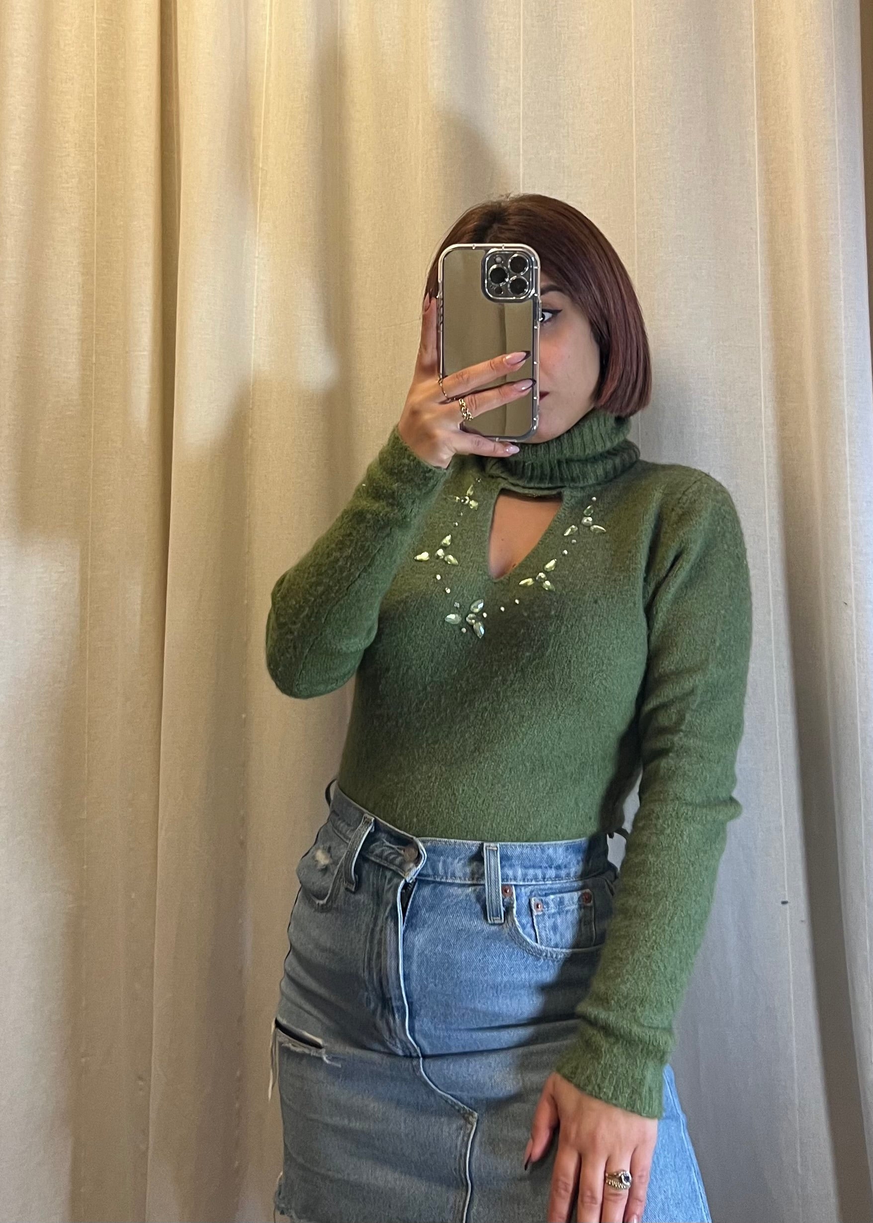maglioncino in lana verde, dal collo alto e dal design elegante, perfetto per valorizzare la silhouette.