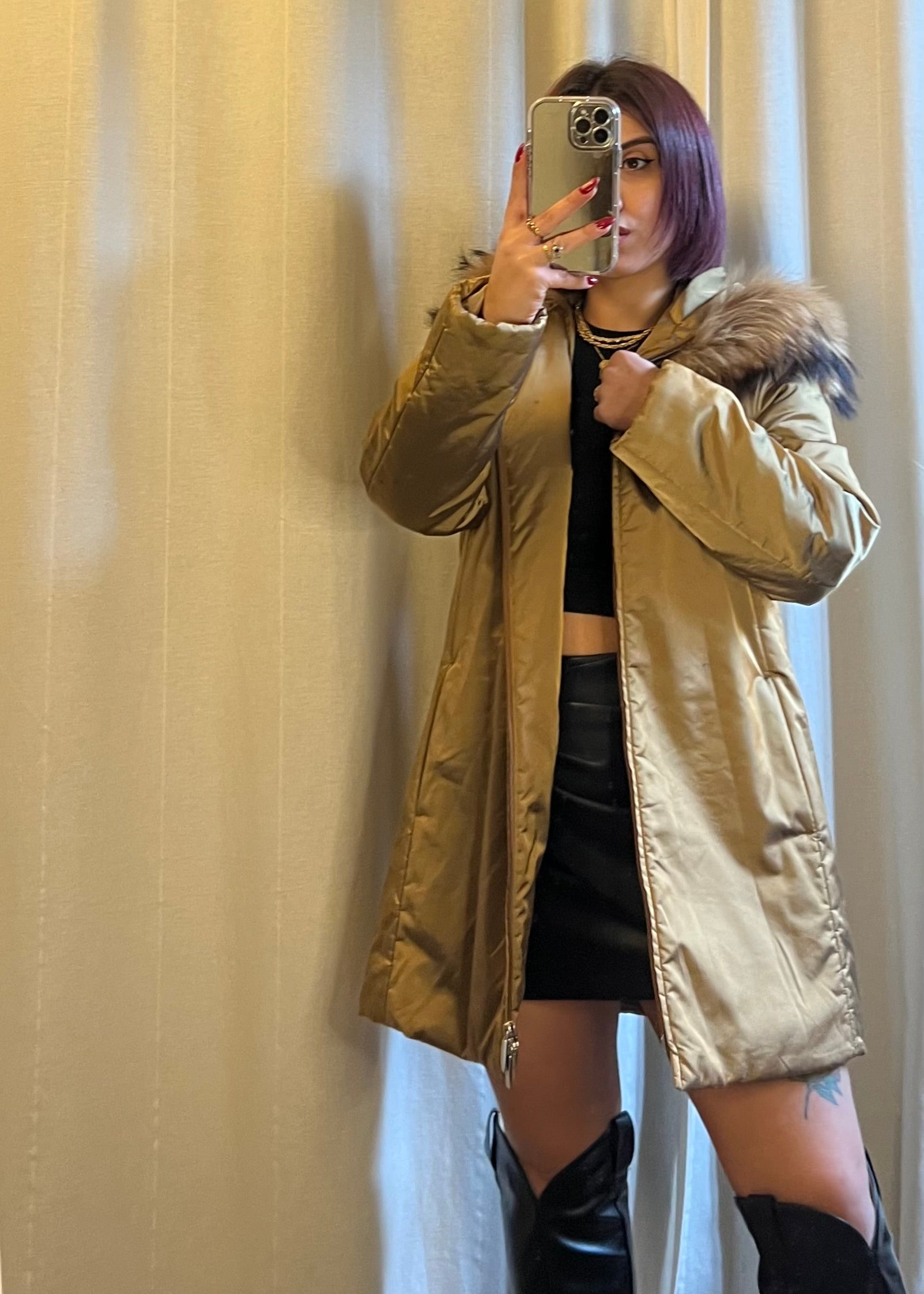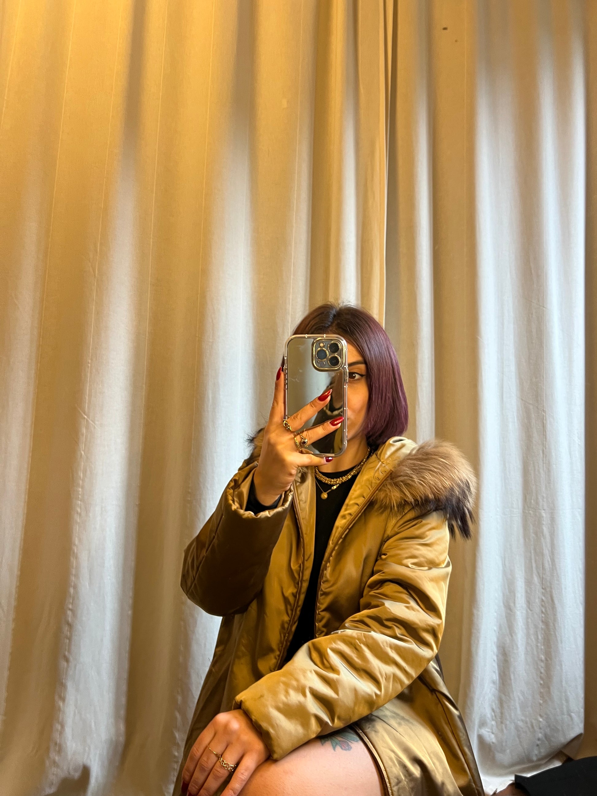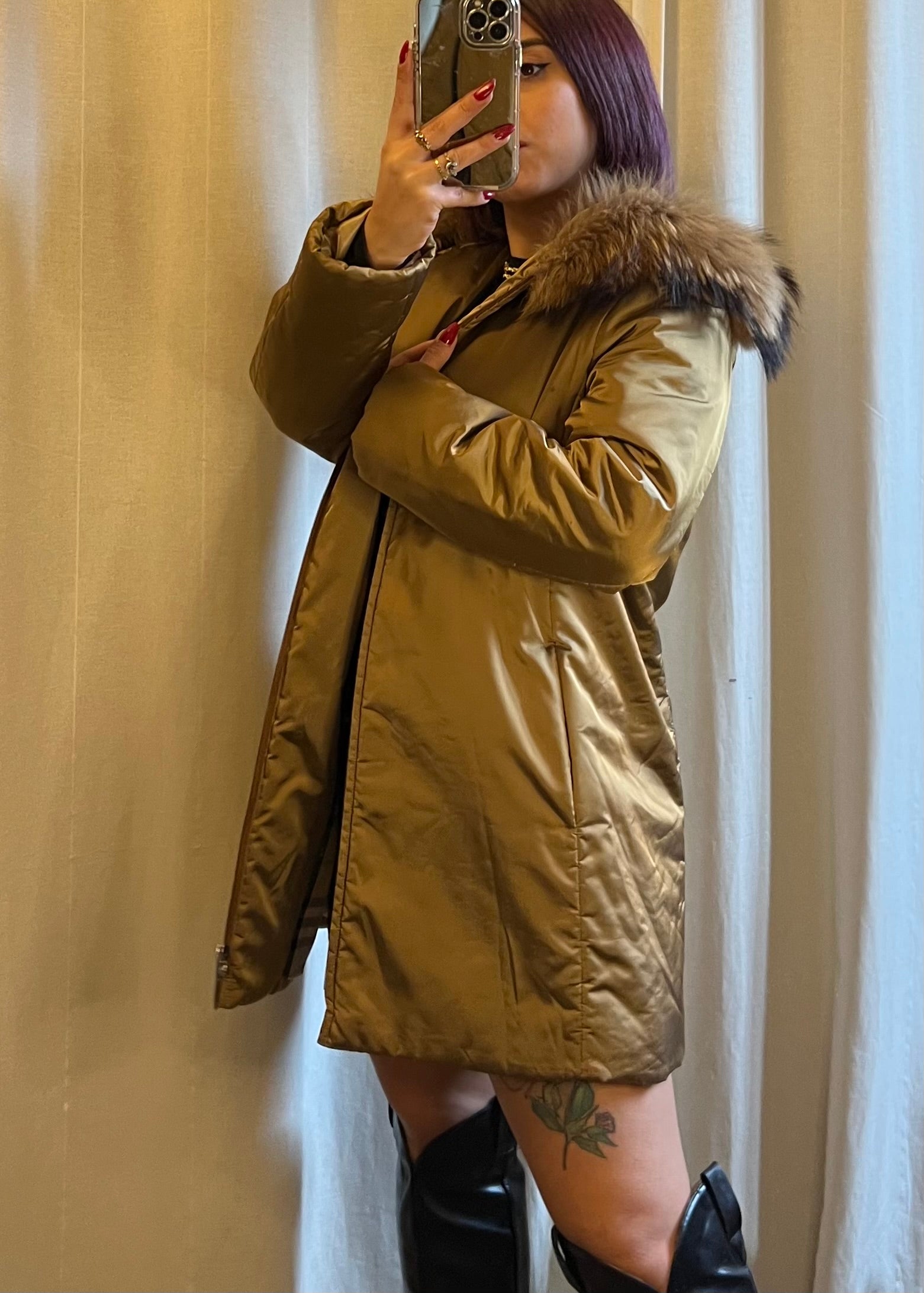 Piumino Burberry con cappuccio, un capospalla di rara raffinatezza che fonde funzionalità e lusso senza tempo. L’esterno metallizzato sfuma tra il verde e l’oro, catturando la luce con un effetto prezioso e sofisticato, mentre l’interno in iconico tartan check aggiunge il tocco distintivo e immediatamente riconoscibile della Maison. Il tiralampo logato Burberry impreziosisce il capo con un dettaglio di lusso discreto. Il modello, che arriva poco sopra il ginocchio, è completato da un cappuccio arricchito da una morbida pelliccia che si trasforma in una sorta di sciarpa avvolgente, unendo stile e protezione dal freddo. In foto è indossato da una taglia S; la vestibilità consigliata arriva fino alla taglia 42 piena. In condizioni ottime, questo piumino è un vero statement di eleganza e raffinatezza, ideale per chi desidera affrontare l’inverno con glamour e la qualità incomparabile del Made in England firmato Burberry.