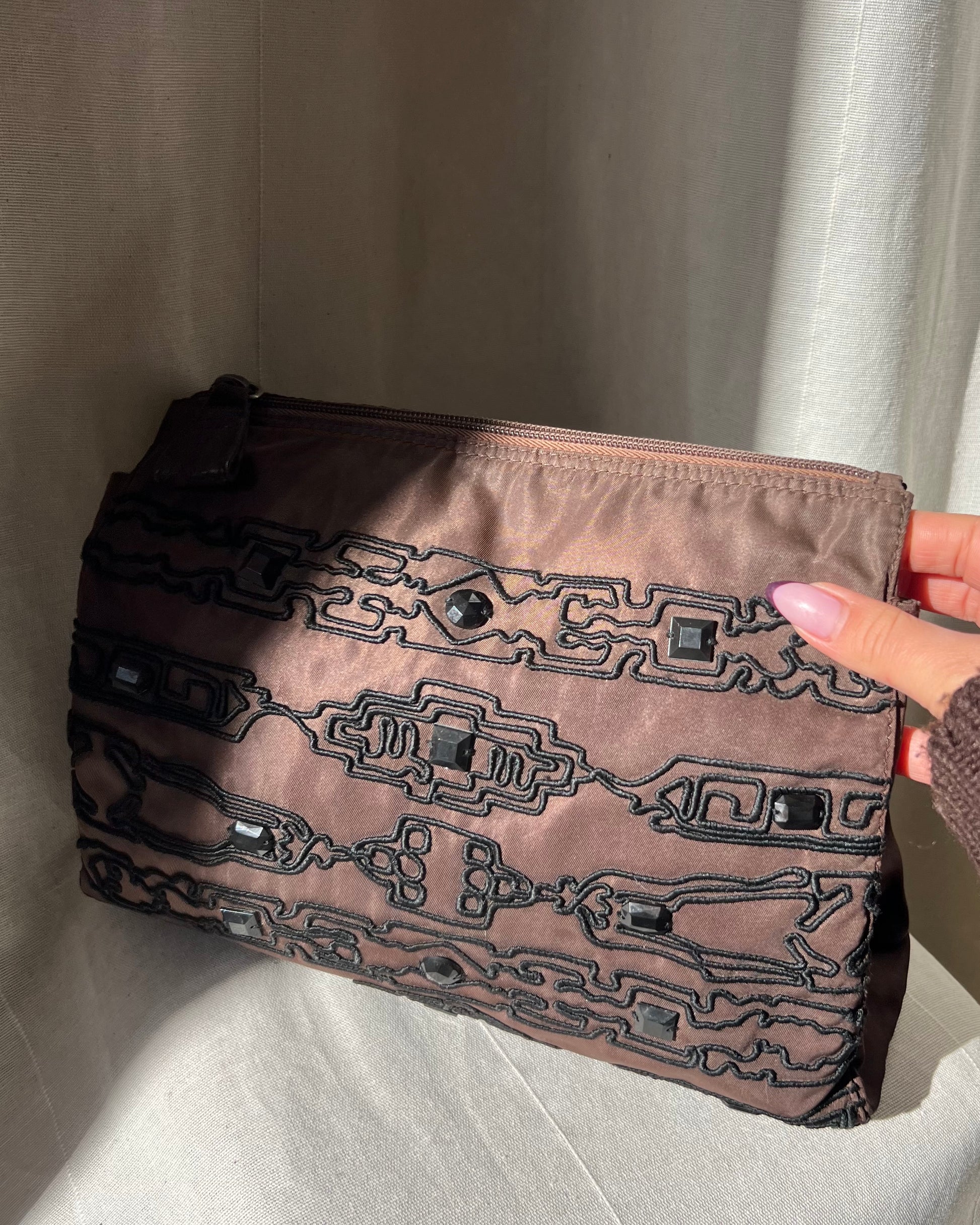 Un vero gioiello vintage, questa pochette Prada degli anni ’80 unisce il classico nylon marrone a raffinati inserti in cordoncino e pietre, creando un dettaglio unico e sofisticato. La chiusura con cerniera garantisce praticità e sicurezza, mentre le condizioni ottime rendono questo pezzo perfetto per collezionisti o per chi desidera un accessorio elegante e senza tempo.