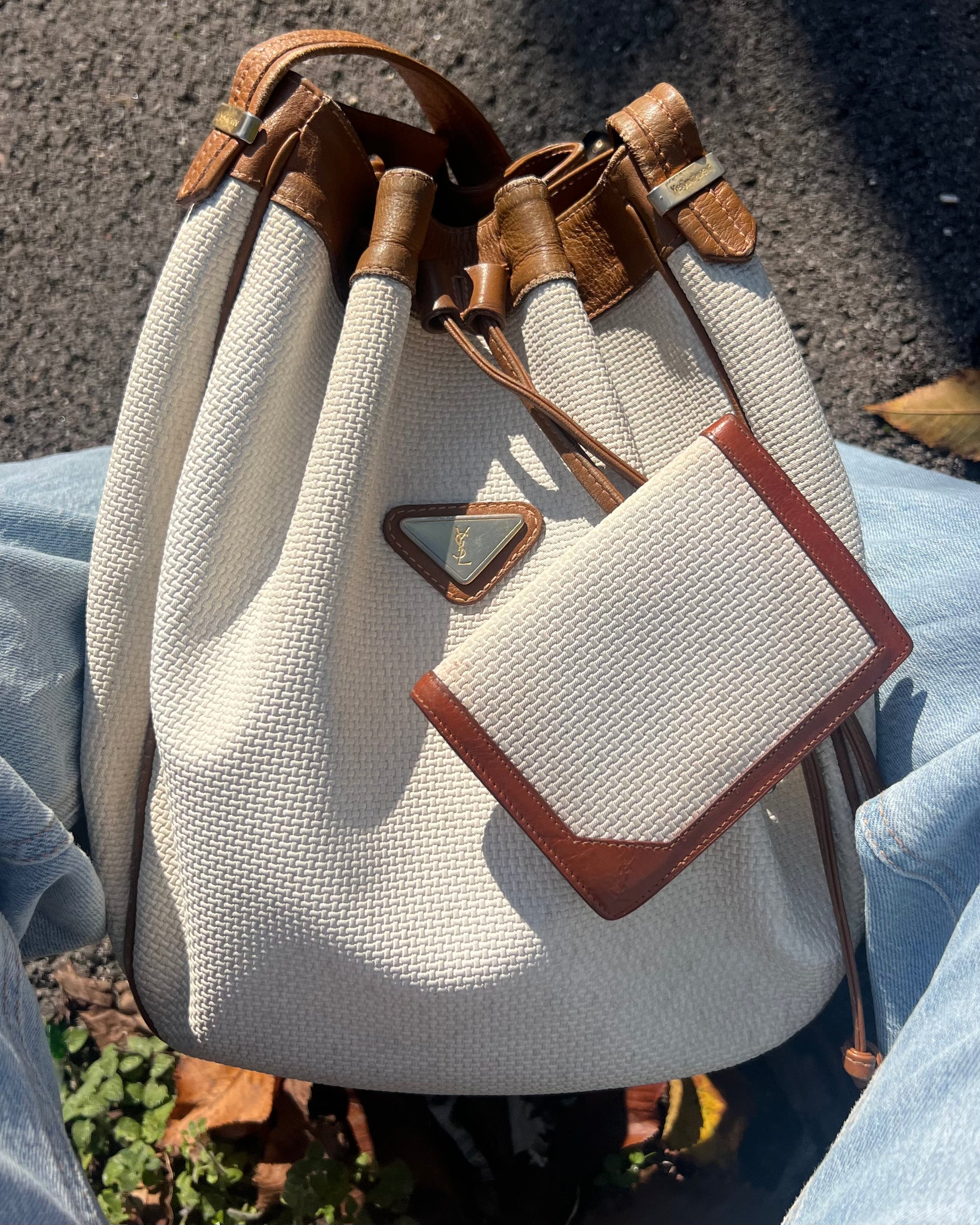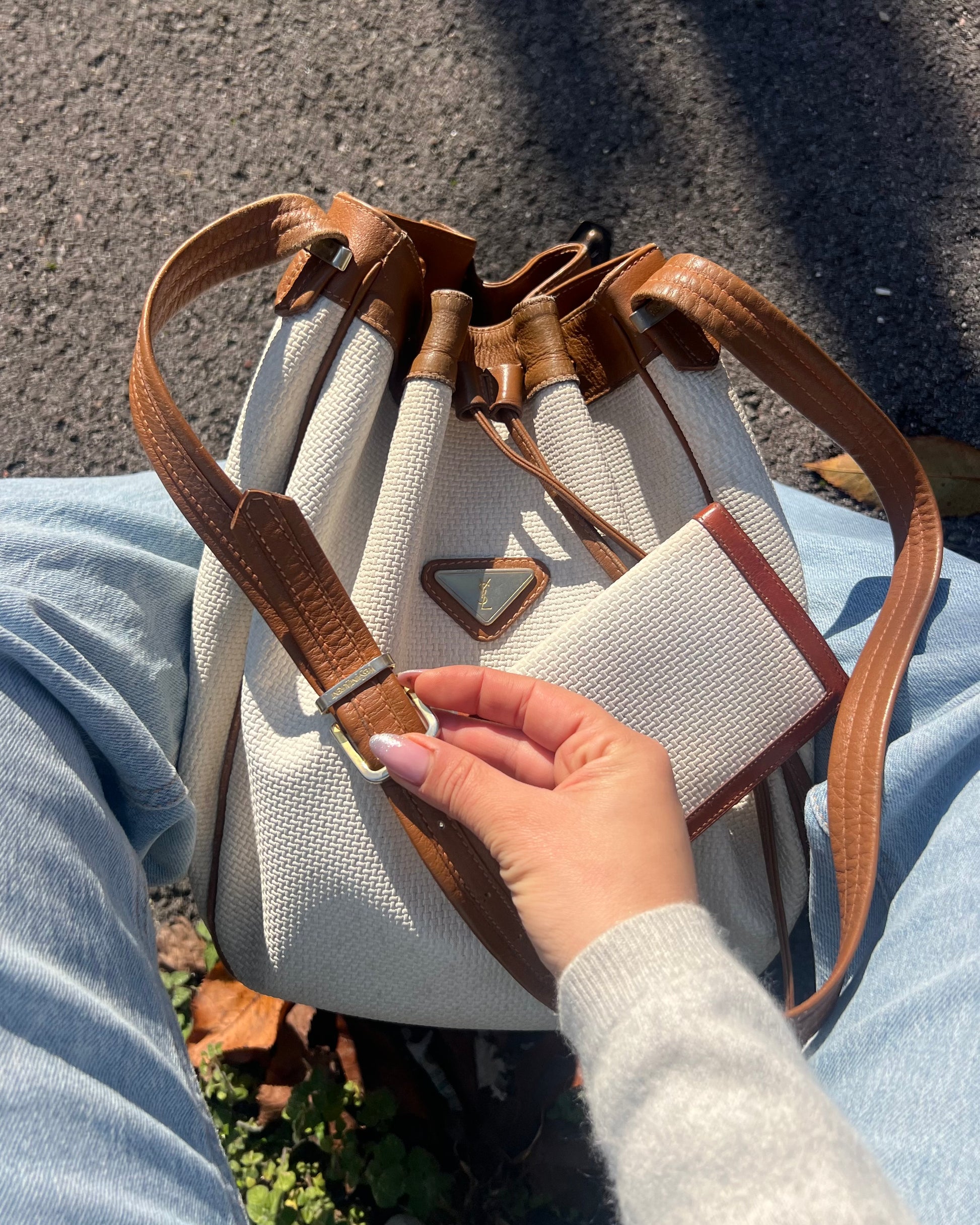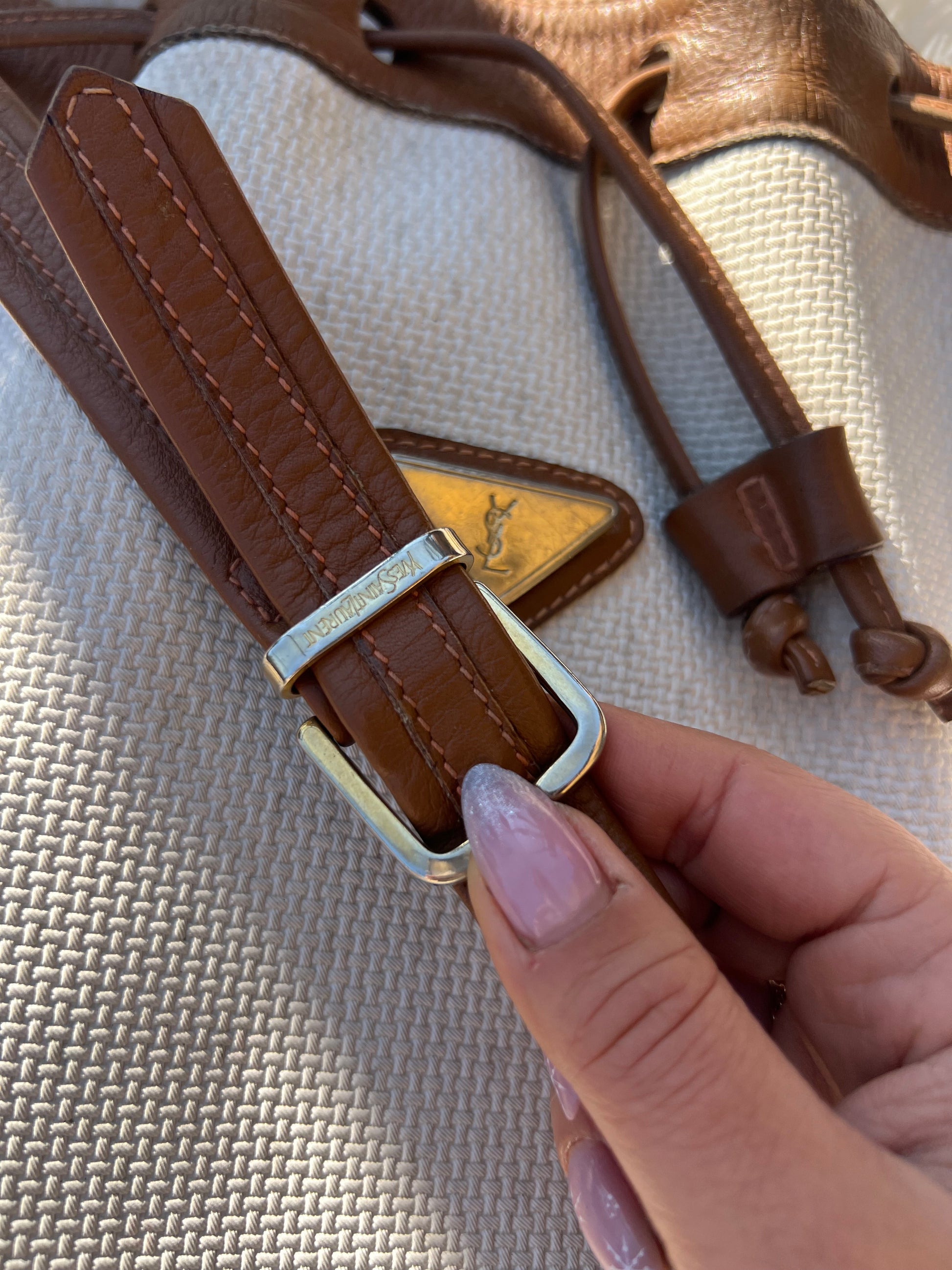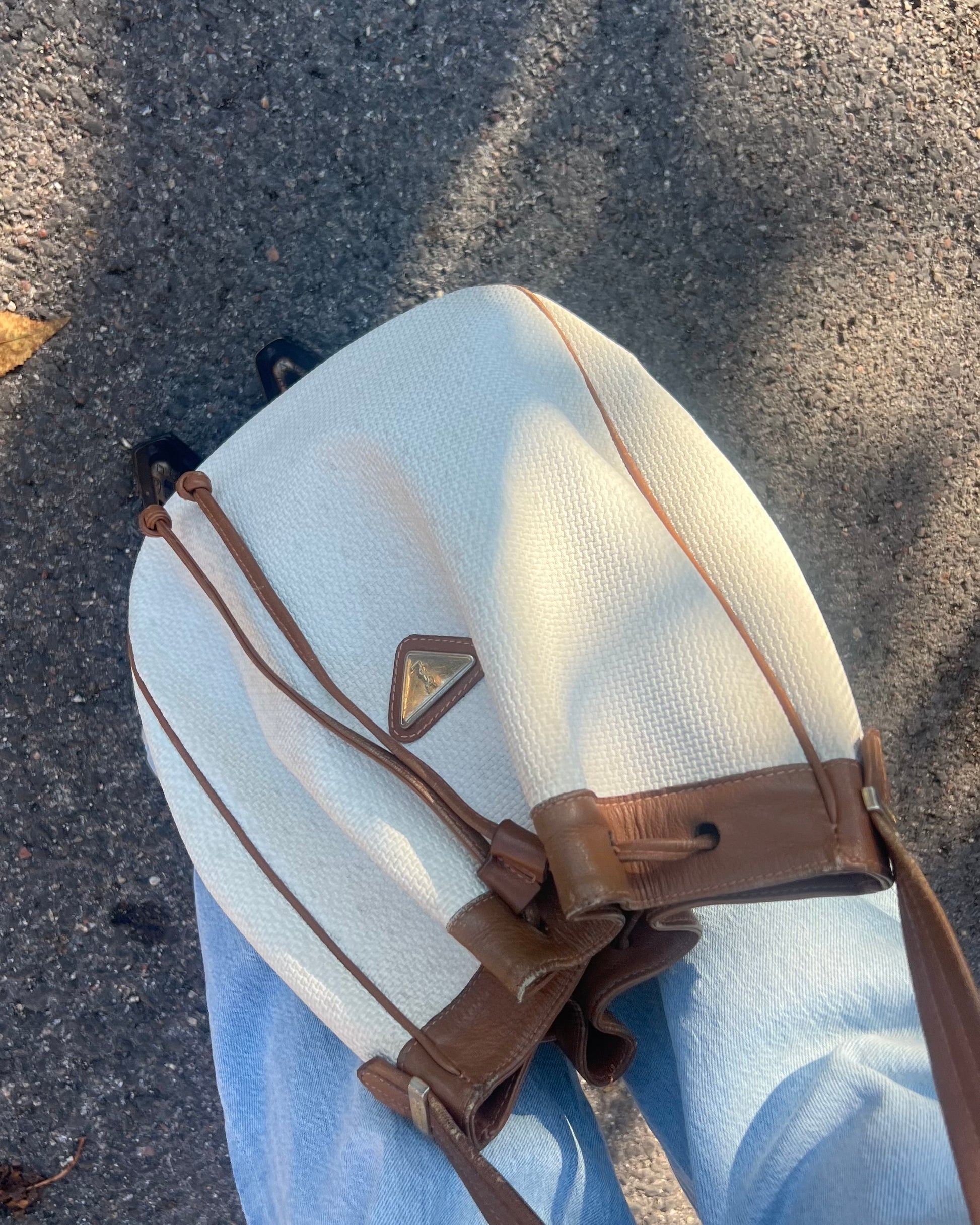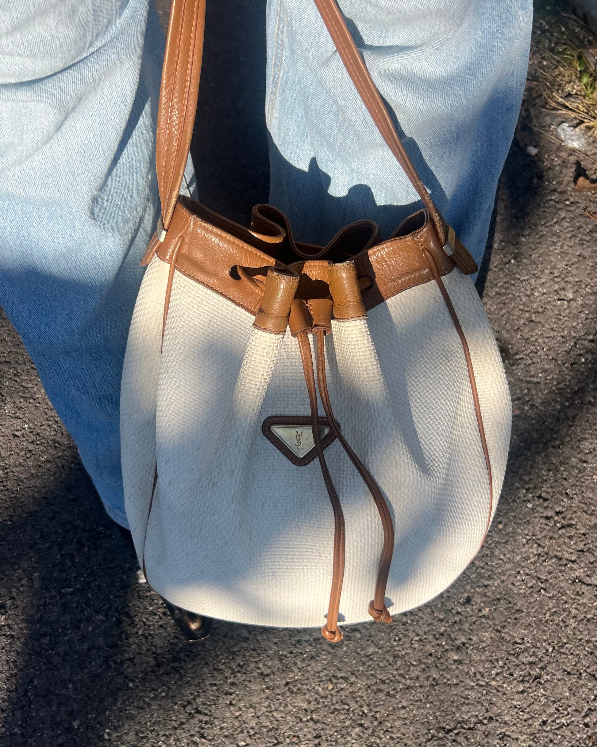 Raffinato e ricercato, questo secchiello Yves Saint Laurent Vintage è realizzato in canvas bianco con eleganti dettagli in pelle marroncino, arricchito da una metalleria dorata che aggiunge un tocco di lusso senza tempo. Il logo frontale applicato su metallo dona un carattere iconico e immediatamente riconoscibile.
