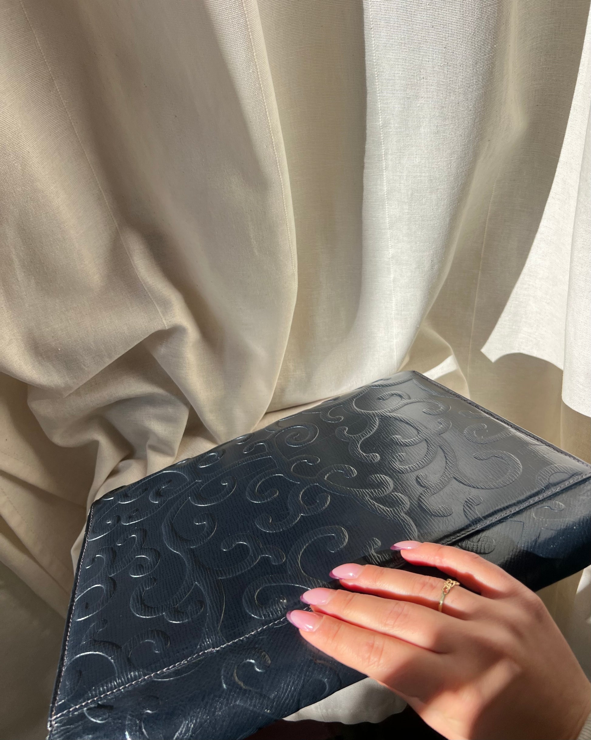 La pelle è impreziosita da una ricercata lavorazione floreale in rilievo, con dettagli che richiamano una fantasia cashmere, creando un effetto unico e sofisticato.