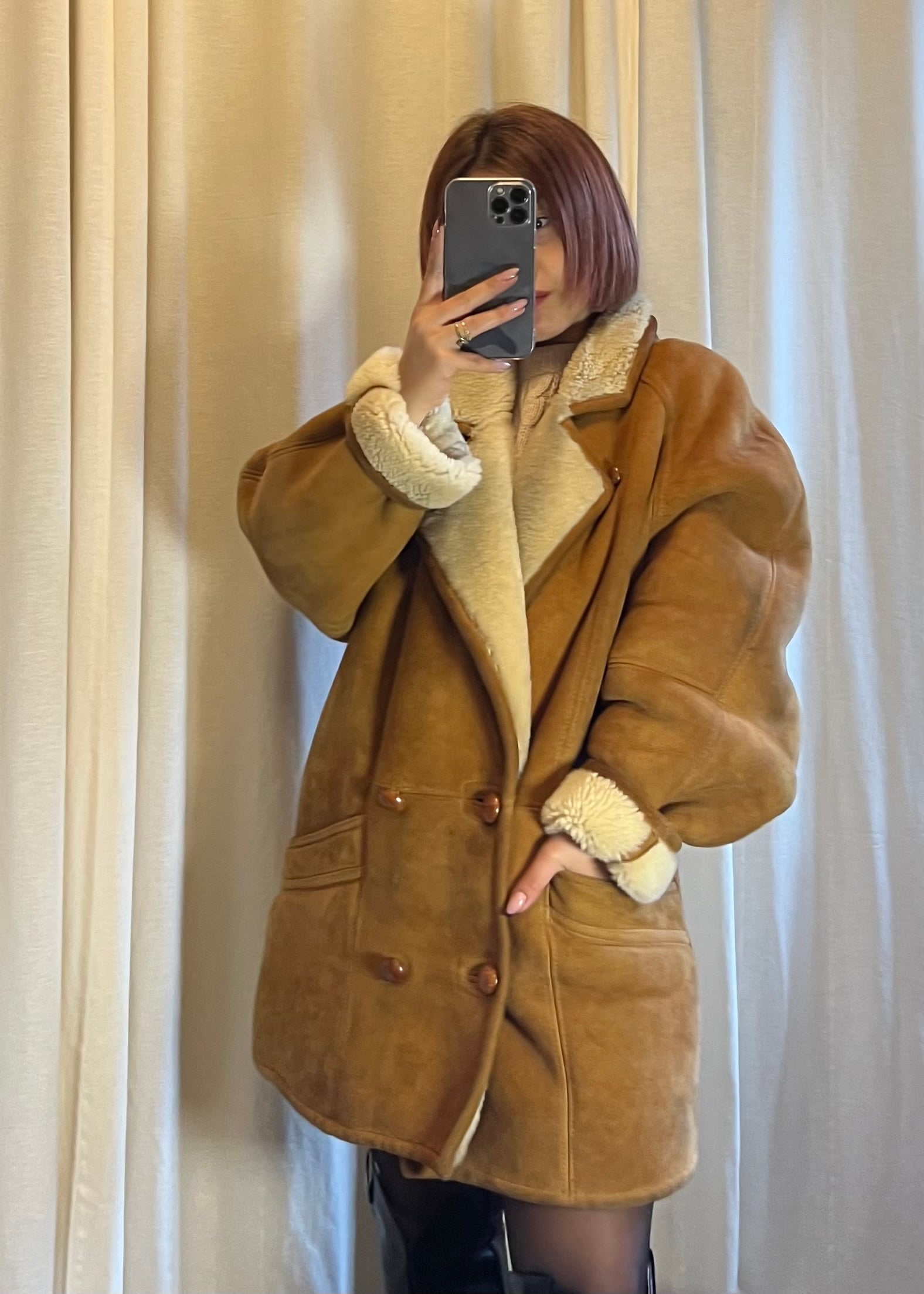 Giaccone Sherling vintage in pelle color miele, dal fascino caldo e avvolgente.