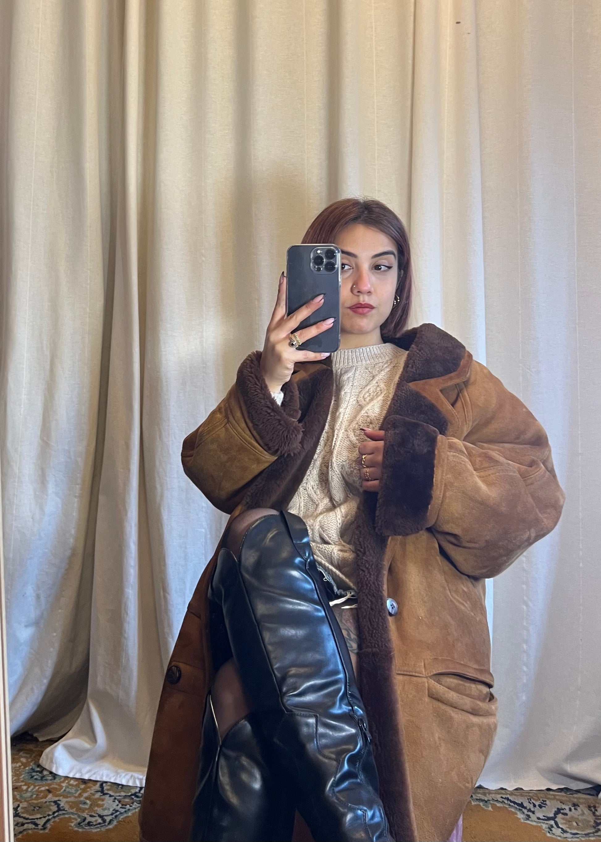 Giaccone modello Sherling in vera pelle, dal taglio elegante e avvolgente.