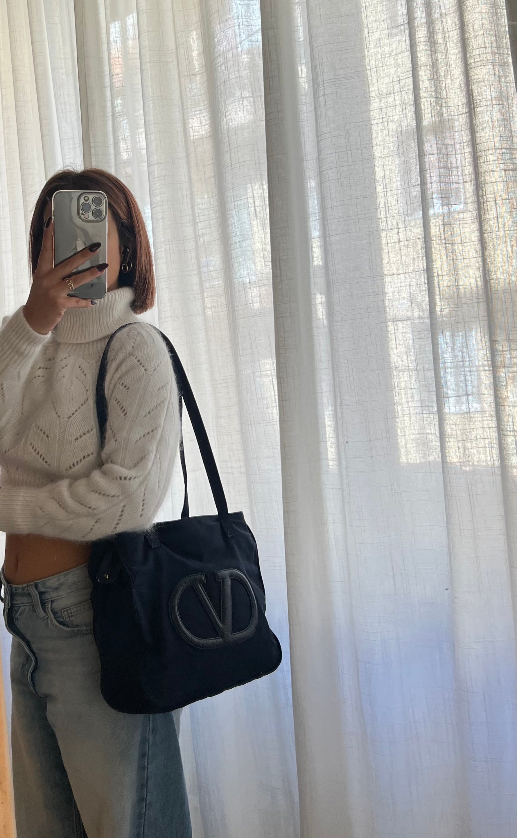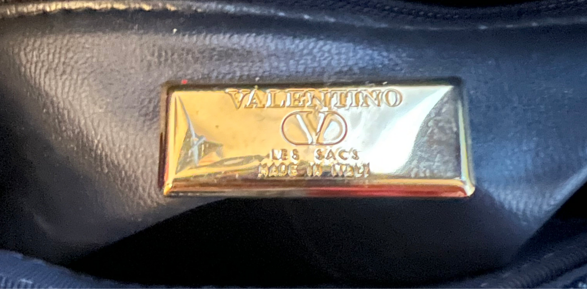 Elegante e funzionale, questa shopper Valentino Vintage in tonalità blu scuro è impreziosita da un maxi logo in pelle applicato sul frontale, dettaglio iconico della Maison.