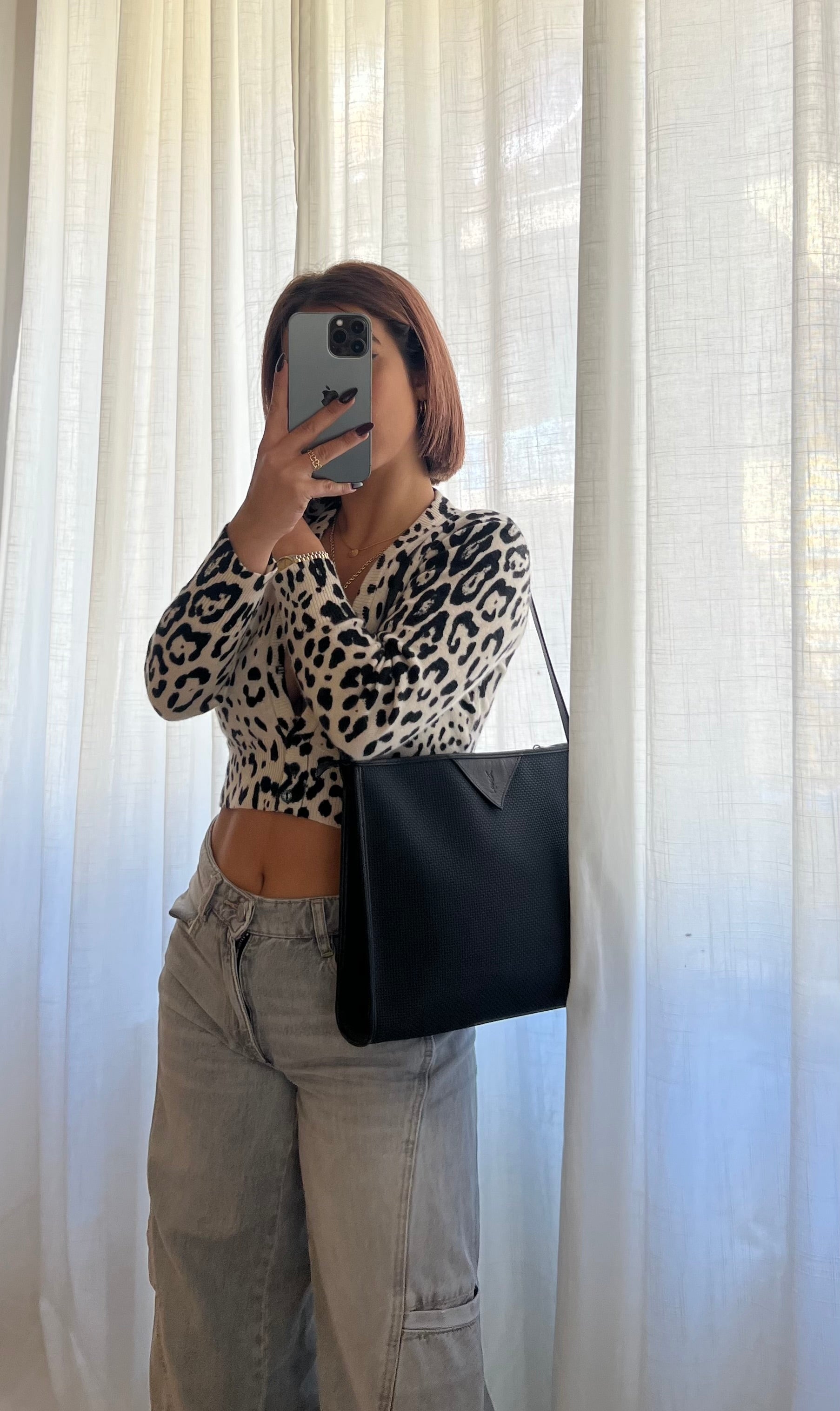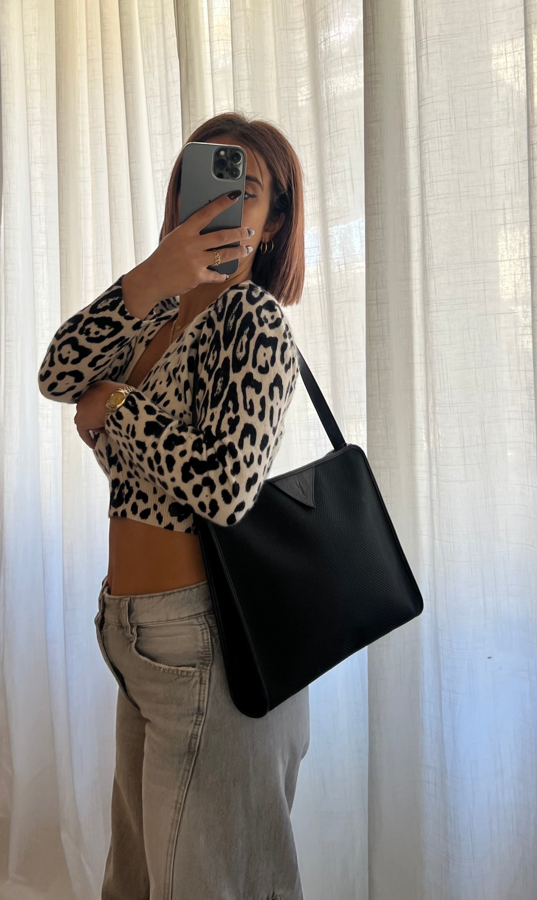 Realizzata in resistente canvas nero, è impreziosita da profili e manici in pelle nera che ne sottolineano la raffinatezza. Sul frontale spicca il logo YSL stampato su inserto in pelle, dettaglio iconico che la rende immediatamente riconoscibile.