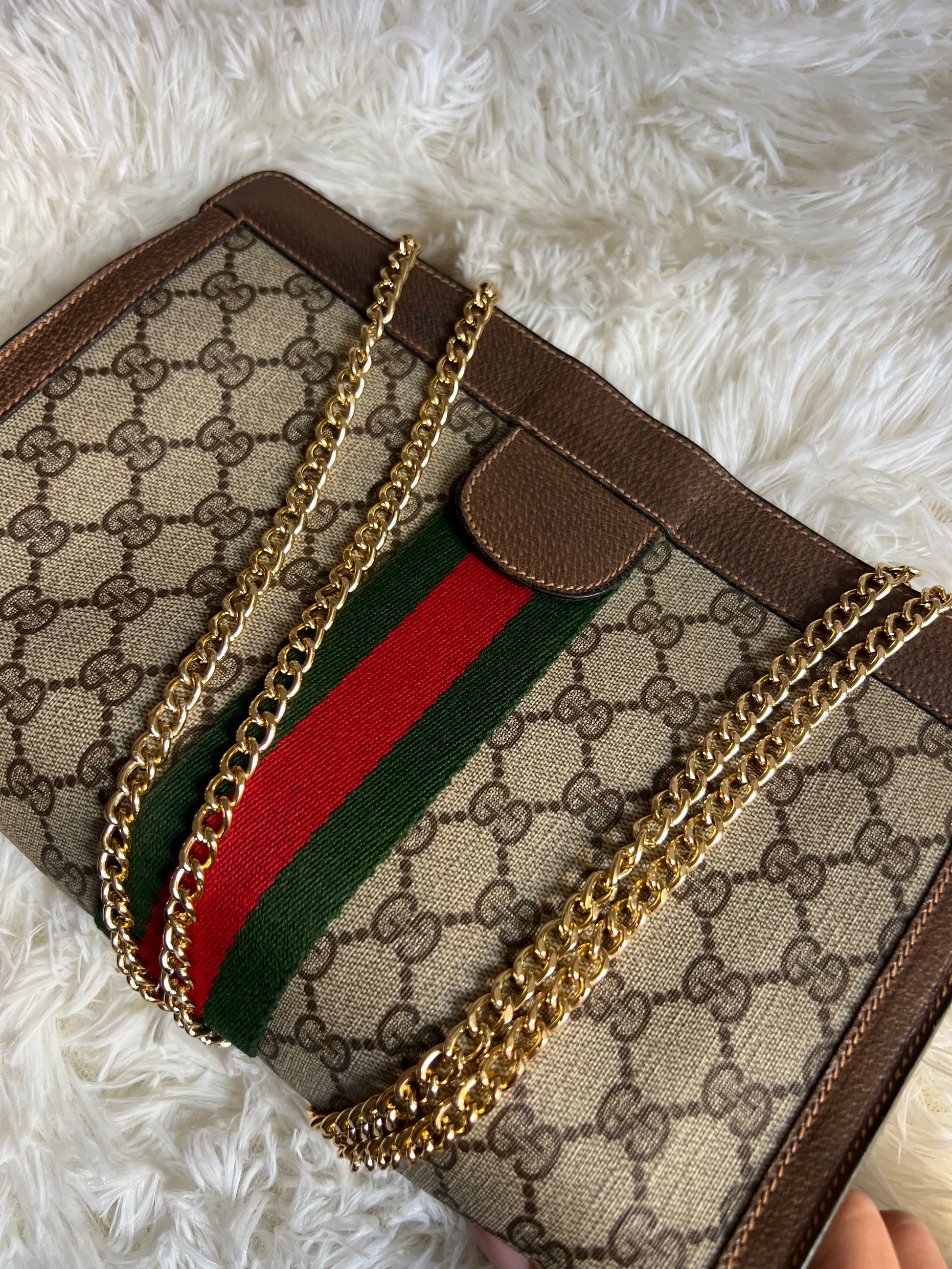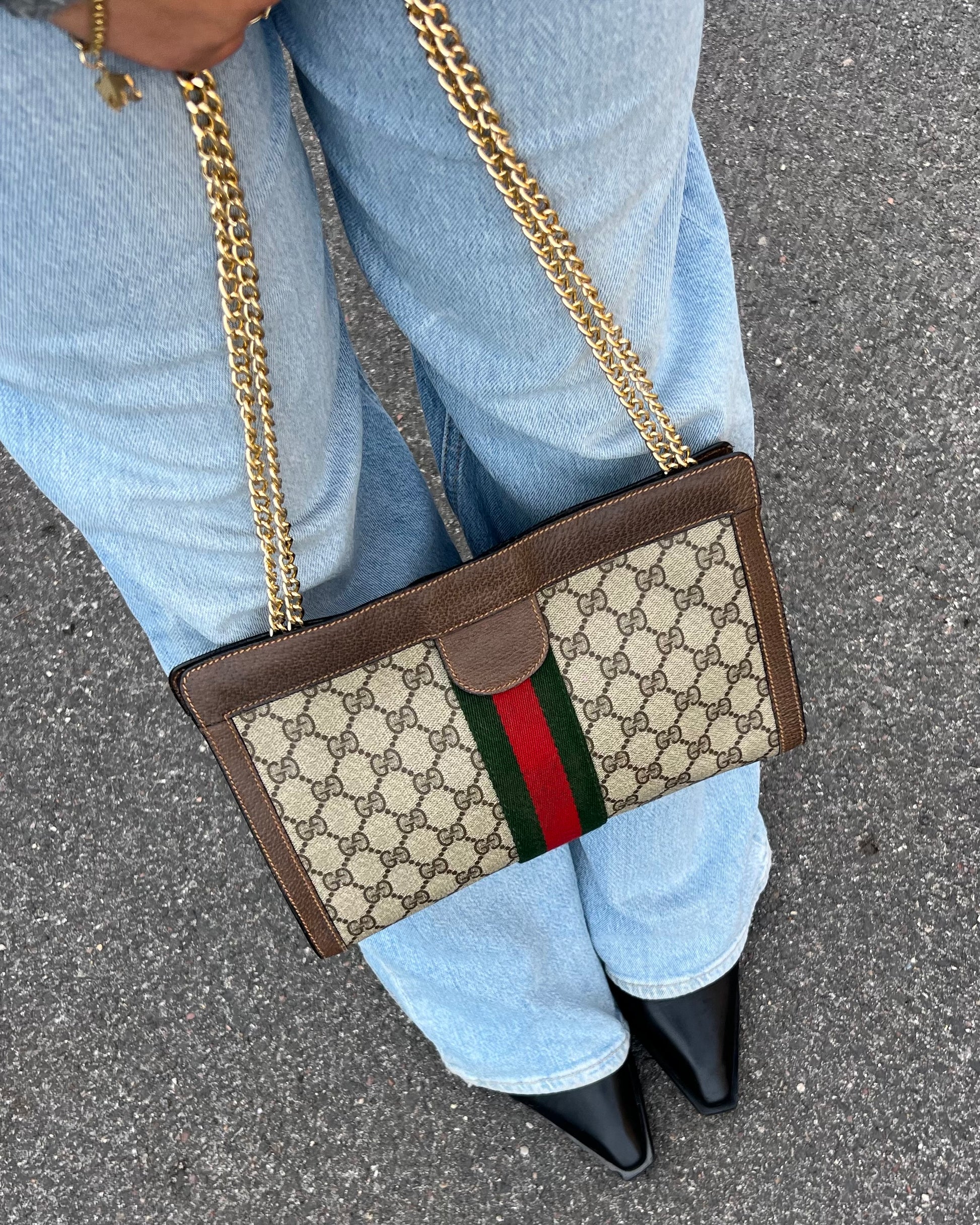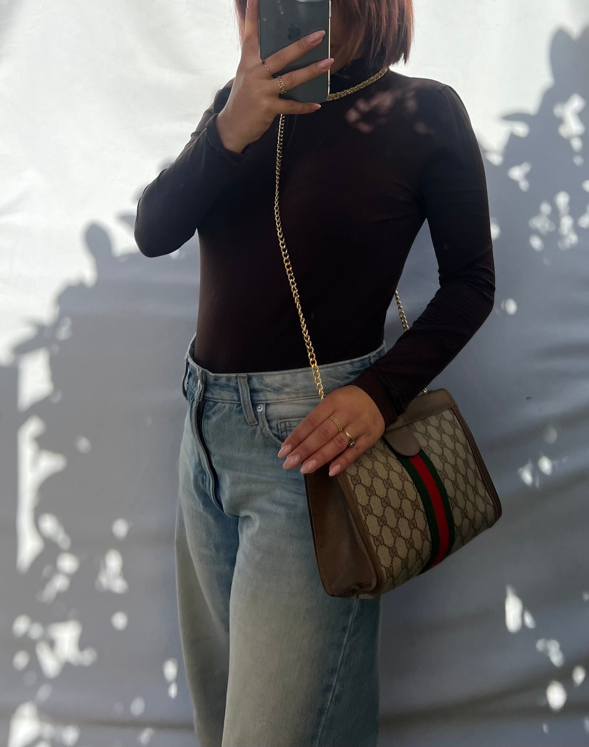 Elegante e senza tempo, questa borsa Gucci è realizzata in canvas monogram color miele con l’inconfondibile banda web verde e rossa al centro. L’apertura con strap conferisce praticità e stile, mentre la catena dorata permette di indossarla sia a spalla che a tracolla. Rimuovendo la catena, può essere utilizzata anche come pochette, rendendola estremamente versatile. Rifinita con profili in pelle martellata marrone in ottime condizioni, è un vero must-have per chi ama il fascino intramontabile della maison Gucci.