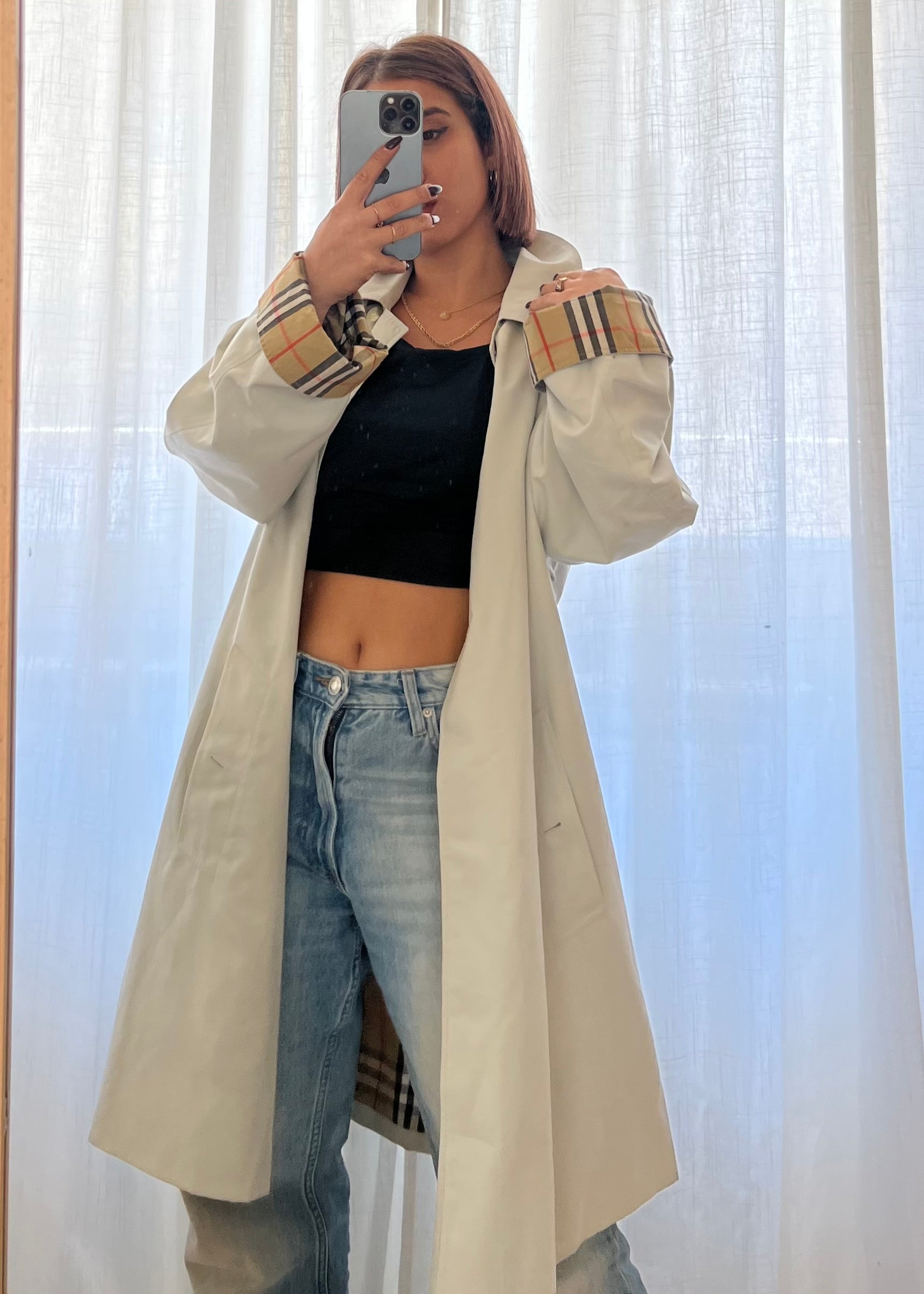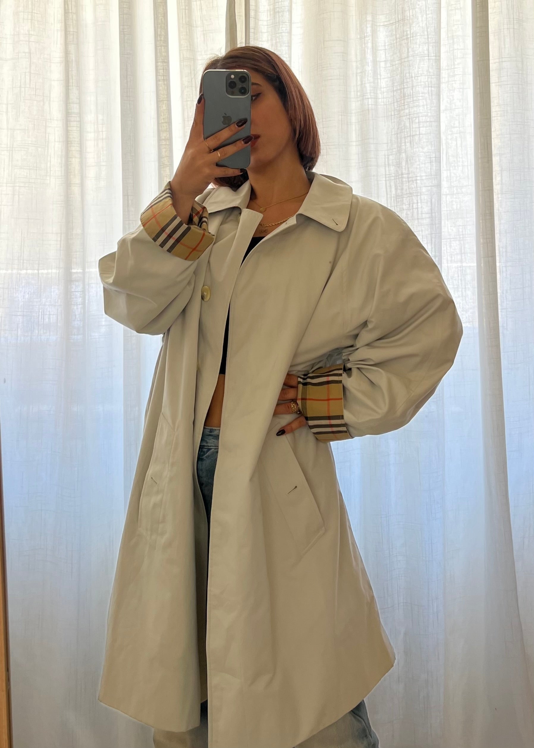 Un vero classico senza tempo, questo trench Burberry in beige freddo è arricchito da interno maniche e colletto in tessuto tartan check vintage, iconico della Maison. Il modello leggermente ampio è valorizzato dalla martingala sul retro, che conferisce struttura e stile al capo.
