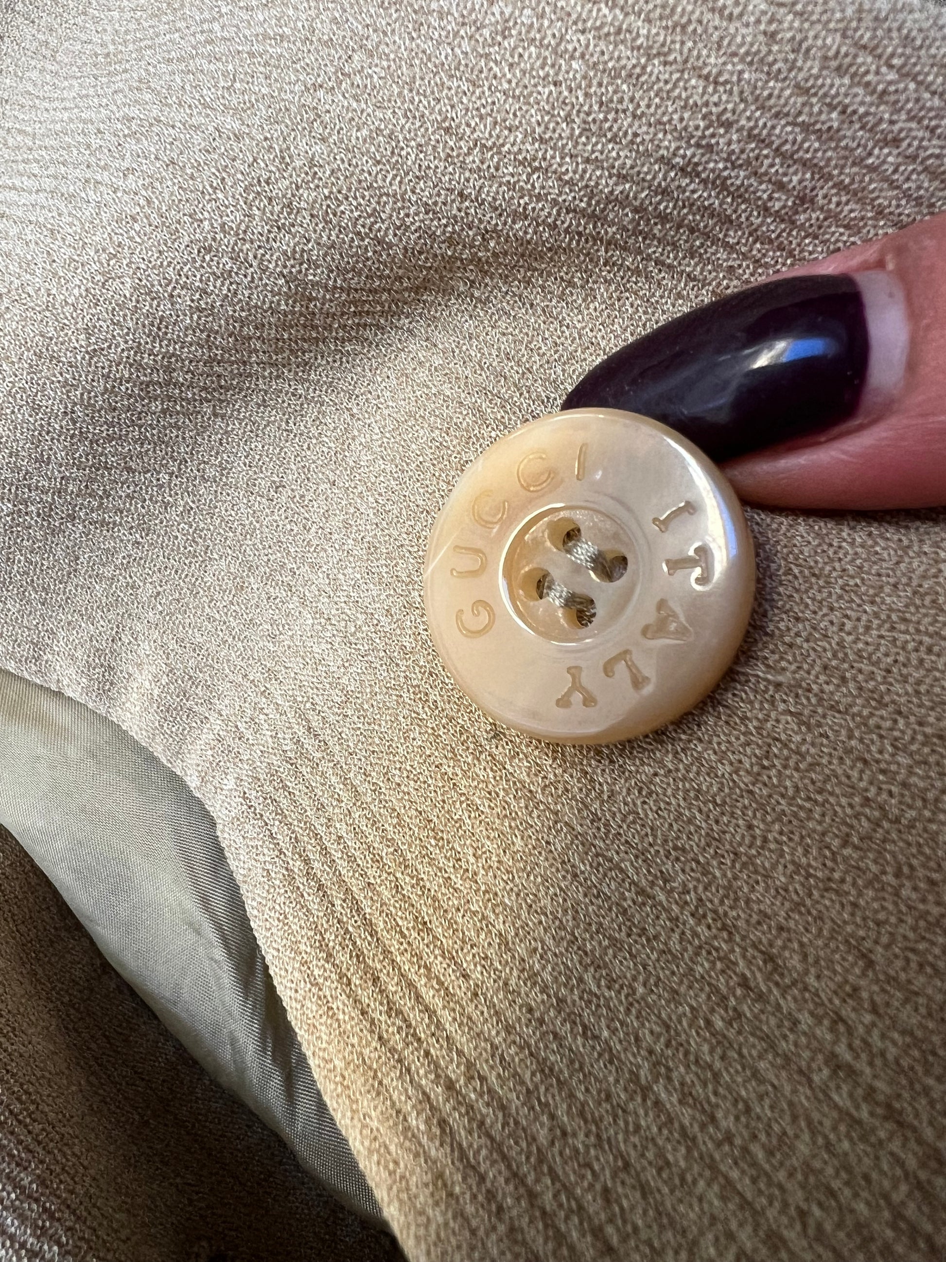 La chiusura frontale è impreziosita da bottoni in madreperla logati, dettaglio distintivo della Maison. In etichetta è riportata la taglia 48, ma come mostrato in foto veste bene anche su una S; si consiglia fino a una 44 piena / 46 scarsa.